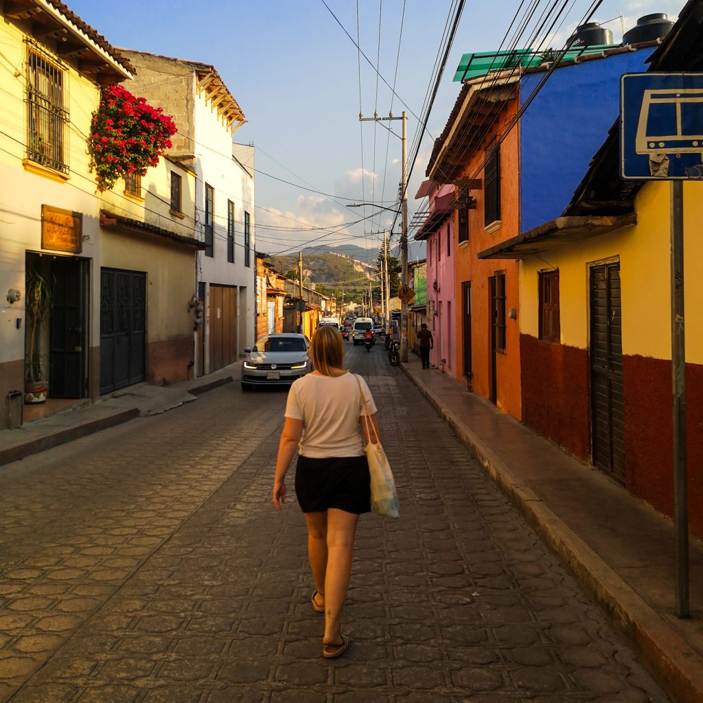 Der Salat sieht zu köstlich aus, aber wir trauen uns dennoch nicht ihn zu probieren. Das ist eigentlich nicht unsere Art, aber San Cristobal eilt sein Ruf voraus: Reisende, die hier waren, werden krank. Von allen Seiten hören wir vorher: Passt auf und trinkt ja kein Leitungswasser aus San Cristobal, seid vorsichtig mit dem Essen und mit Getränken an der Straße. Es ist verrückt, wir hören es wirklich von allen Seiten. Am Anfang denken wir uns noch: Gut, schlimmer als in Varanasi am Ganges wird es wohl nicht werden. Aber dann haben wir schnell Flashbacks von unseren langwidrigen Durchfallerkrankungen – nein danke, darauf haben wir jetzt so gar keine Lust! Also ist wirklich Vorsicht geboten. Wir waschen uns noch öfter die Hände, haben immer Desinfektionszeug dabei, putzen uns nur mit Trinkwasser die Zähne und kaufen auch keine Getränke mit Eis an der Straße. Naja und wir verzichten hier auf die Salatbeilage. Das tut uns im Endeffekt echt Leid, weil die Besitzerin etwas enttäuscht zu sein scheint. Wir versuchen uns noch zu erklären und bedanken und nach dem Bezahlen noch dreimal für das köstliche Essen.