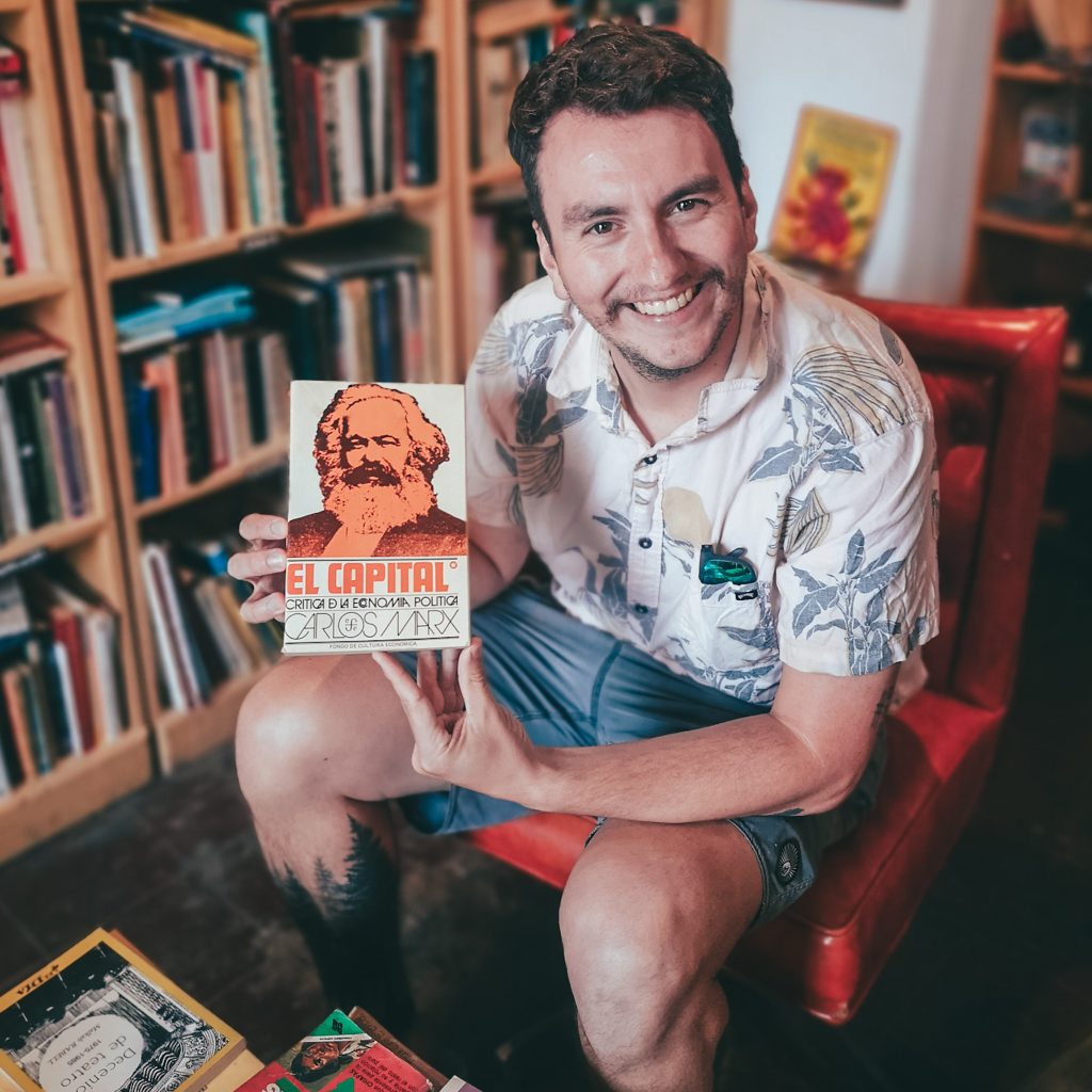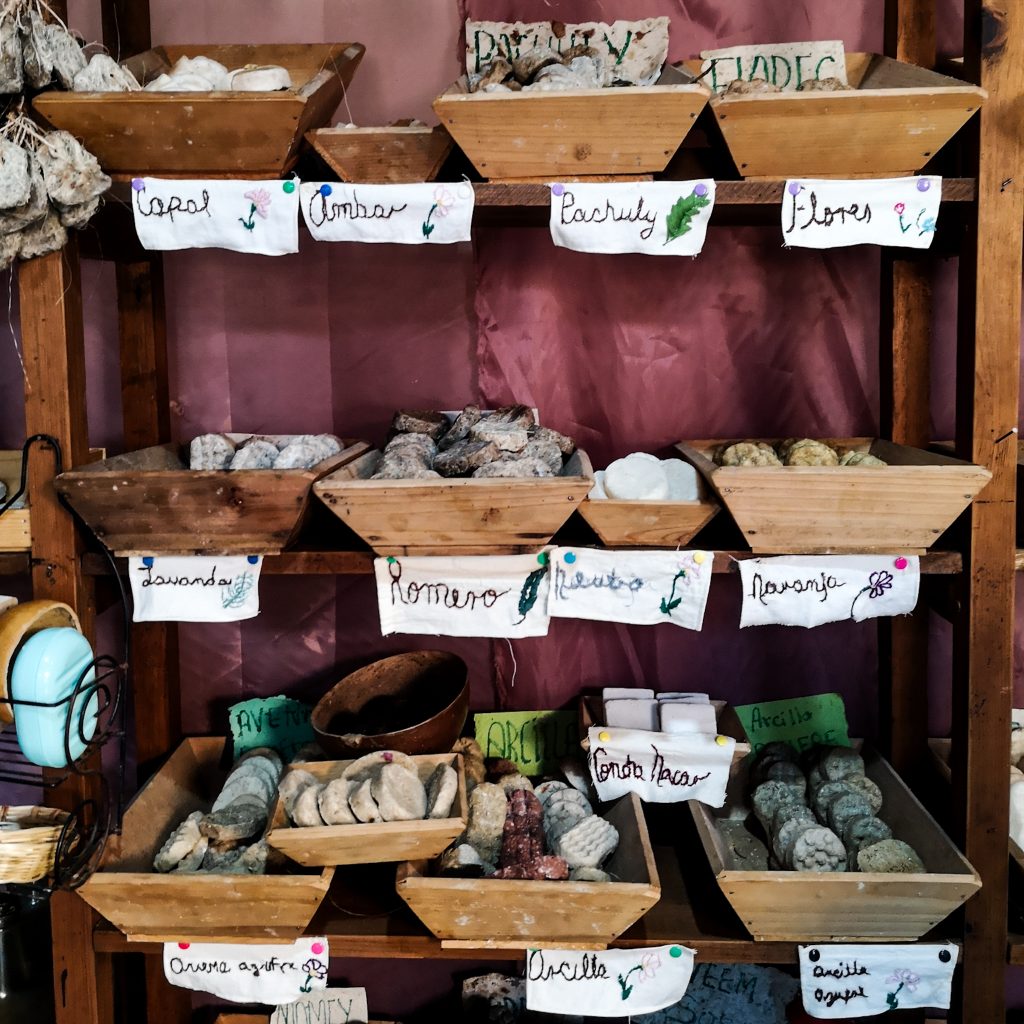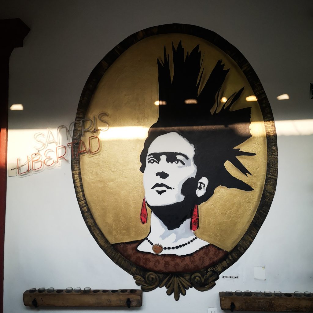 Dann ziehen wir weiter und bummeln ein bisschen. Durch die kleinen süßen Straßen mit den coolen Läden. Es gibt sogar einen Unverpacktladen in dem Sophia getrocknete Hibiskusblüten kauft. Sie duften schon im ganzen Raum als das Glas geöffnet wird. Tatsächlich ist es hier in Mexiko üblich, dass man die Blüten mit warmen Wasser aufgießt und anschließend (meistens gesüßt und gekühlt) trinkt. Das ganze nennt sich dann Jamaica, ein beliebtes Agua fresca. Wir sind ehrlicher Weise ziemlich verblüfft hier einen Unverpacktladen zu sehen, da sind wir glatt wieder bei unserem Vergleich mit Pai in Thailand. Wir schauen in einem kleinen Buchladen nach einem einfachen spanischen Buch für Sophia zum Spanisch lernen. Während sie sich beraten lässt, entdeckt Konsti „El Capital“ von CARLOS MARX, wer kennt ihn nicht..