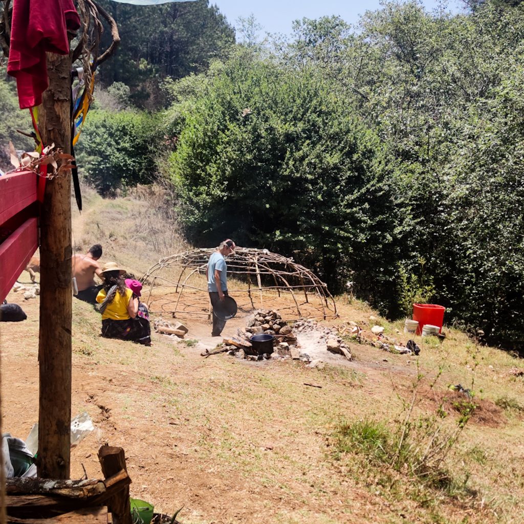Nicht viel ehrlich gesagt. Das Gelände ist leicht abschüssig, in der Mitte ist allerdings ein etwas breiterer Streifen, der begradigt ist. Unten ist ein Fluss. Auf der begradigten Fläche steht eine kleine Hütte, wir sehen zwei Feuerstellen und eine Art Ast-Gerüst, das die Form eines Iglus oder einer Halbkugel hat. Ist das etwas das Temazcal?