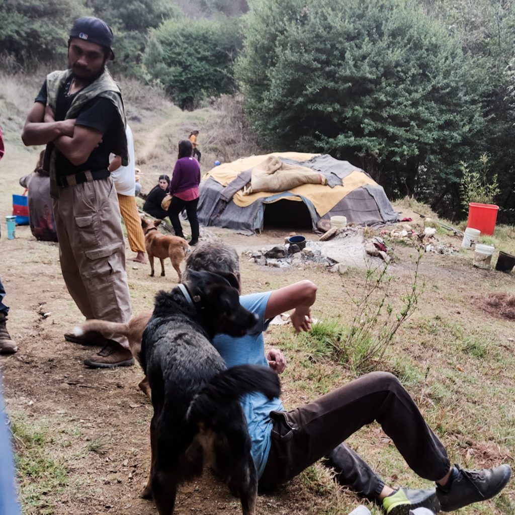 Während Konsti noch überlegt, ob es vielleicht nur der Parkplatz ist, klettert Caro durch das Loch und wird von drei Hunden begrüßt. Das ist doch erstmal nett. Wir folgen den Hunden entlang eines kleinen Trampelpfads und entdecken einen Mann, der gerade mit einem Feuer beschäftigt ist. Und was gibt es sonst noch zu sehen?