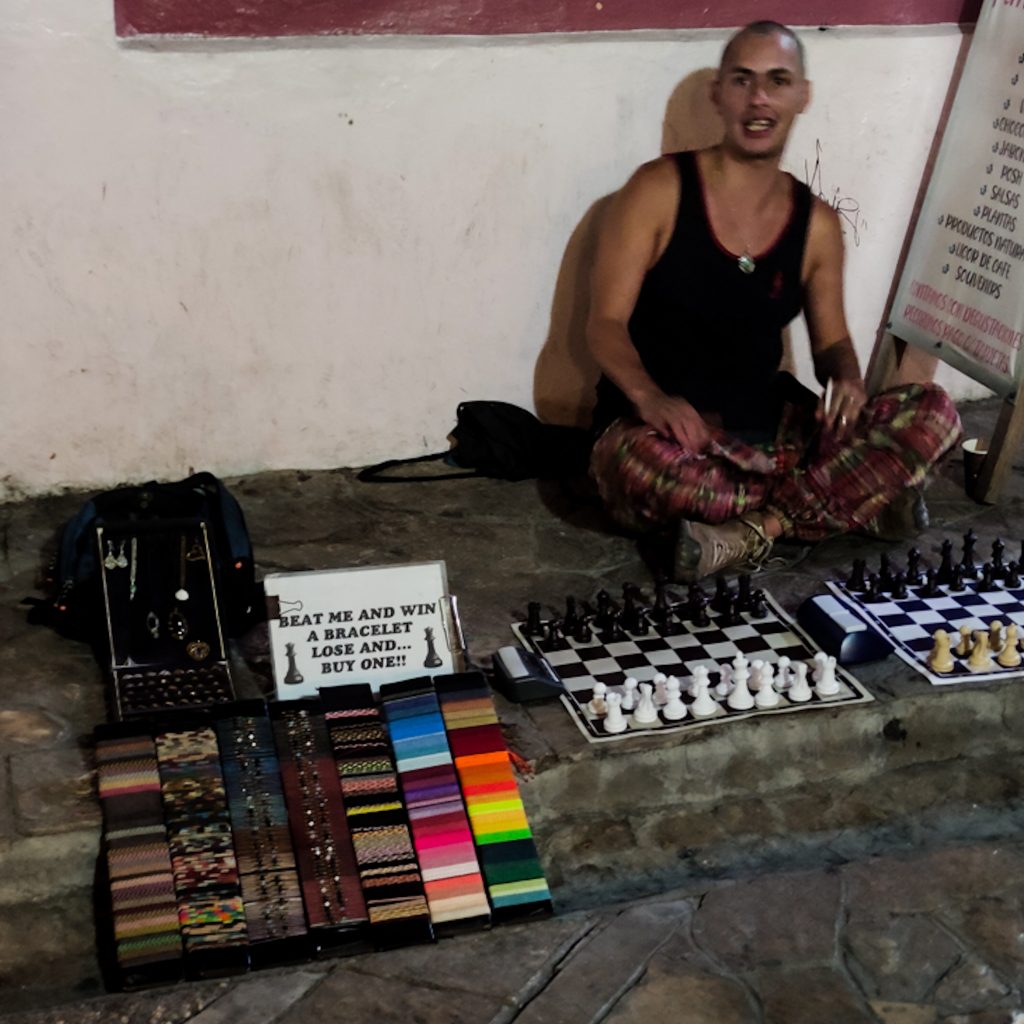 Jetzt schlendern wir erst einmal zurück ins Hostel, um morgen auch fit zu sein. Unterwegs sehen wir noch einen Verkäufer von Armbändern auf der Straße sitzen, der eine mega Salesstrategie hat: Man kann eine Partie Schach gegen ihn spielen. Wenn man gewinnt, schenkt er einem das Armband, das man möchte, wenn man verliert, muss man es eben wie üblich kaufen.