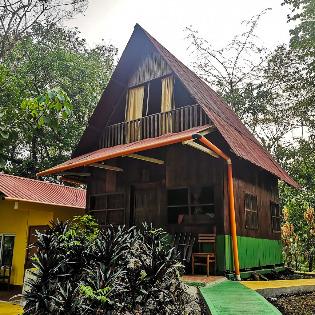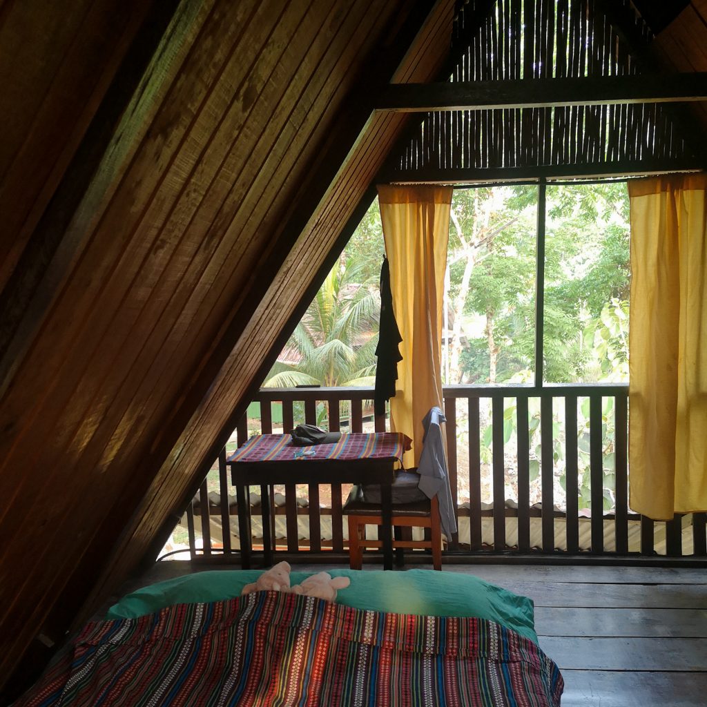Endlich kommen wir an. Es ist mittlerweile 20 Uhr und wir sind seit 13 Stunden unterwegs. Es ist so unfassbar heiß hier. Während der Fahrt ist uns noch ein angenehmer Luft um die Ohren geweht, aber hier steht die Hitze. Von einer nächtlichen Abkühlung ist nichts zu spüren. Der nette Herr am Anfang begrüßt uns freundlich, seine Kollegin zeigt uns das Zimmer. Auf dem Gelände stehen mehrere einfache Holzhäuschen. Im Erdgeschoss ist bei uns ein kleiner Dorm, unser Zimmer liegt darüber. Über eine schmale, steile Holztreppe geht es außen am Haus nach oben. Die Dame öffnet die Tür und da stehen wir in unserem Zimmerchen. Ein Bett, ein Tisch und ein Stuhl. Soweit so gut. Was man eben so braucht. Was allerdings fehlt, ist ein Fenster. Die Türseite ist mit Holz verkleidet, gegenüber befindet sich allerdings nur ein Holzgeländer, dass bis zur Hüfte reicht. Wir schlafen also die kommenden beiden Nächte mit offener Front. Das hatten wir in dieser Form auch noch nicht. Aber während wir so drüber nachdenken ist es vielleicht gar nicht schlecht. Da es in der Unterkunft nur mittags eine Stunde und abends drei Stunden Strom gibt. Dementsprechend gibt es also keinen Ventilator, vielleicht tut also etwas Durchzug gut? Wir werden sehen. Gegen Mücken müssen wir uns sowieso gut einsprühen.