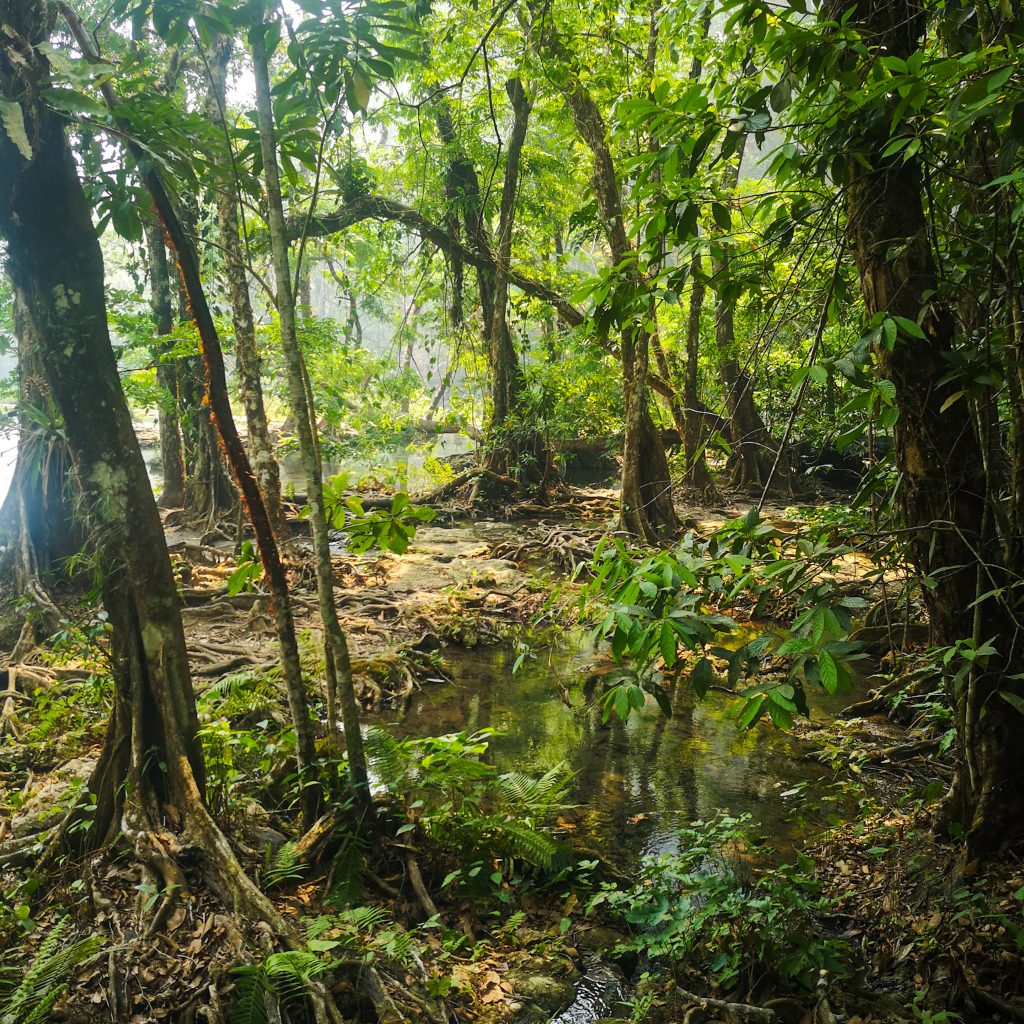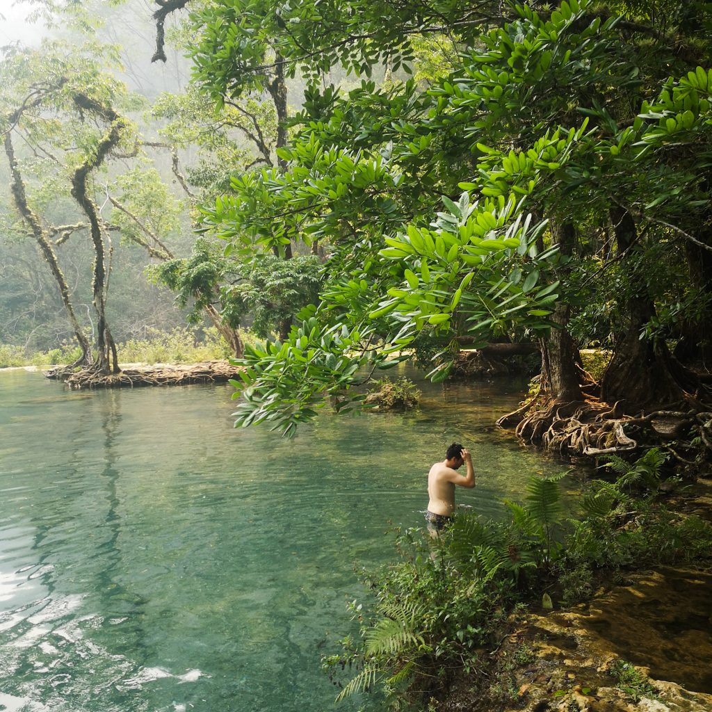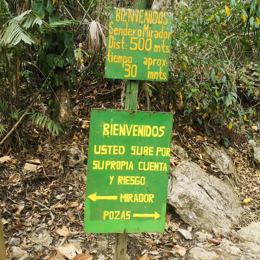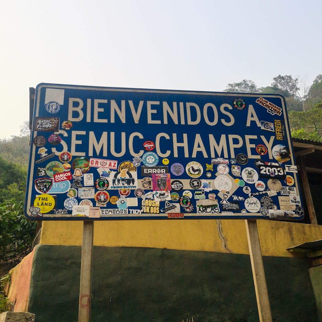 Genau das bedeutet nämlich Semuc Champey übersetzt. Dann begeben wir uns mal auf die Suche. Das Naturschutzgebiet öffnet erst um 8 Uhr. Wir wollen so früh wie möglich los, um der Hitze weitestgehend aus dem Weg zu gehen (haha). Jedenfalls stehen wir pünktlich wie die Maurer um kurz vor 8 Uhr am Eingang. Gefrühstückt haben wir (pssst) wieder in unserem Zimmer: Müsli mit Obst und nem kleinen Paket H-Milch. Von der Unterkunft ist es tatsächlich nur einen Katzensprung bis zum Eingang und mit uns startet lediglich eine Familie. Das Wasser ist auch nicht allzu schwer zu finden.