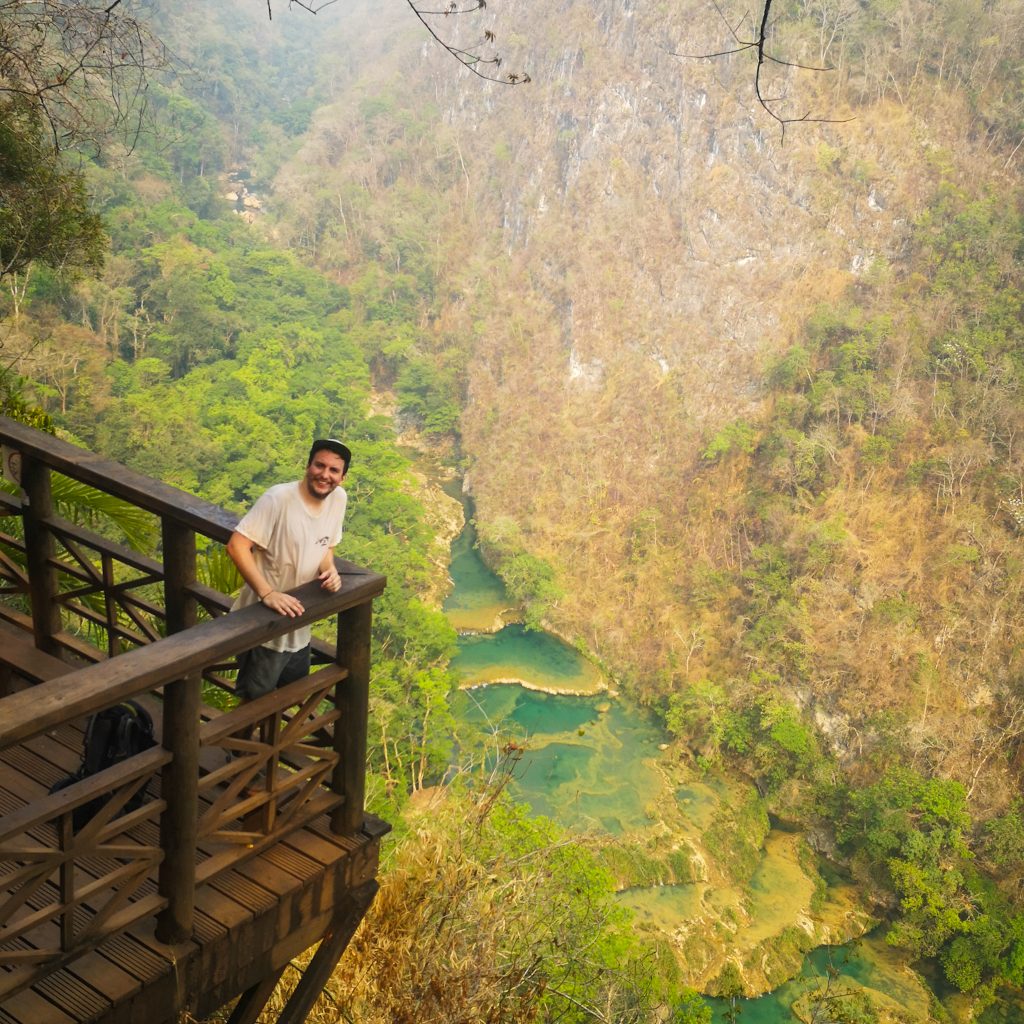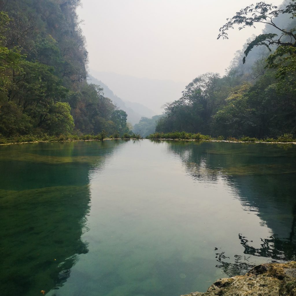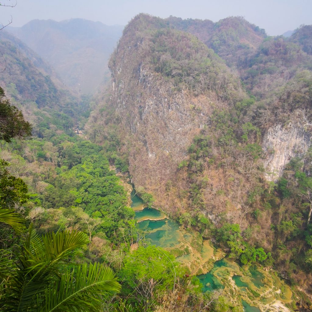 Von einer kleinen Aussichtsplattform haben wir eine wirklich sehr sehr schöne Aussicht. Worauf eigentlich? Auf den Fluss „Cahabón“, der sich im Tal entlang schlängelt und dessen Wasser sich in vielen türkisfarbenen Wasserbecken von einem bis drei Metern Tiefe staut. Die Farbe des Wassers variiert ja nach Jahres- und Tageszeit sowie dem aktuellen Wetter. 1999 wurde Semuc Champey vom damaligen Presidenten Álvaro Arzú Irigoyen zum guatemaltekischen Naturerbe erklärt. Bei uns ist das Wetter semi gut. Es ist etwas diesig und der Himmel ist etwas bewölkt. Aber nicht schlimm, solange wir die Wasserbecken überhaupt von hier oben sehen, sind wir schon mehr als glücklich. Uns erinnert der Ausblick auch ein bisschen an die Plitvicer Seen in Kroatien.