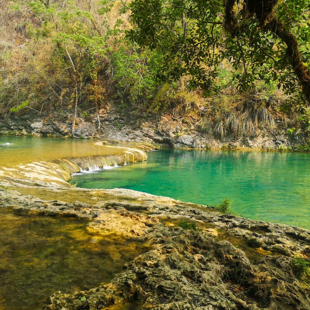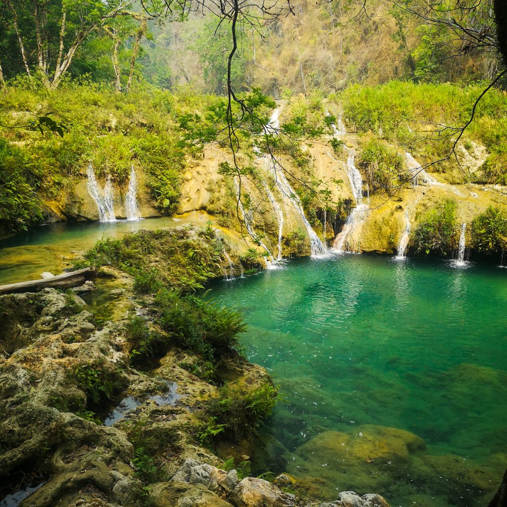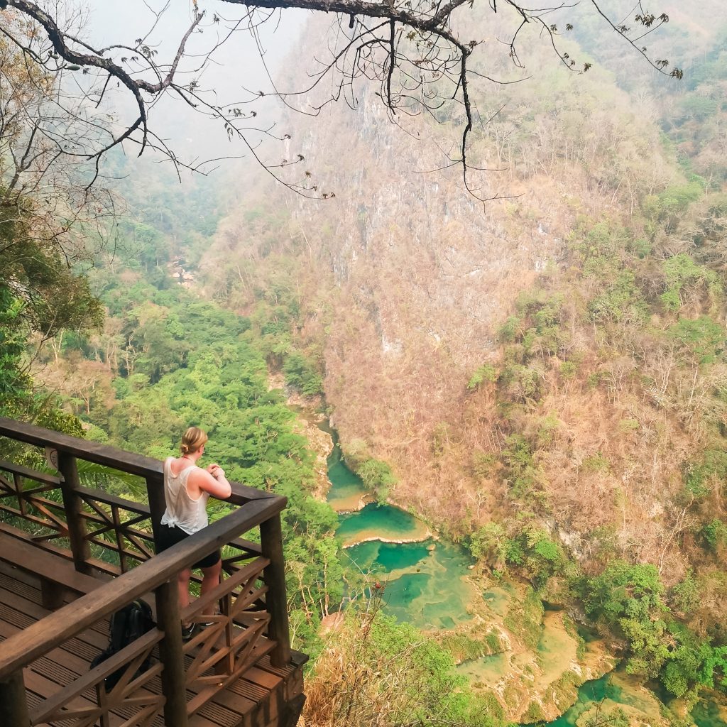 Von einer kleinen Aussichtsplattform haben wir eine wirklich sehr sehr schöne Aussicht. Worauf eigentlich? Auf den Fluss „Cahabón“, der sich im Tal entlang schlängelt und dessen Wasser sich in vielen türkisfarbenen Wasserbecken von einem bis drei Metern Tiefe staut. Die Farbe des Wassers variiert ja nach Jahres- und Tageszeit sowie dem aktuellen Wetter. 1999 wurde Semuc Champey vom damaligen Presidenten Álvaro Arzú Irigoyen zum guatemaltekischen Naturerbe erklärt. Bei uns ist das Wetter semi gut. Es ist etwas diesig und der Himmel ist etwas bewölkt. Aber nicht schlimm, solange wir die Wasserbecken überhaupt von hier oben sehen, sind wir schon mehr als glücklich. Uns erinnert der Ausblick auch ein bisschen an die Plitvicer Seen in Kroatien.
