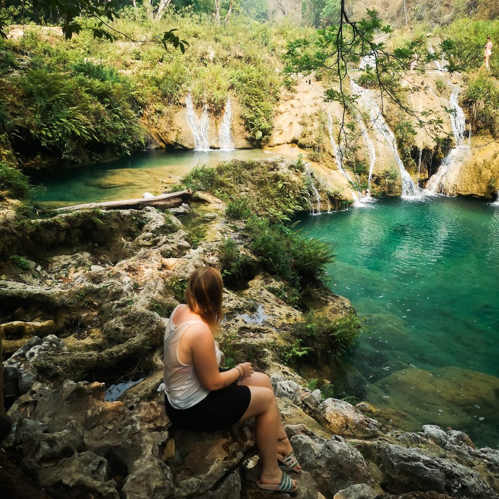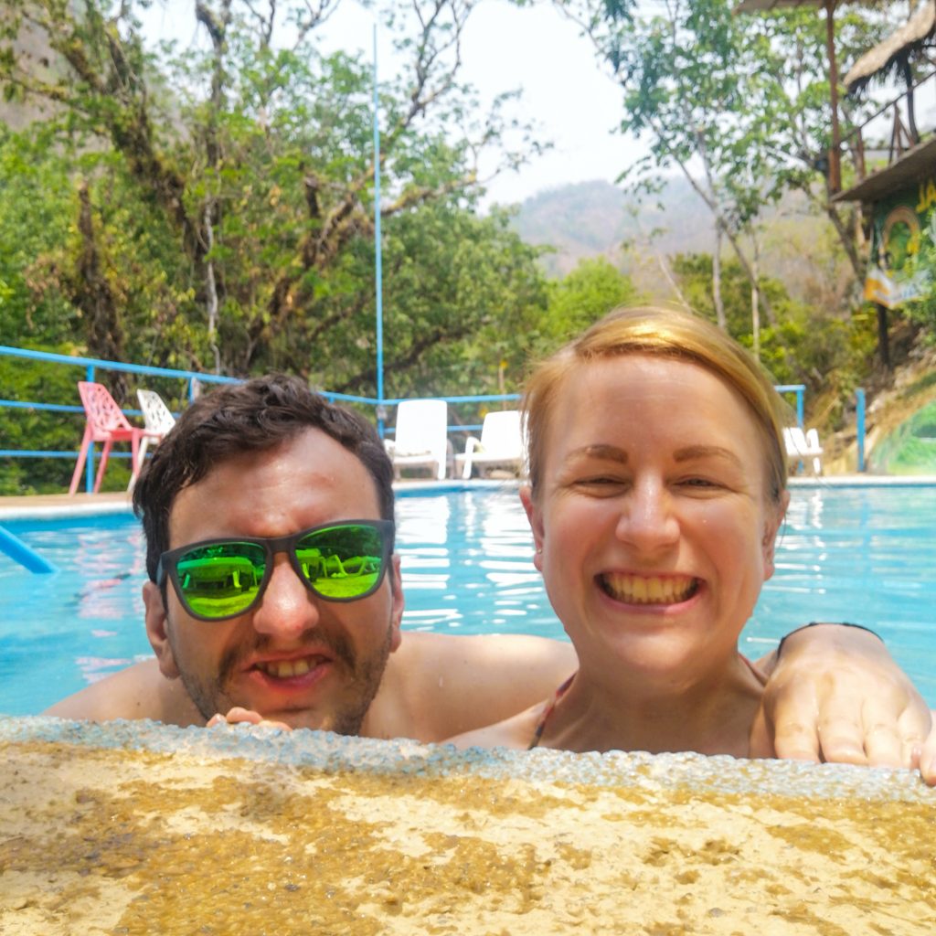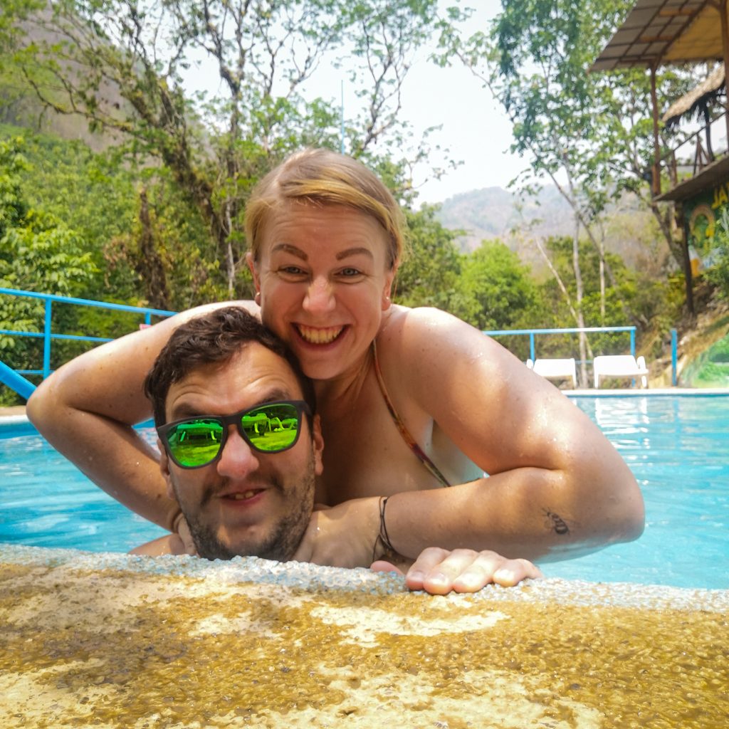 Unten am Wasser baden schon ein paar Familien, alle scheinen Locals zu sein. Zumindest ist das unser Eindruck. Wir gesellen uns dazu und sind froh, dass noch nicht allzu viel los ist. Wir haben zwar bereits zuvor davon gelesen, sind aber dennoch kurz überrascht. Die kleinen Fischchen, die sich hier überall im Wasser herumtreiben, scheinen einen kleinen Fuß-Fetisch zu haben. Sie knabbern tatsächlich an den Füßen. Wir können uns noch nicht ganz entscheiden, wie wir das finden. Wir bleiben lieber ein bisschen in Bewegung oder sagen wir Konsti bleibt in Bewegung, während Caro sich an ihn klammert und ihr Füße schützend nach oben hält. Wir verweilen eine ganze Weile im Wasser, Konsti klettert noch in die nächste Poolebene und dann wird es langsam voller. Zwar dürfte dies hier der erfrischendste Ort weit und breit sein, aber ewig kann man nun mal auch nicht im Wasser bleiben. Wir spazieren also ganz entspannt zurück in die Unterkunft und hüpfen dort in den Pool.