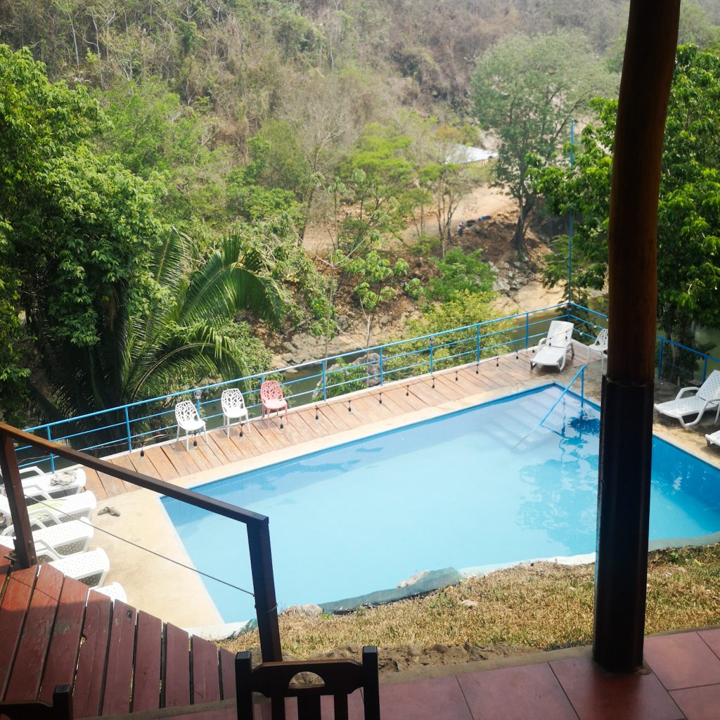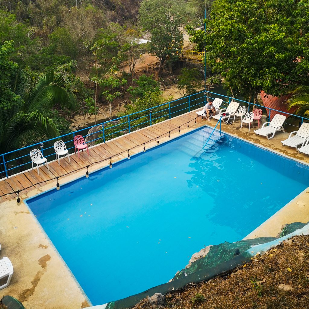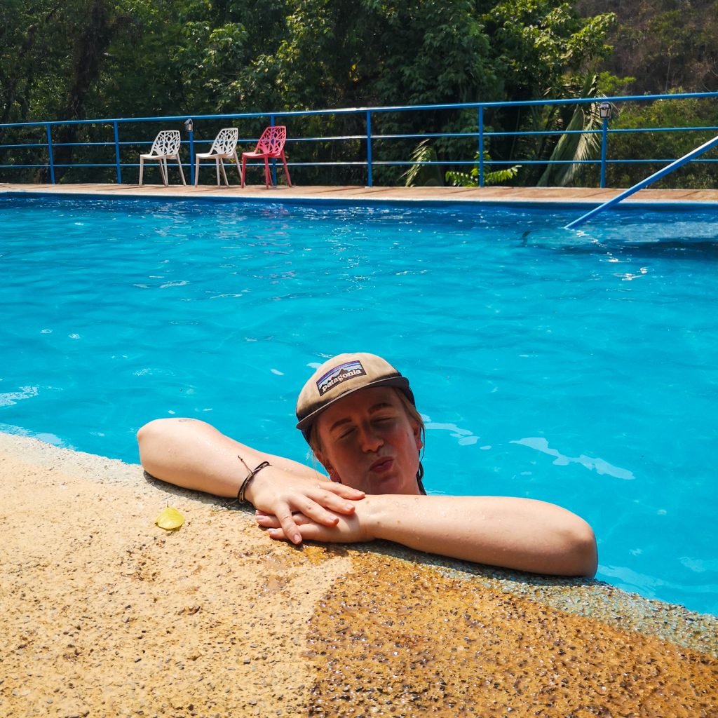 Es ist noch Vormittag und wir haben noch den ganzen restlichen Tag Zeit. Viel zu erleben gibt es hier ansonsten nicht, also beschließen wir zwischen Pool und Terrasse hin und her zu wechseln. Wir müssen unsere Weiterreise noch planen, zwischendurch hüpfen wir immer wieder in den warmen Pool. Besser als nichts.