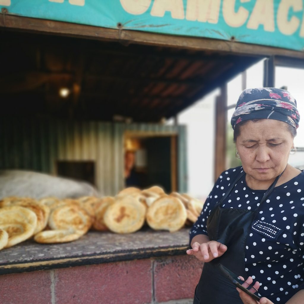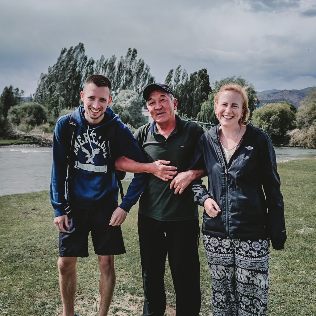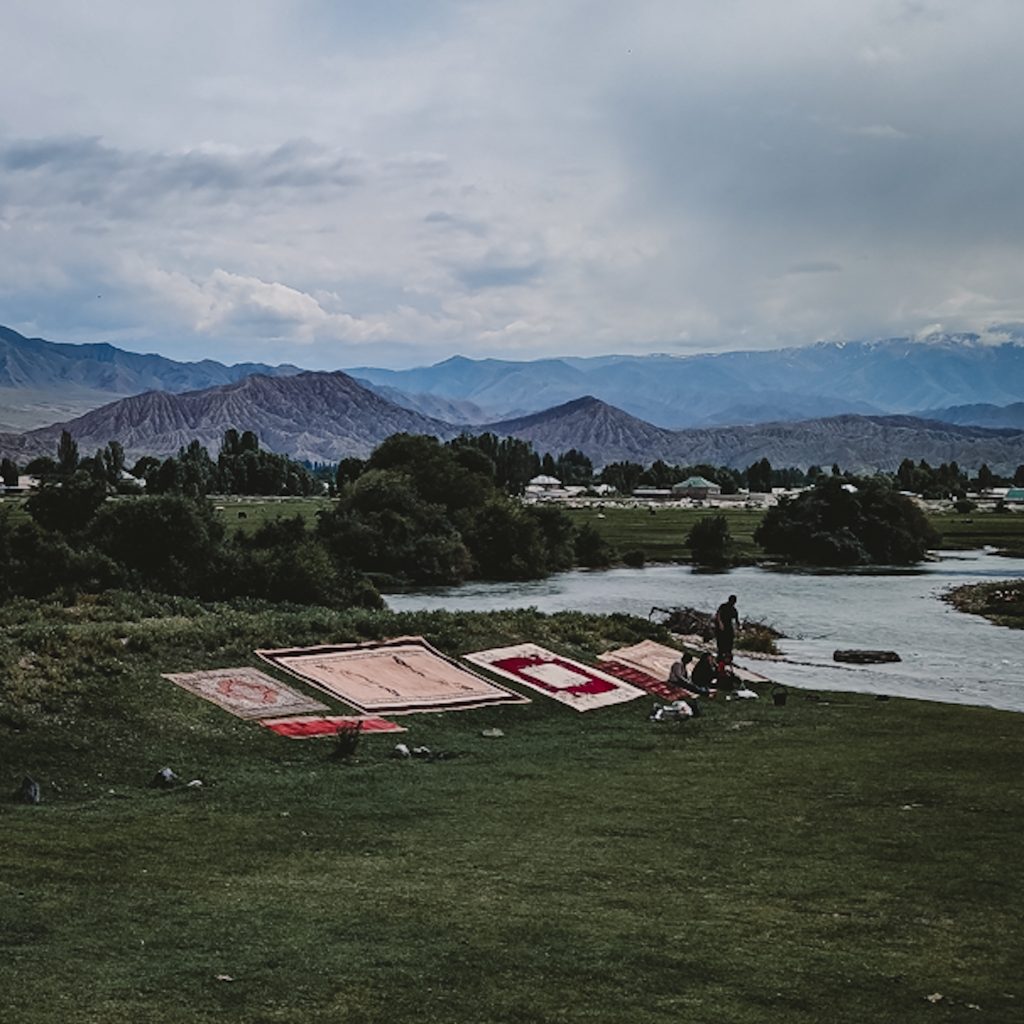 Da wir früh dran sind, erkunden wir noch etwas Kotschkor bzw. die nähere Umgebung. Am Fluss treffen wir vier Kirgis:innen, die Teppiche auf der Wiese reinigen. Einer ist betrunkener als der andere, wir machen ein paar Fotos, unterhalten uns kurz (so gut das eben von der Sprachbarriere abgesehen noch geht) und decken uns dann an den Straßenständen und in einem Minimarkt mit Proviant für die nächsten Tage ein.
