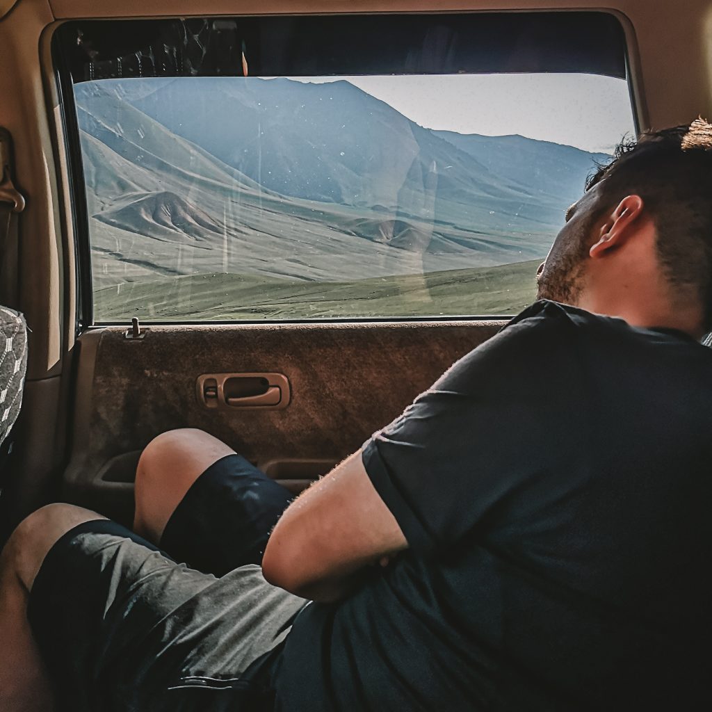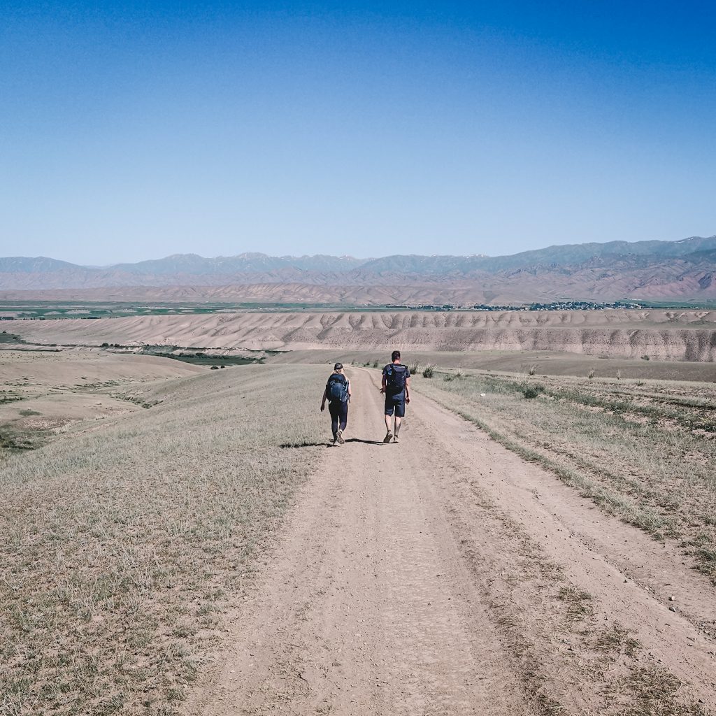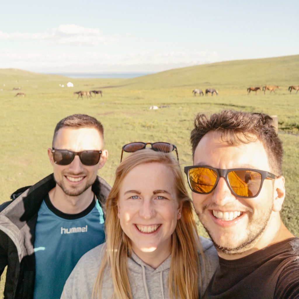 Als wir ein paar Autos sichten, halten wir diese an. Leider fährt keiner nach Kotschkor. Ein Mann bietet uns eine Taxifahrt für ungerechnet 30 Euro an, das ist uns zu teuer. Ob hier eine Marschrutka kommt? Das weiß angeblich keiner. Wir beschließen 10 Minuten weiter zur Hauptstraße zu laufen. Vielleicht kommen wir hier weiter. Viel passiert erstmal nicht, uns fällt allerdings ein Auto auf, dass offensichtlich eine Touristin nach Kyzart fährt. Keine 10 Minuten später hält das Auto (jetzt ohne Touristin) neben uns. Der gut gelaunte Fahrer lässt mit sich verhandeln und nimmt uns für 15 Euro mit nach Kotschkor. Wahrscheinlich wäre er sonst ohnehin leer wieder nach Kotschkor gefahren und nimmt so noch etwas Geld mit. Für uns kommt er allerdings genau zum richtigen Zeitpunkt. Schließlich wollen wir heute noch von Kotschkor weiter nach Bischkek fahren. Mit einem freundlichen „Okay, let’s go“ deutet er uns, einzusteigen. Als wir unsere Sachen einladen und er erfragt hat, dass wir aus Deutschland sind, schmettert uns noch fröhlich einen Gruß entgegen, der in Deutschland eher so zwischen 1933 und 1945 in gewesen ist. Passiert uns nicht zum ersten Mal, ist aber trotzdem weird. Musikalisch sind wir wesentlich mehr auf einer Wellenlänge. Bei „Money for nothing“ von den Dire Straits ist Konsti sofort begeistert. Beide singen lautstark mit. Darauf folgt Destiny’s Child, eine lustige Mischung. Als er dann noch erklärt, dass er gerne I-Love-you-Rock hört, sind wir wieder bei bester Laune. Die Stimmung ist gut, dennoch sind wir etwas müde. Caro und Jonas nutzen die Fahrt für ein kleines Mittagsschläfchen.