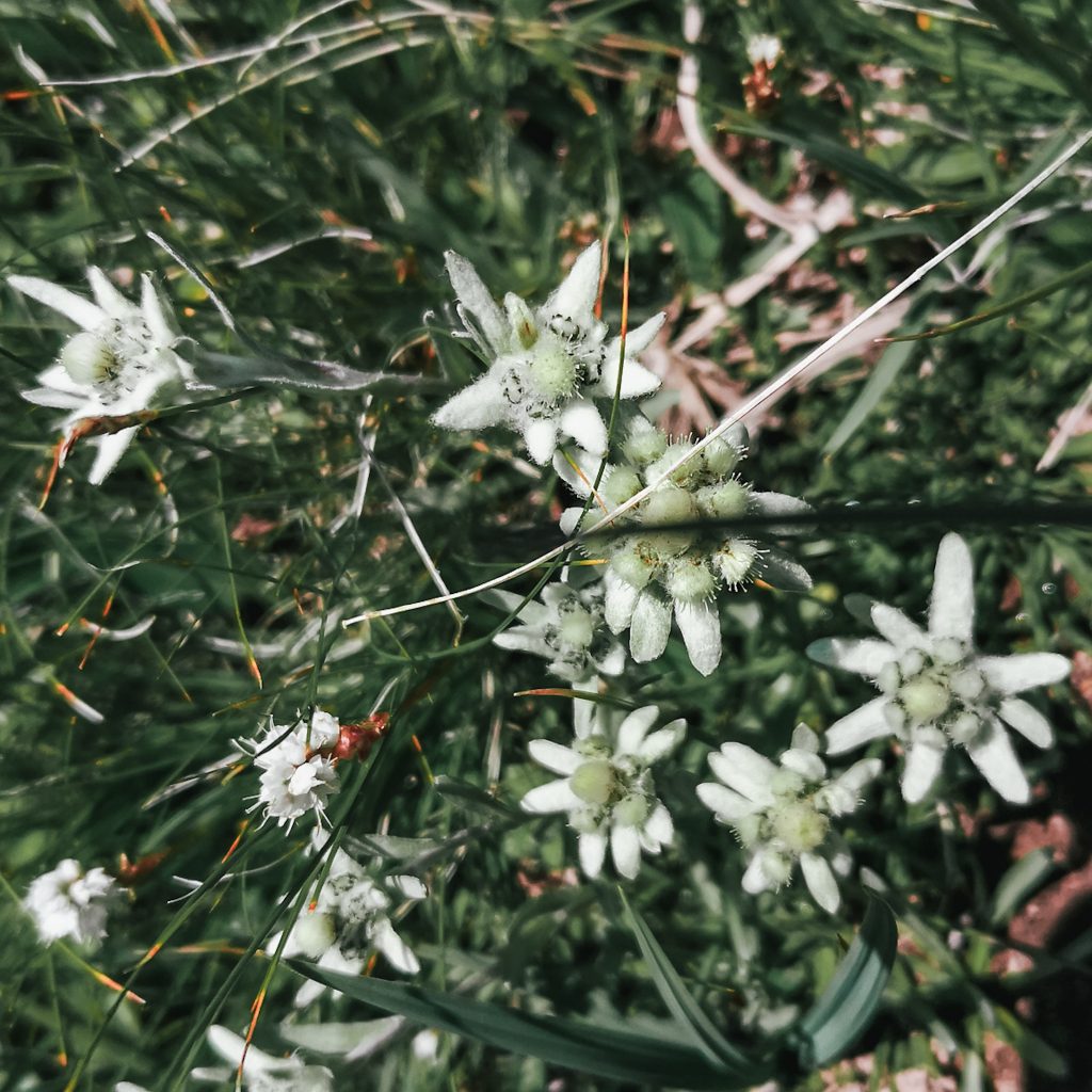 Wir laufen weiter und Caro identifiziert eine weiße flauschige Blüte als Edelweiß. Kann das sein? Die hübsche Blume kennen die meisten wahrscheinlich von österreichischen Marken, aber in der Natur hat Caro sie zuletzt irgendwann als Kind gesehen. Wir machen ein Foto, um uns mit Internet bei Caros Mama zu versichern, ob diese Vermutung tatsächlich stimmt.