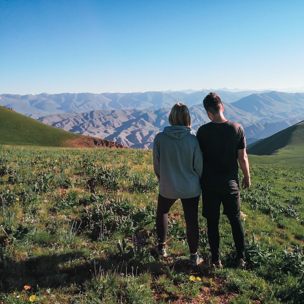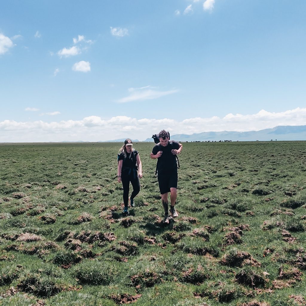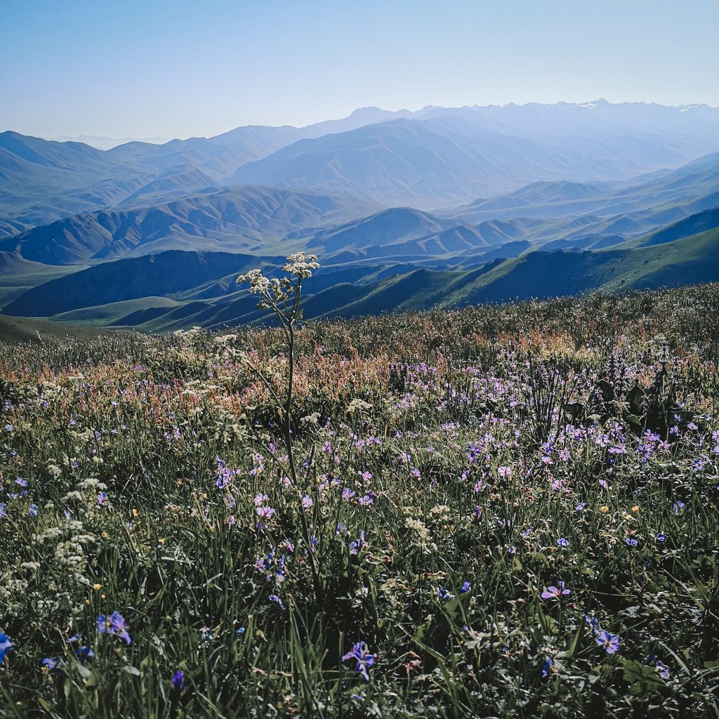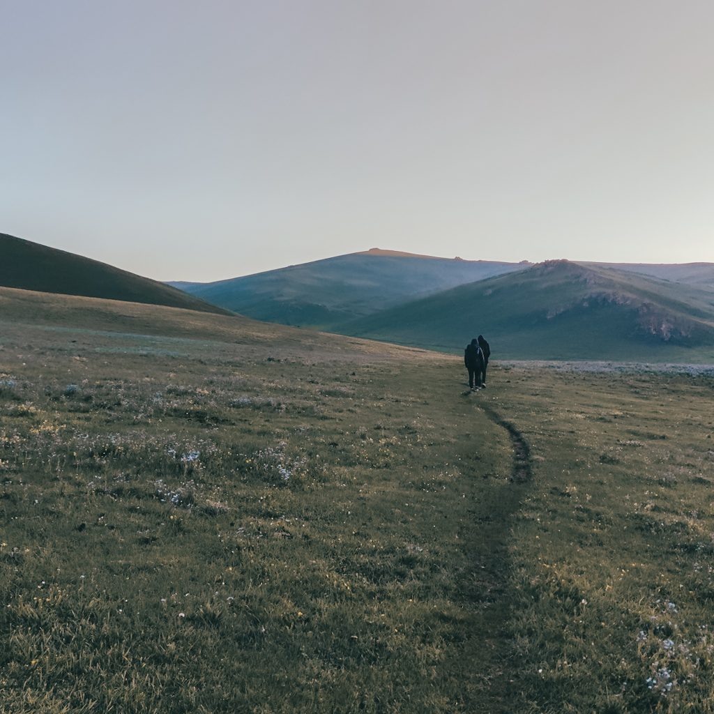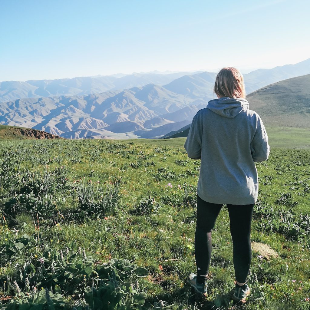 Der Tau liegt noch auf den Wiesen, die Sonne hat es noch nicht über den Berg geschafft. Wir nehmen den Trampelpfad direkt über der Jurte. Es geht bergauf und schnell wird uns warm. Am höchsten Punkt des Weges machen wir noch einen kurzen Abstecher auf den nächsten Hügel. Von dort erhoffen wir uns einen schönen Ausblick.