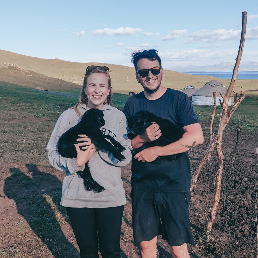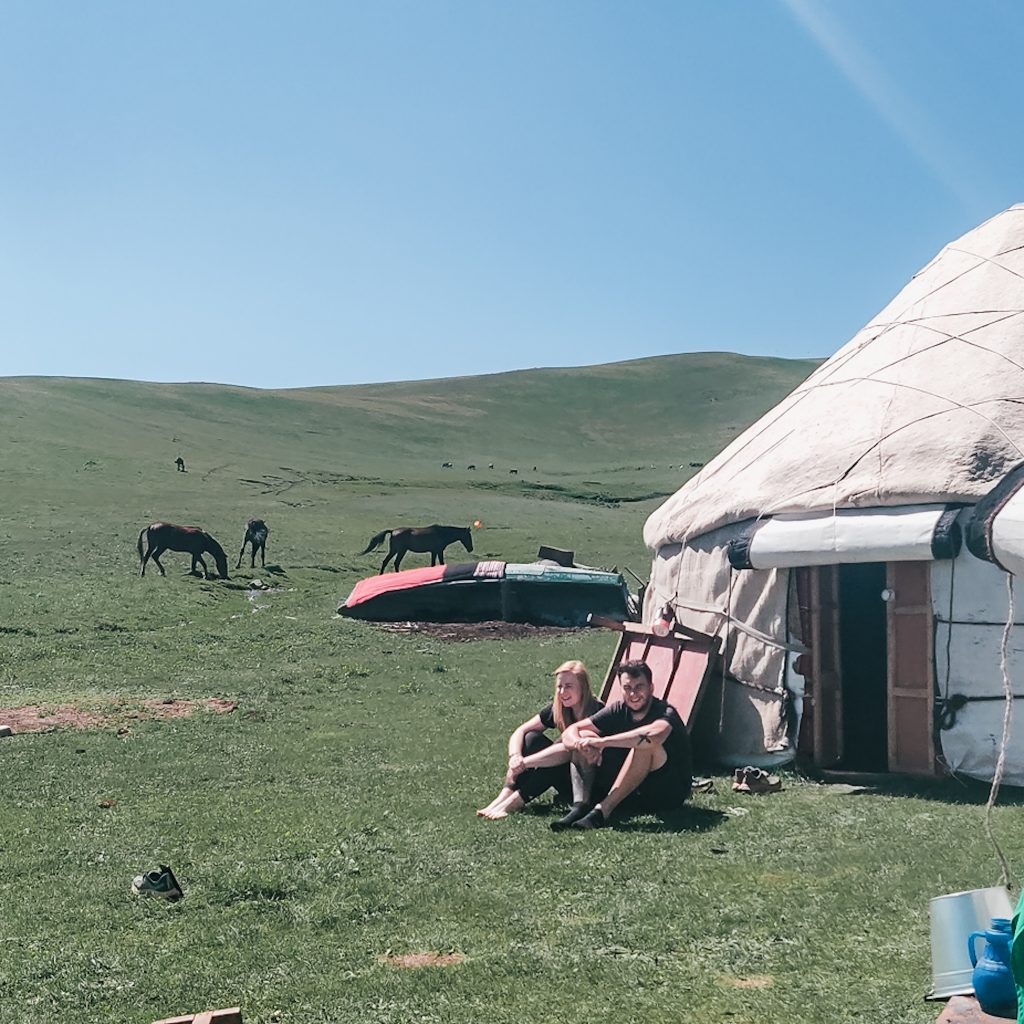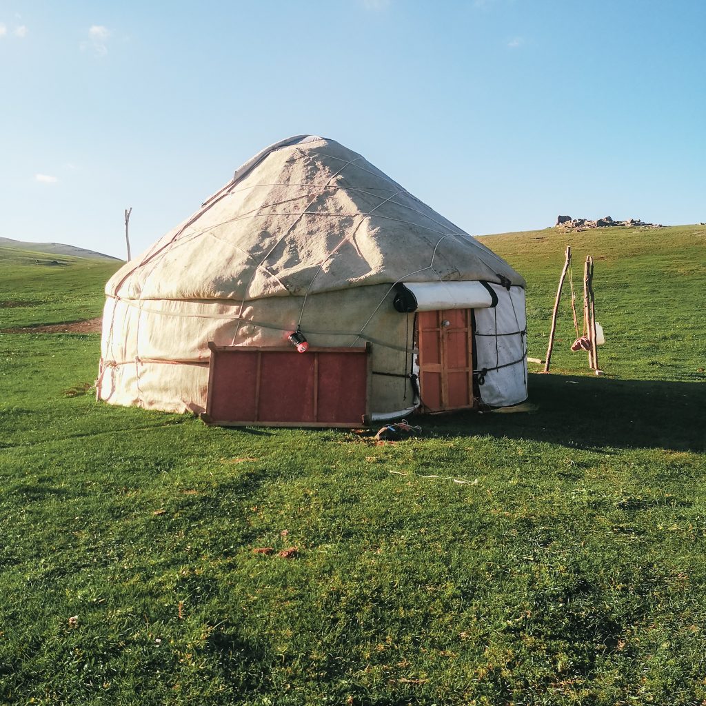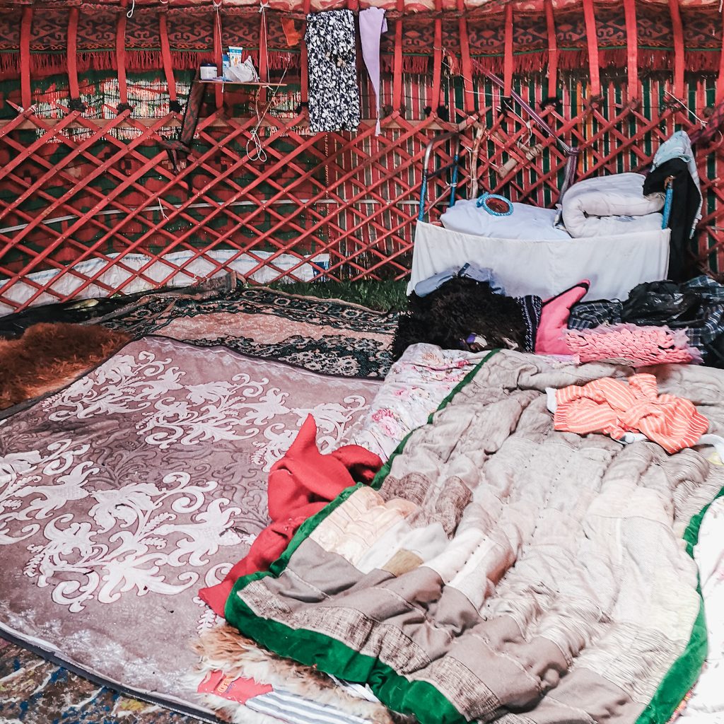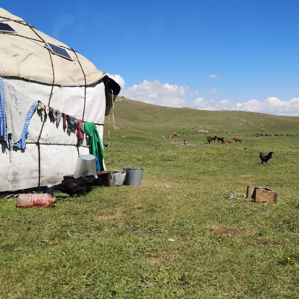 Nach ca. 20 km Wanderung um den See sichten wir zwei Jurten, die etwas im Landesinneren und nicht direkt am See liegen. Sie sehen alles andere als nach Touristenjurten aus, rundherum stehen lauter Tiere. Kühe, Pferde (was auch sonst), Schafe und ein Hund ist ebenfalls angeleint. Eine Frau sitzt vor der Jurte. Etwas schüchtern gehen wir auf sie zu und fragen nach, ob wir hier übernachten können. Wir stellen schnell fest, dass unsere gemeinsame Sprache Lachen, Hände und Füße sind. Nazgul kann nur Kirgisisch und Russisch und wir.. naja, dass wisst ihr ja.. können weder das eine noch das andere. Mit dabei ist auch Nasdan, ihre 7 jährige Tochter, die schüchtern aber neugierig um uns herum läuft. Nazgul versteht unsere Zeichensprache, zeigt uns eine Schlaf-Jurte, in der auf dem Boden eine Matratze liegt und ein Kinderbett steht. Neben großen Eimern, einem kleinen Gasherd und ein bisschen Nudel-Proviant.