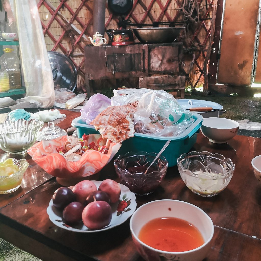 Dann werden wir in die andere Jurte geführt. Wir ziehen beim Betreten unsere Schuhe aus. In der Jurte befindet sich ein kleiner Ofen mit Kochstelle. Ein Rohr führt durch die Decke der Jurte, das Abzugsrohr des Qualms. In der Mitte befindet sich ein niedriger Tisch, er ist gedeckt und wir setzen uns drumherum auf den Boden, der mit Teppichen ausgelegt ist. Das Tischlein ist typisch kirgisisch gedeckt. Ein Gläschen mit Marmelade, Bonbons, Brot und zwei für uns am Anfang undefinierbare weitere Gläschen. Einmal mit gelblichem und einmal mit weißem Inhalt. Nazgul erklärt uns, dass es sich um Butter und Kaymak handelt. Beides selbstverständlich selbst hergestellt. Dazu wird Chai gereicht. Wir stärken uns und es schmeckt alles sehr gut. Dann kommt das, was zu erwarten war. Ob wir Kymis kennen, Nazgul zeigt auf einen großen Eimer. Ähm ja, kennen wir.