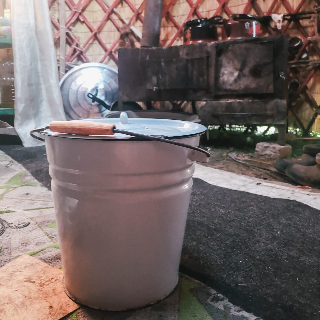 Nazgul kommt vom Melken zurück und winkt uns zur Schlaf-Jurte. In einem großen Fass befindet sich Kymis im Herstellungsprozess. Sie erklärt uns, dass sie immer wieder neue Milch hinzugibt und das ganze mehrmals am Stand gestampft und gerührt werden muss.