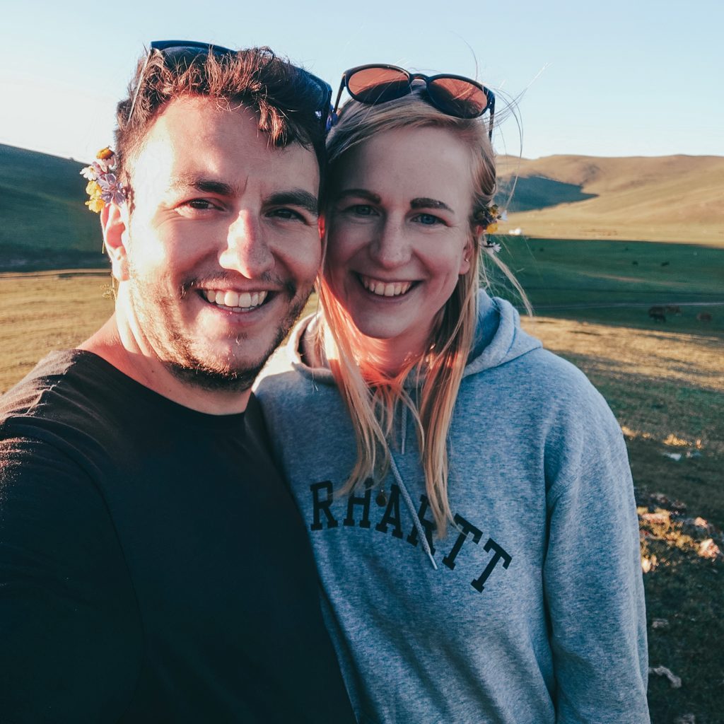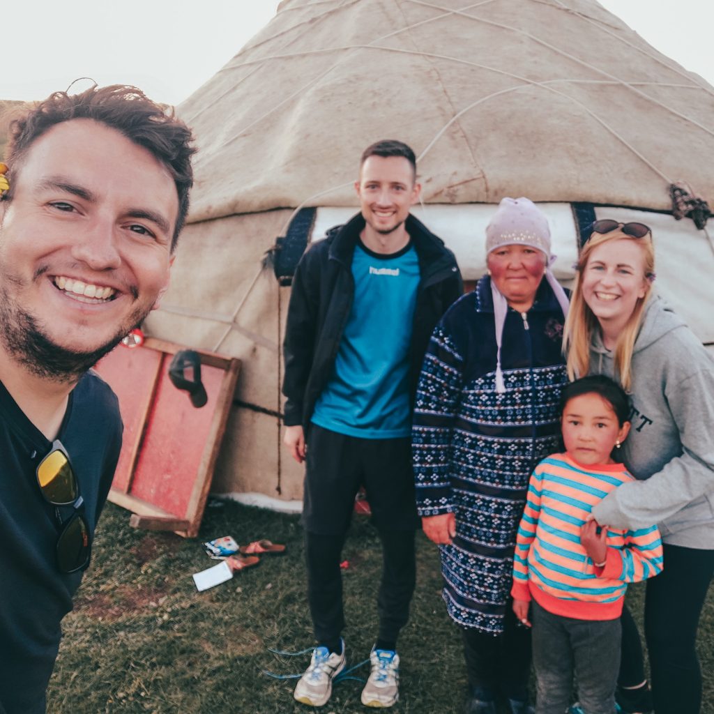 Danach spazieren wir wieder zurück. Bevor es zu dunkel wird, ist uns eine Sache noch ganz wichtig. Wir möchten unbedingt ein Erinnerungsfoto mit den beiden machen. Nazgul verschwindet noch schnell in der Schlaf-Jurte und kommt mit einem neuen Kopftuch heraus. Extra für das Foto. Gut, dass wir zumindest noch ein paar Blümchen im Haar haben, so sind wir alle top gestylt.