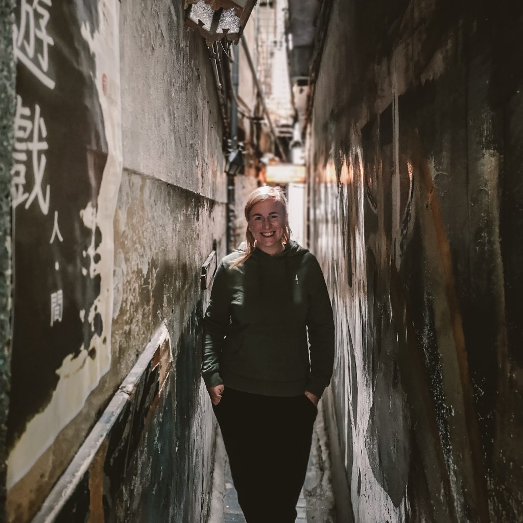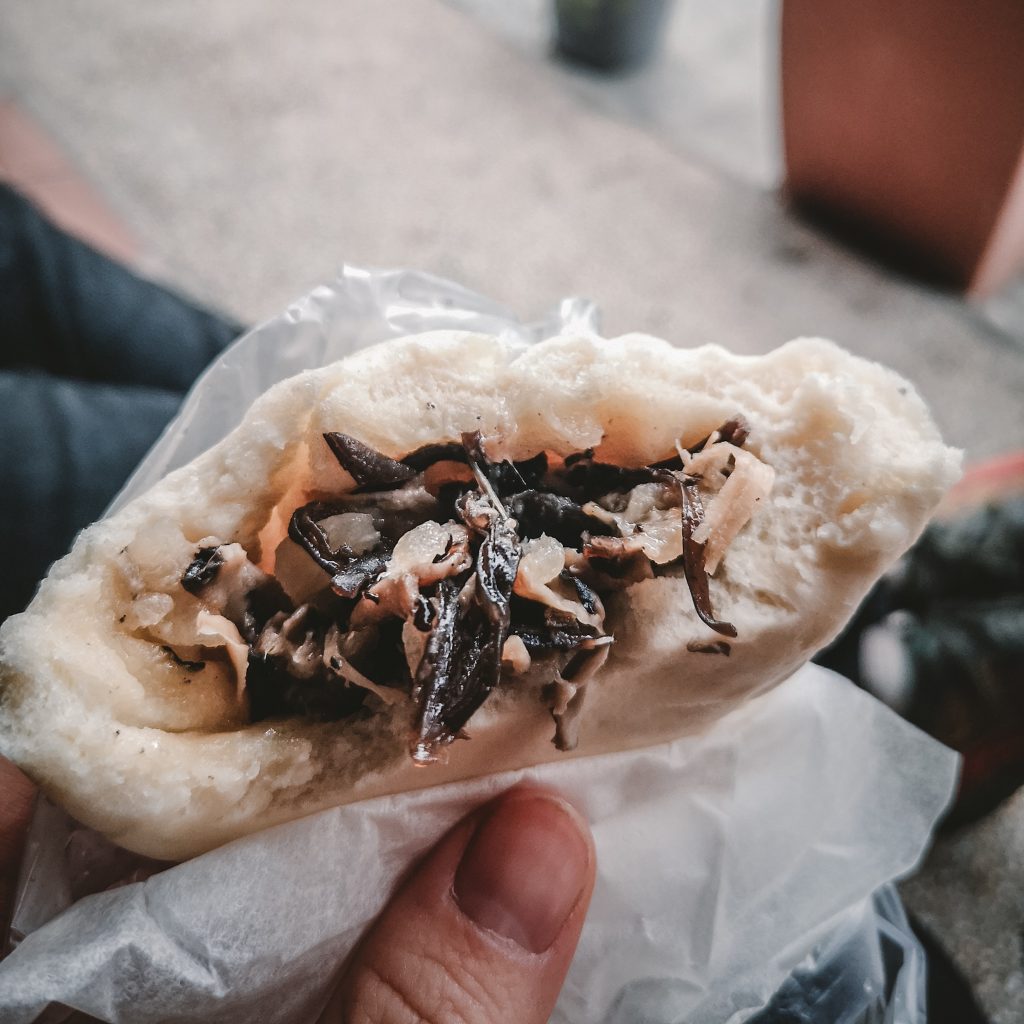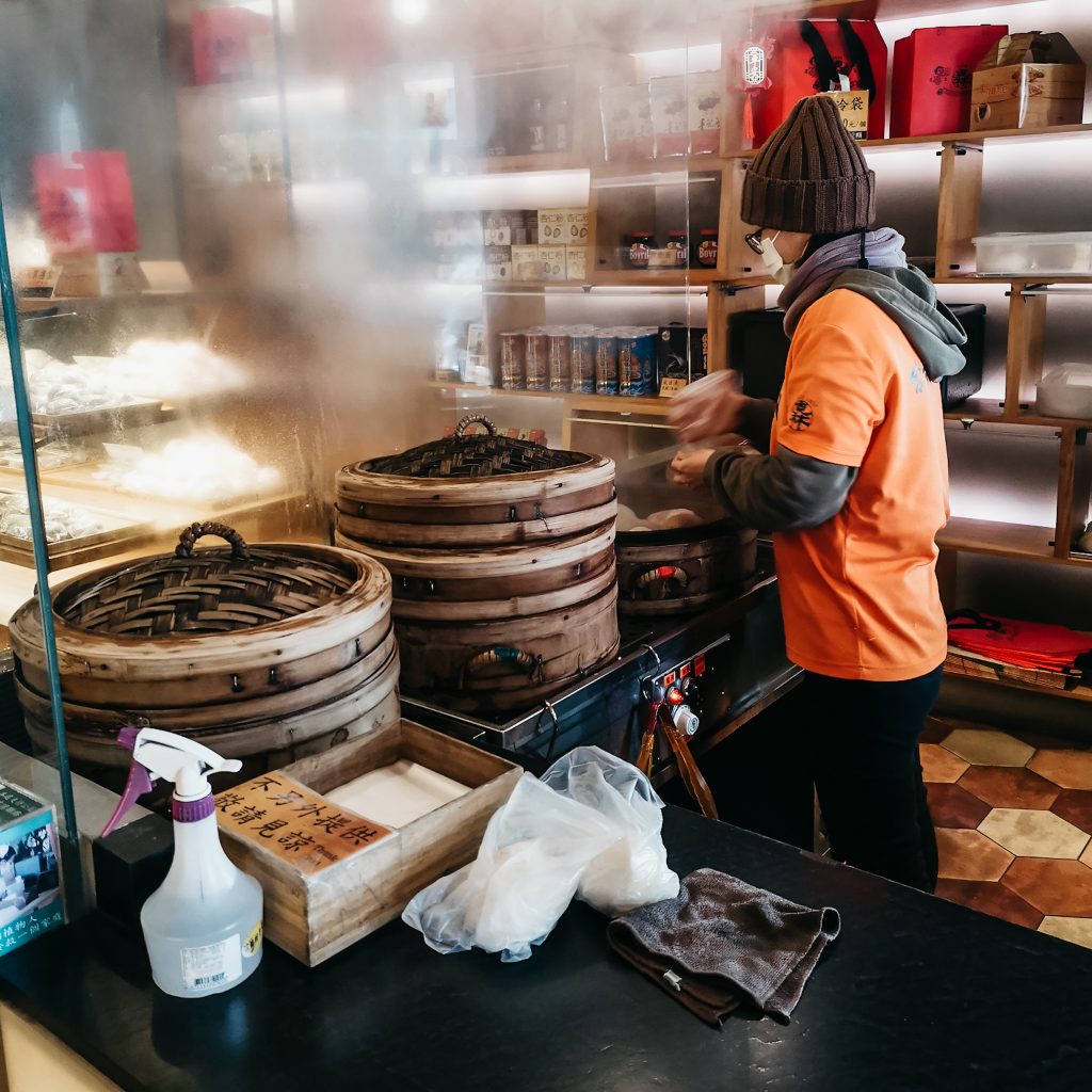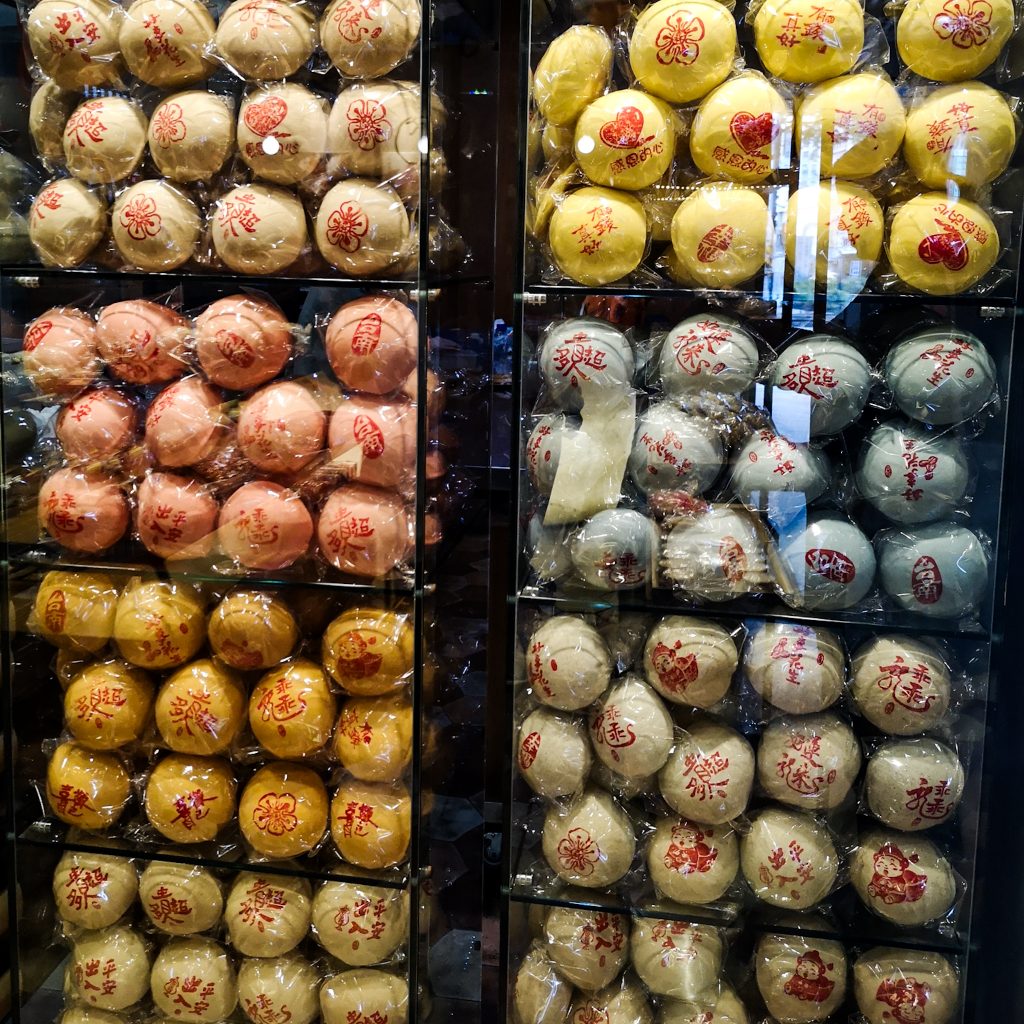 Unser Hotel liegt direkt neben dem Bahnhof, das ist wirklich praktisch. Erstmal wird heiß geduscht und dann wollen wir uns noch auf eine kleine Erkundungstour durch die Stadt begeben, gehen ist für Konsti weniger schmerzhaft und nur im Hotelzimmer hocken ist gerade keine wirkliche Option. Wir laufen etwas durch die Stadt und steuern einen Laden mit einer großen Variation an Buns an. Die Buns werden direkt hinter einem Schaufenster von Hand hergestellt. Es gibt verschiedenste Sorten und Füllungen. Neben einem Shop gibt es auch ein Verkaufsfenster, an dem frisch gedämpfte Buns aus Bambuskörben direkt in die hungrigen Hände der Kundschaft wandern. Da wir uns nicht entscheiden können, nehmen wir direkt vier verschiedene Sorten und testen uns einmal durch: Pilz, Pilze mit Trüffel, Bohnen und schwarzer Sesam. Alle sind köstlich und vor allem Caro liebt diese gedämpften Brötchen, die sie sehr an Germknödel erinnern. Auf der gleichen Straße entdecken wir eine kleine, sehr sehr schmale Gasse, die zu einem Café führt. Da besteht nach den Buns auf jeden Fall Feststeckungs-Gefahr.