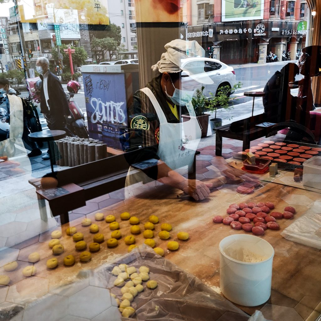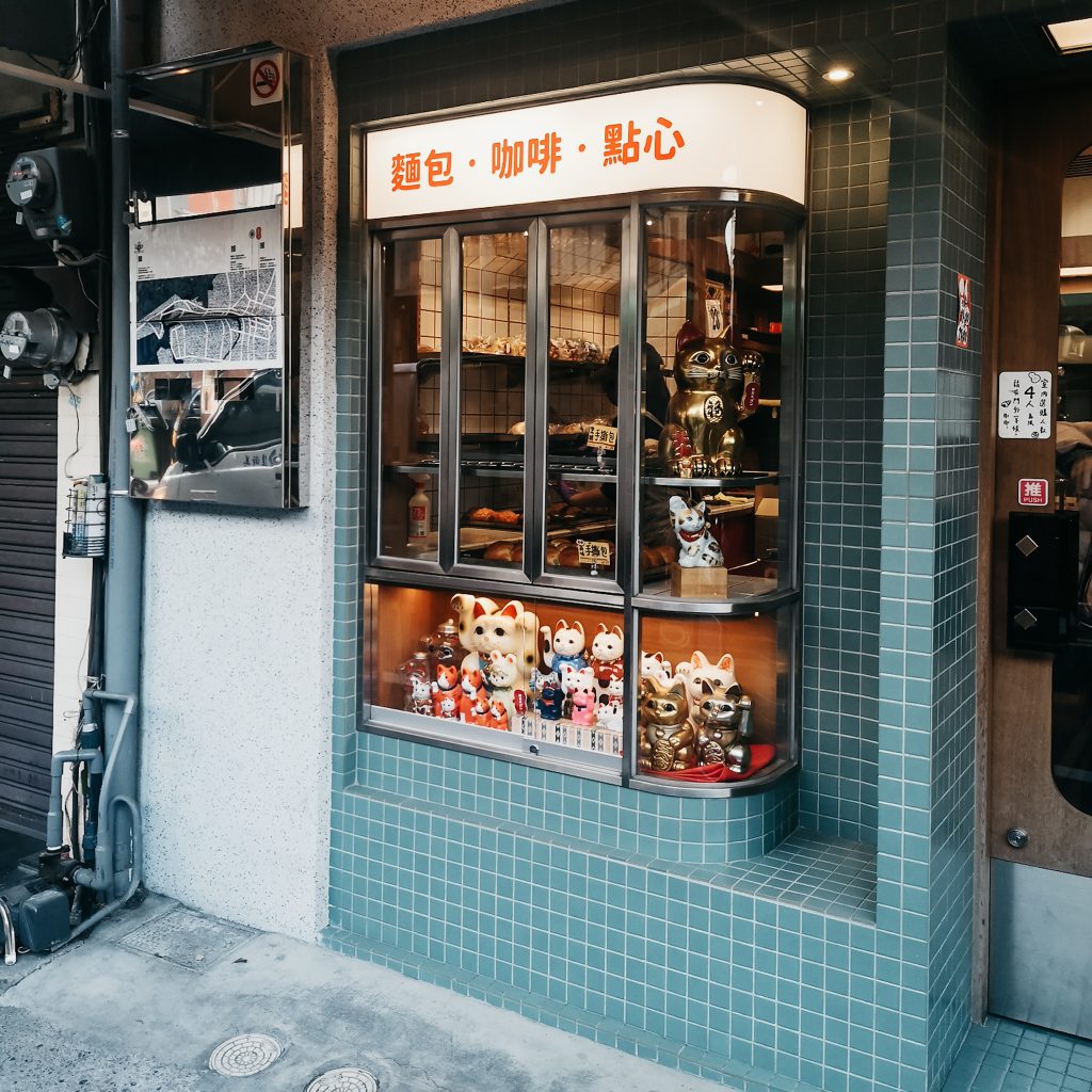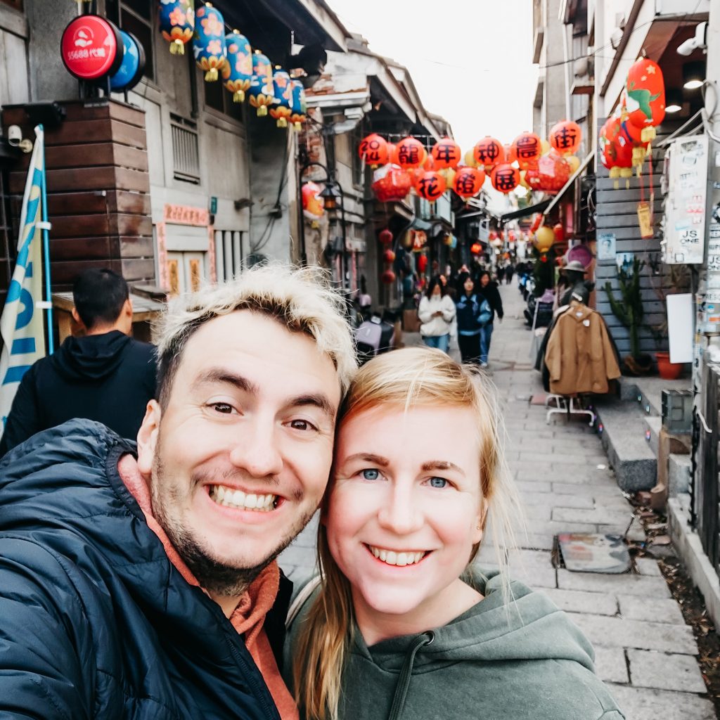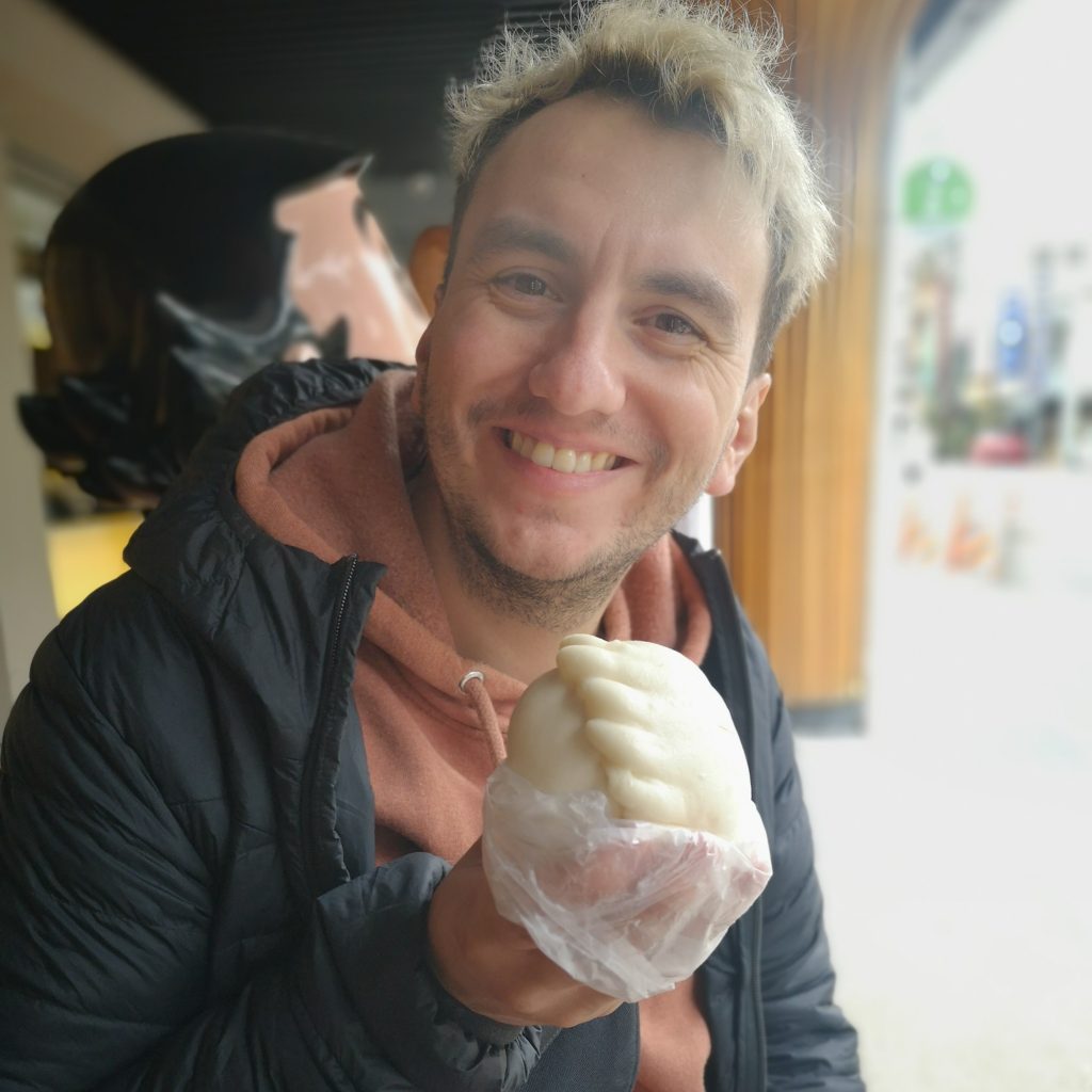 Unser Hotel liegt direkt neben dem Bahnhof, das ist wirklich praktisch. Erstmal wird heiß geduscht und dann wollen wir uns noch auf eine kleine Erkundungstour durch die Stadt begeben, gehen ist für Konsti weniger schmerzhaft und nur im Hotelzimmer hocken ist gerade keine wirkliche Option. Wir laufen etwas durch die Stadt und steuern einen Laden mit einer großen Variation an Buns an. Die Buns werden direkt hinter einem Schaufenster von Hand hergestellt. Es gibt verschiedenste Sorten und Füllungen. Neben einem Shop gibt es auch ein Verkaufsfenster, an dem frisch gedämpfte Buns aus Bambuskörben direkt in die hungrigen Hände der Kundschaft wandern. Da wir uns nicht entscheiden können, nehmen wir direkt vier verschiedene Sorten und testen uns einmal durch: Pilz, Pilze mit Trüffel, Bohnen und schwarzer Sesam. Alle sind köstlich und vor allem Caro liebt diese gedämpften Brötchen, die sie sehr an Germknödel erinnern. Auf der gleichen Straße entdecken wir eine kleine, sehr sehr schmale Gasse, die zu einem Café führt. Da besteht nach den Buns auf jeden Fall Feststeckungs-Gefahr.