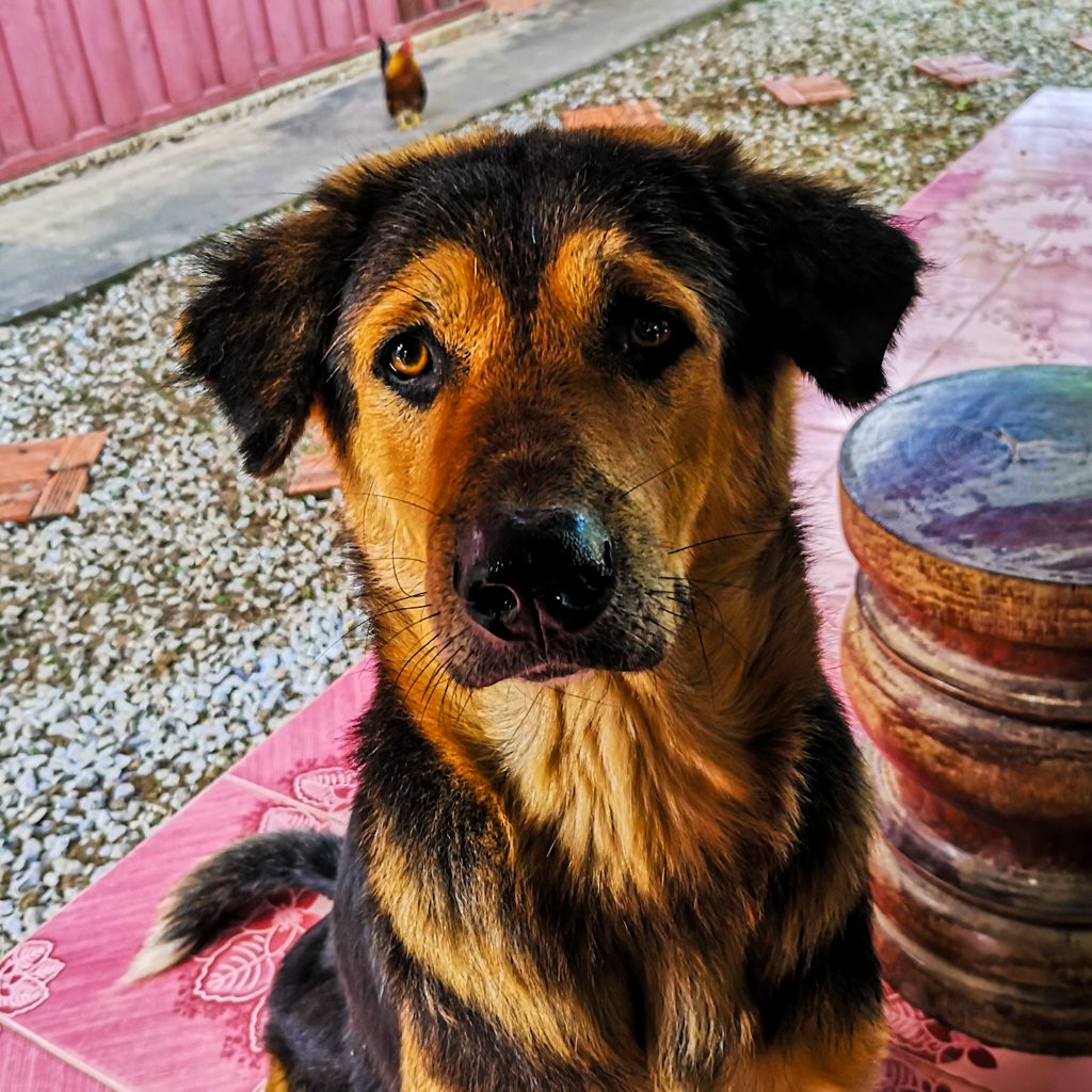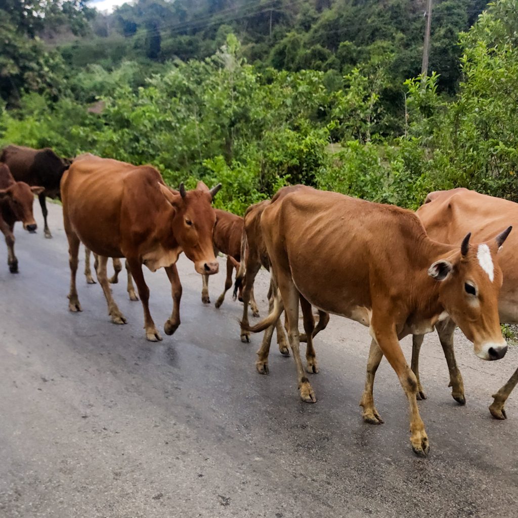 Am nächsten Morgen frühstücken wir schon früh. Es gibt selbstgebackenes Brot und einen Pfannkuchen mit Obst. Und natürlich einen Kaffee. Gesellschaft leisten uns die beiden Hunde der Unterkunft. Unsere Gastgeberin erklärt uns, dass der große, braunschwarze Hund besser Englisch als Laotisch versteht und total auf Reisende fixiert ist. Schon als Welpe hat er immer viel Aufmerksamkeit von diesen bekommen. Gedanklich ergänzen wir:… viel Aufmerksamkeit UND viel Essen. Sein starrender Blick auf unseren Frühstücksteller und die Pfote, die er währenddessen auf unseren Schoß legt, spricht Bände. Wir verabschieden uns mit einem lautstarken Auslösen unserer Alarmanlage beim Abschließen des Rollers und fahren los.