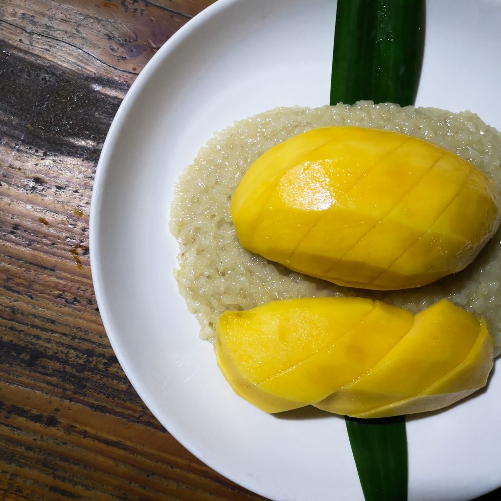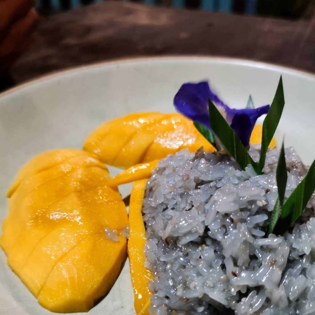 Nachdem wir uns gestärkt haben, fahren wir rüber zu unserer Unterkunft, beziehen den Bungalow und gehen duschen. Gegen Abend bekommen wir etwas Appetit. Wir fragen nach, ob sie auch Mango Sticky Rice haben. Das ist die beste Entscheidung des Tages. Wir bekommen den weltbesten Mango Sticky Rice serviert. Himmel ist der gut. Um Welten besser als jeden bisherigen Sticky Rice. Die Mango ist perfekt gereift, saftig süß und nicht fasrig. Der Reis ist bereits gesüßt und klebrig-cremig. Dazu gibt es selbstgemachten Zuckerrohrsirup. Der einzige Haken: Wir teilen uns eine Portion. Anfängerfehler.