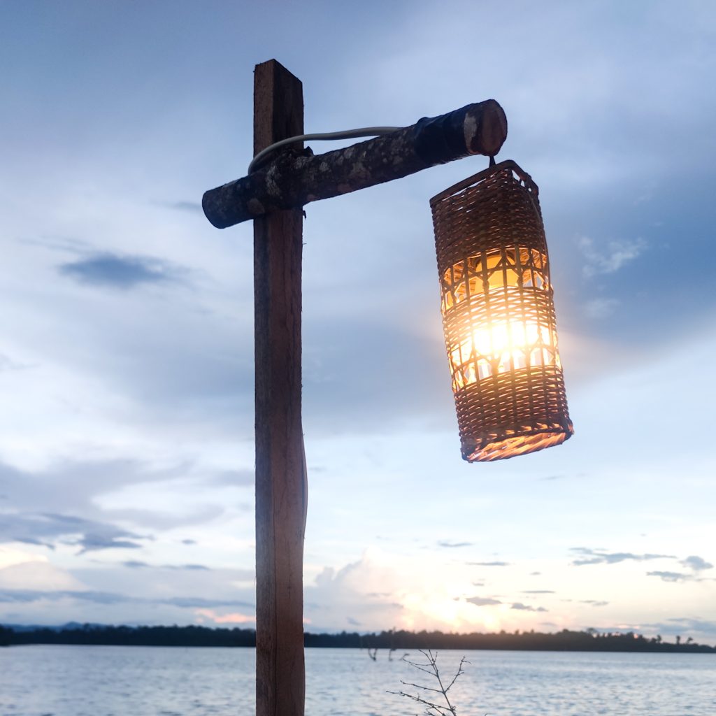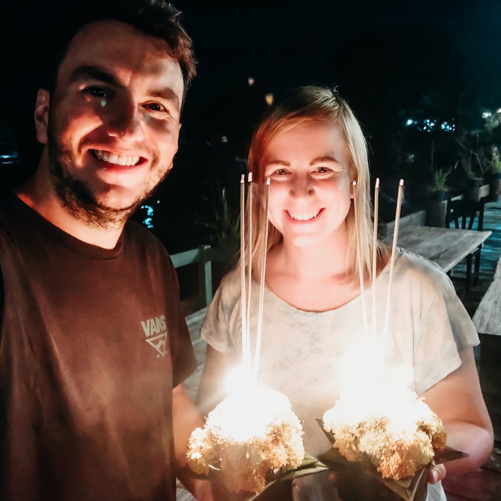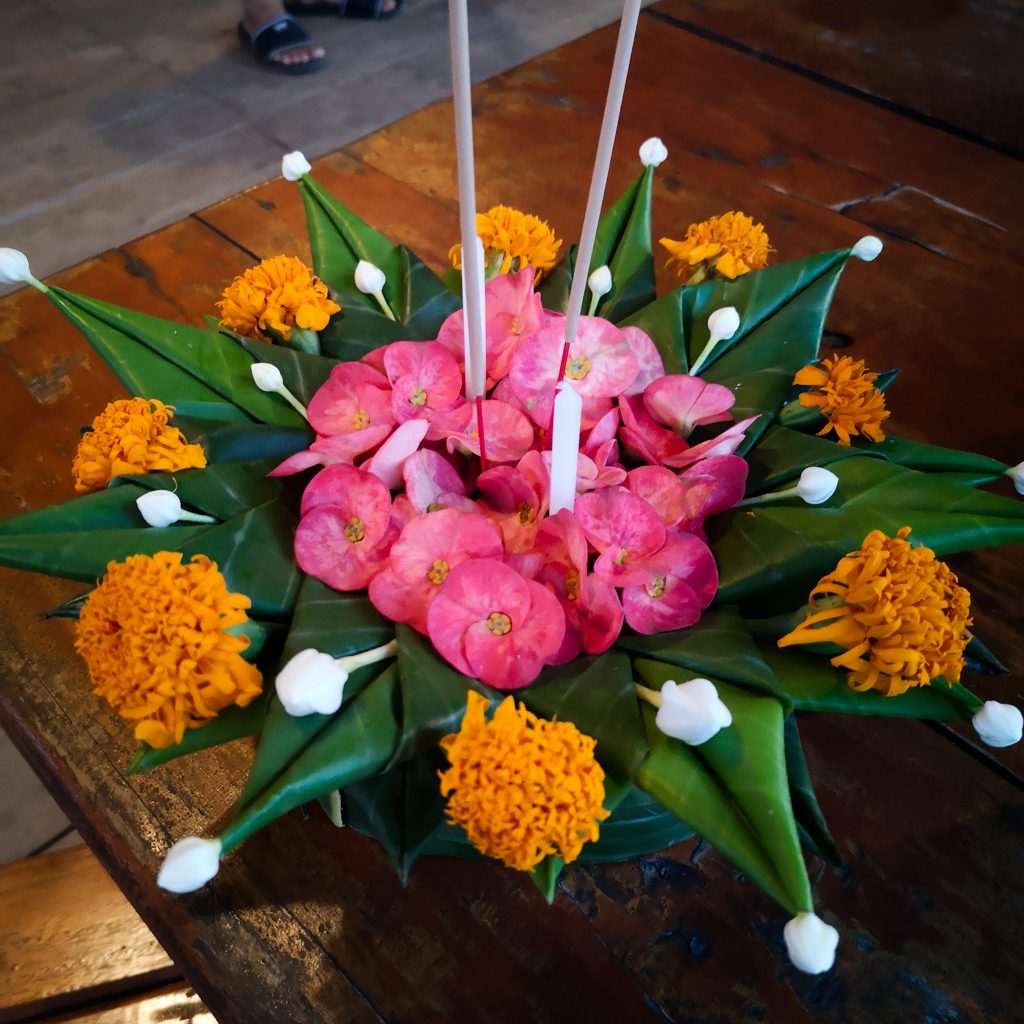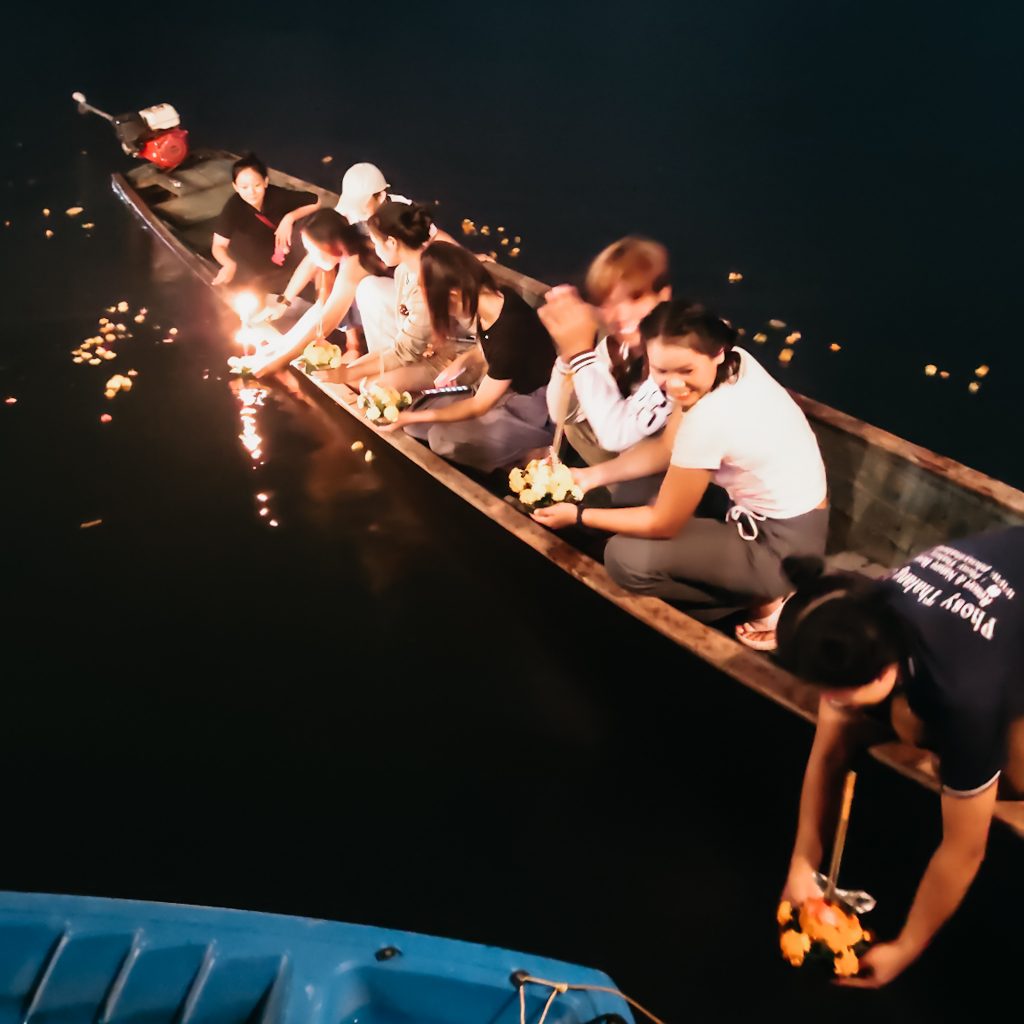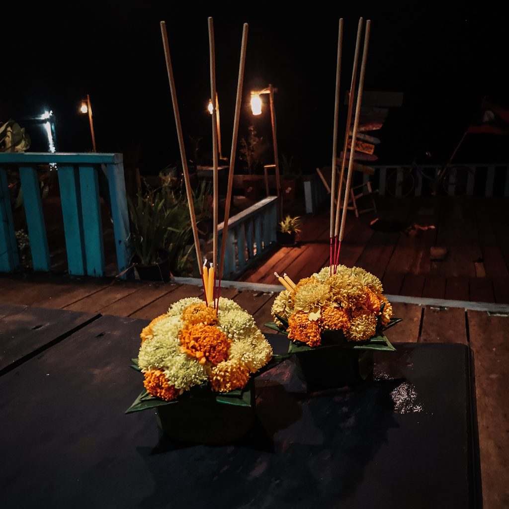 Jetzt aber zum wichtigen Teil des Abends. Wir feiern das Lichtfest zum Ende der Regen- und Fastenzeit. Zumindest ist das unsere Interpretation nachdem wir nach Ausschlusskriterien und Beschreibungen alle Festivitäten durchgegangen sind. Als wir nämlich vor Ort gefragt haben, konnte uns niemand so richtig den Anlass erklären. Aber je nachdem, woran die Menschen glauben, kann dies natürlich auch unterschiedlich sein. Die Frauen und Mädchen haben für heute Abend Bambus-Bananenblatt-Boote gebaut, die mit orangefarbenen Blüten, Räucherstäbchen und Kerzen dekoriert sind. Wir bekommen auch zwei Bötchen geschenkt, so nett und eigentlich viel zu schade, um sie gleich im See zu versenken. Denn genau das passiert wortwörtlich als wir unsere Bötchen zu Wasser lassen. Die Kerzen gehen direkt aus, es ist leider zu windig und und schnell kommen die Blumenboote in Schieflage, bevor sie ganz umkippen und sich die Blüten verteilen. Zu unserer Verteidigung: Das passiert so ziemlich mit allen Booten früher oder später. Na hoffentlich bringt das jetzt kein Unglück 😱