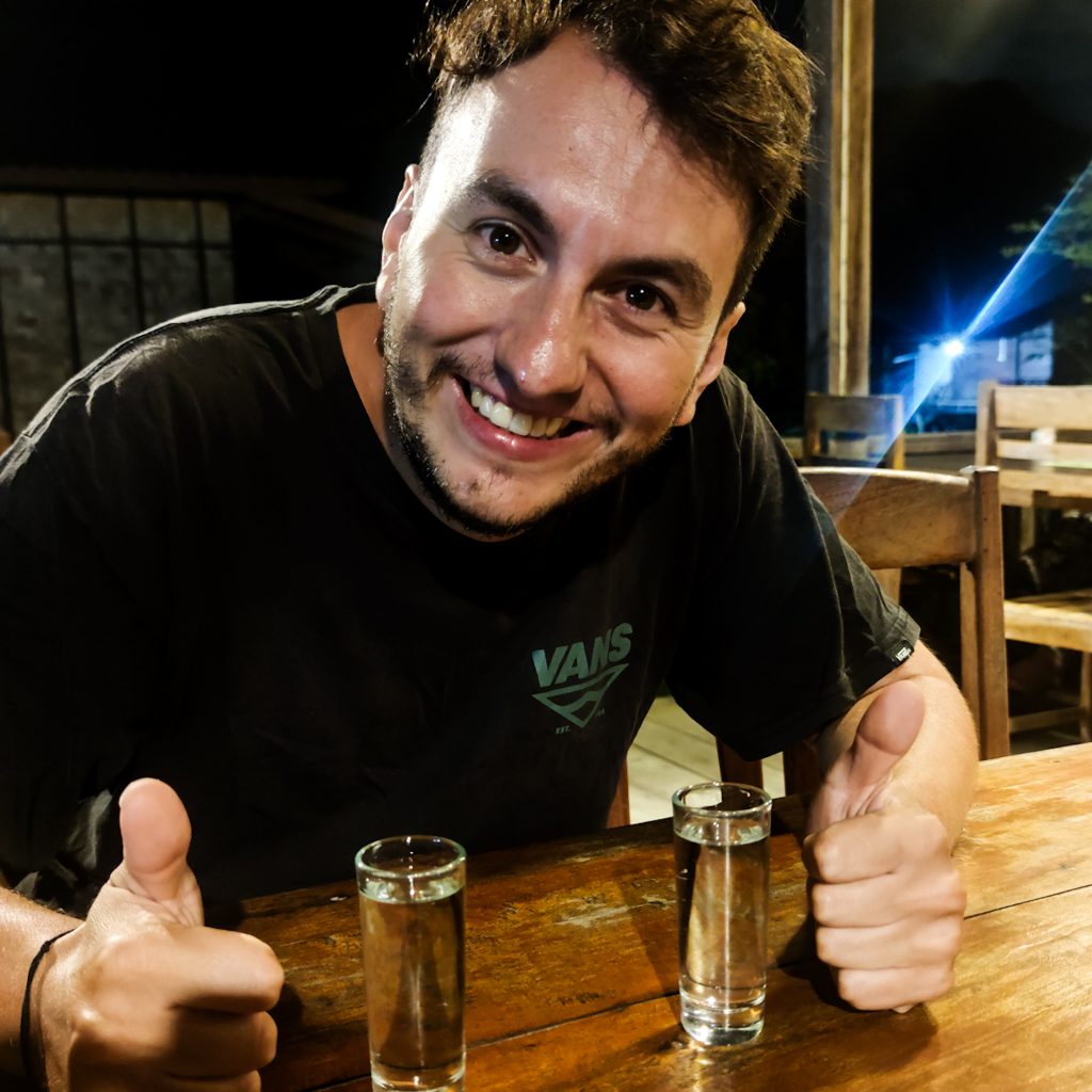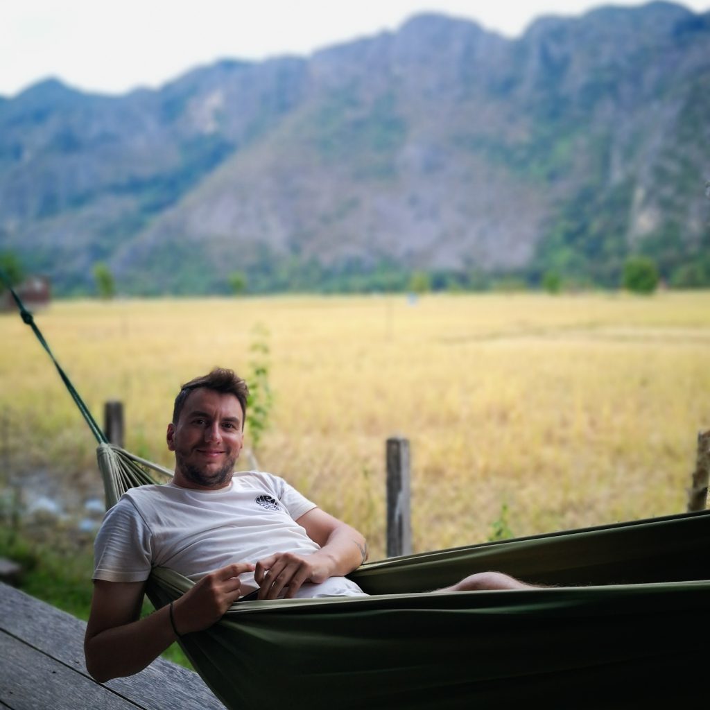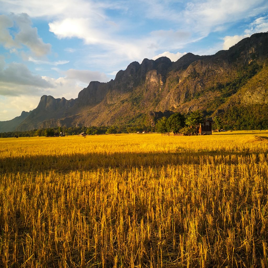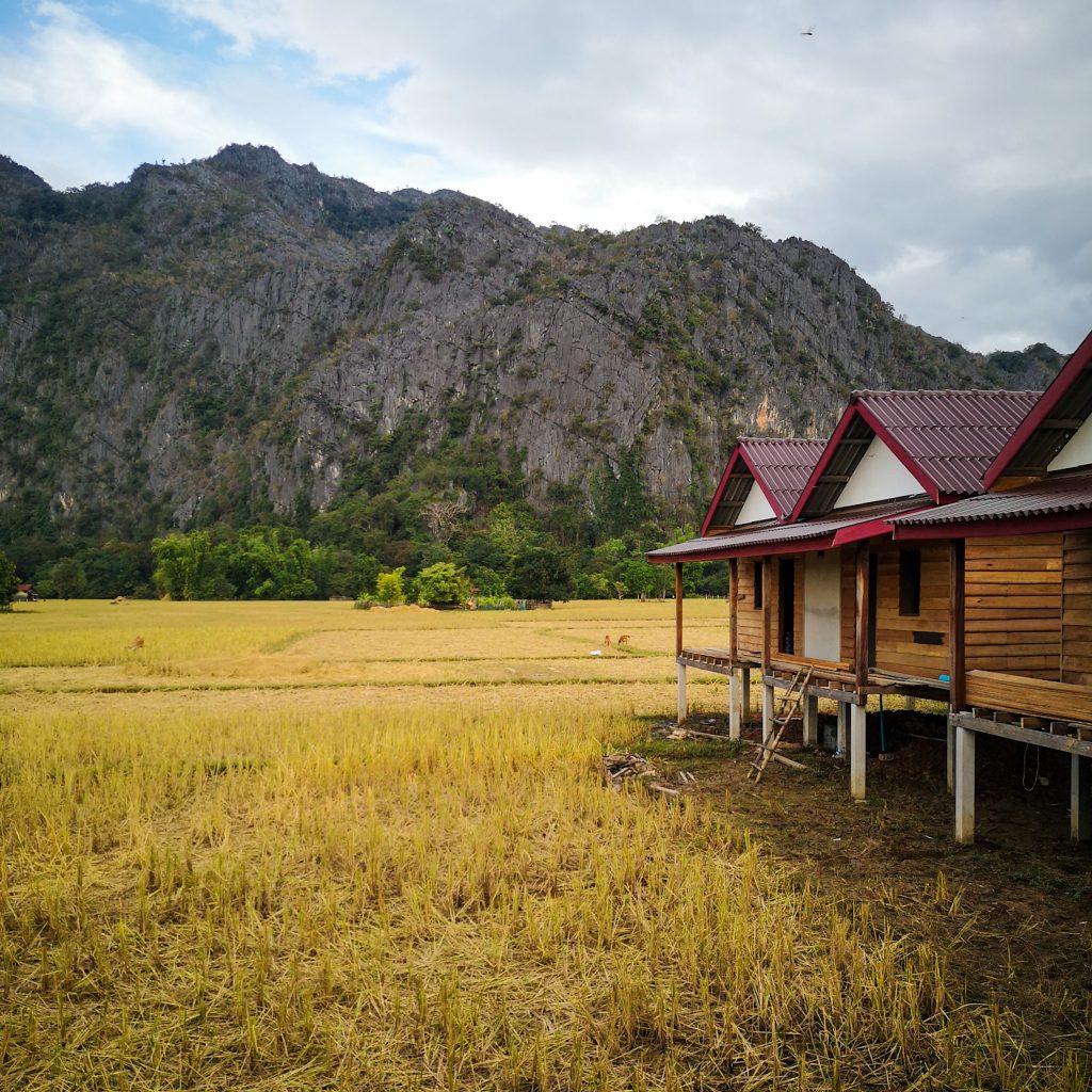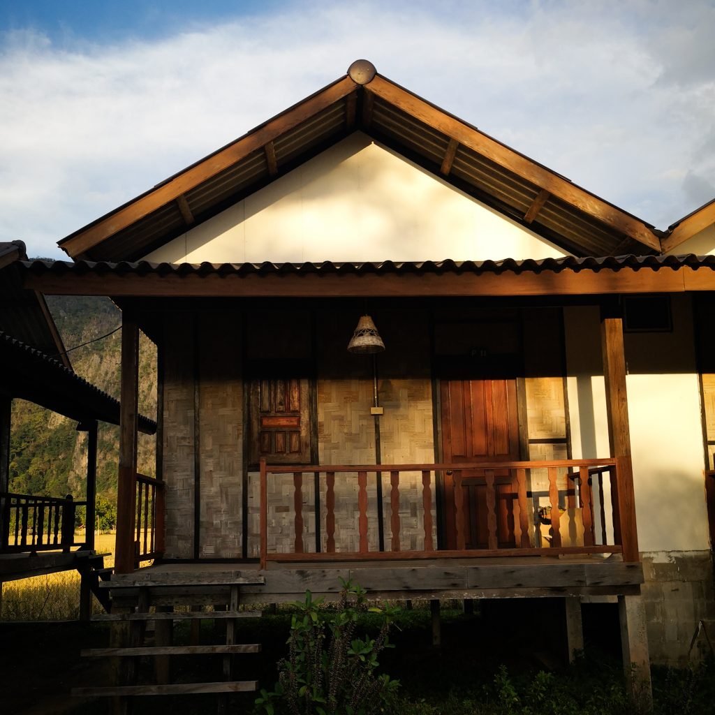 Unser Guesthouse liegt in einem kleinen Dorf und besteht aus kleinen süßen Bungalows. Hinten raus gibt es eine Mini-Terrasse mit Hängematte, direkt bei den Reisfeldern mit Blick auf die Berge. Schööön! Hier lässt es sich aushalten. Wir setzen uns auf die Terrasse im Restaurant. Das Guesthouse ist (wie so ziemlich alle hier) familiengeführt. Hier trinken wir auch unseren ersten Lao Lao, den laotischen Reisschnaps, der wie es sich für Reisschnaps gehört, schön warm serviert wird.