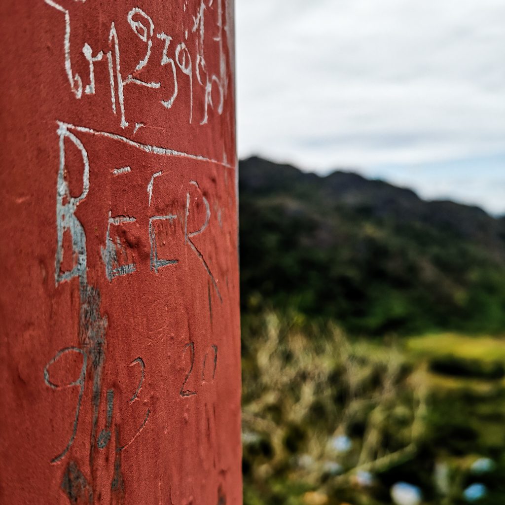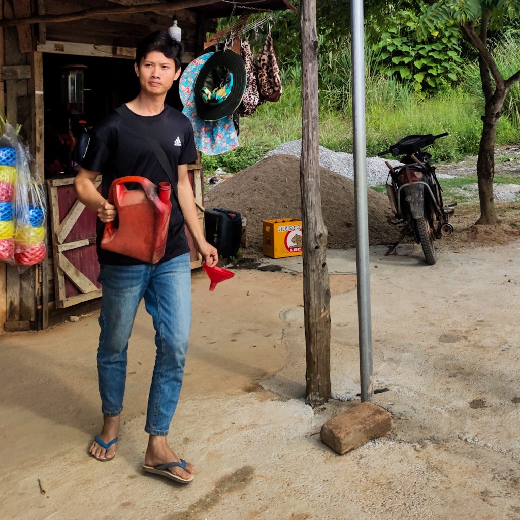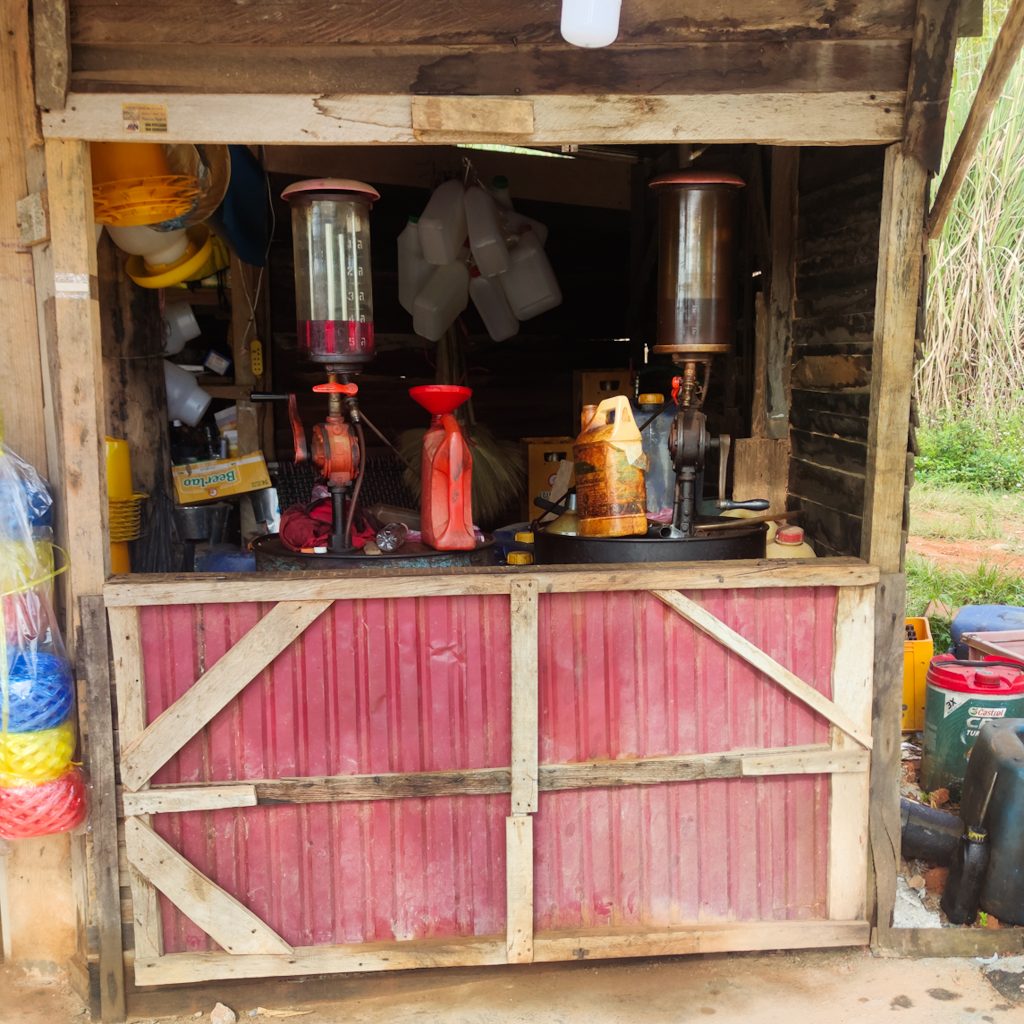 Konsti lässt uns weiter den Berg herunter rollen. Gefühlt sind wir mittlerweile im Negativ-Bereich der Tanknadel. Da taucht unsere Rettung auf. Ein handgeschriebenes Schild mit Gas Station scheint unsere Rettung. Es ist eher ein Tank-Kiosk, bei dem der Sprit erst im einen transparenten Behälter gepumpt und von diesem in eine Kanne abgefüllt wird. Hier gibt’s noch echte Handarbeit. Glück gehabt, das war wahrscheinlich Rettung in letzter Minute. Weiter geht die Fahrt.