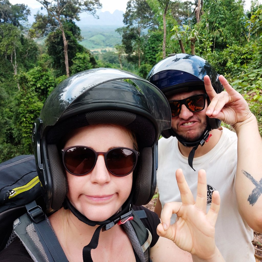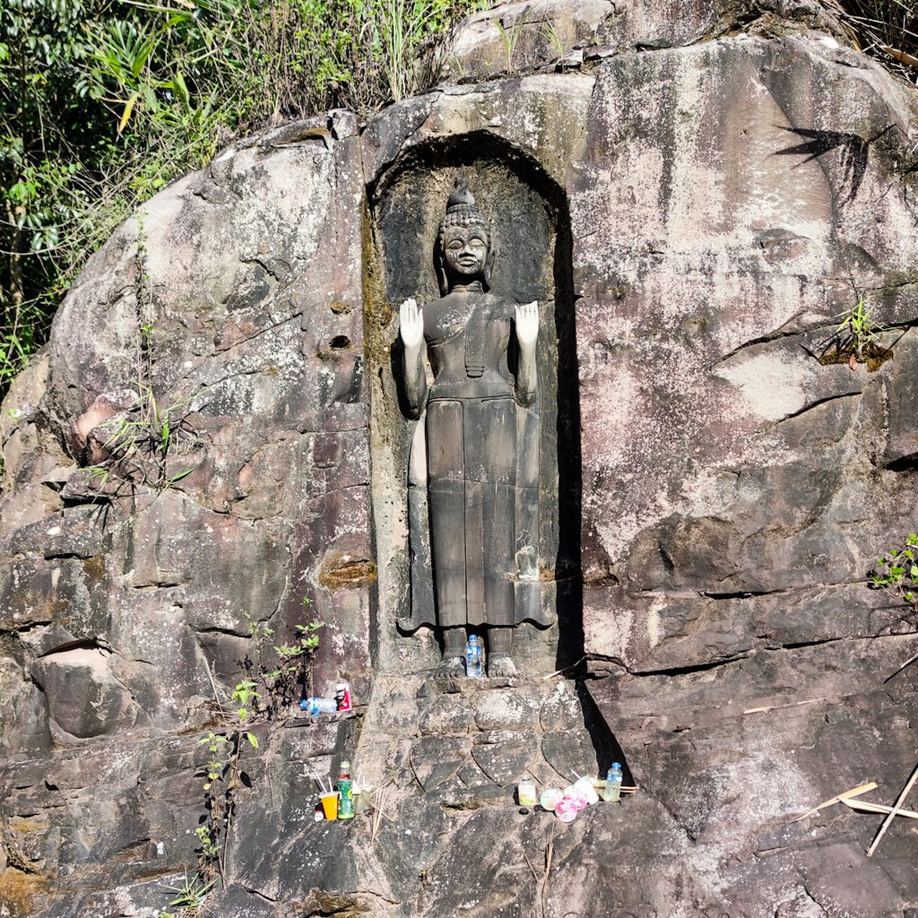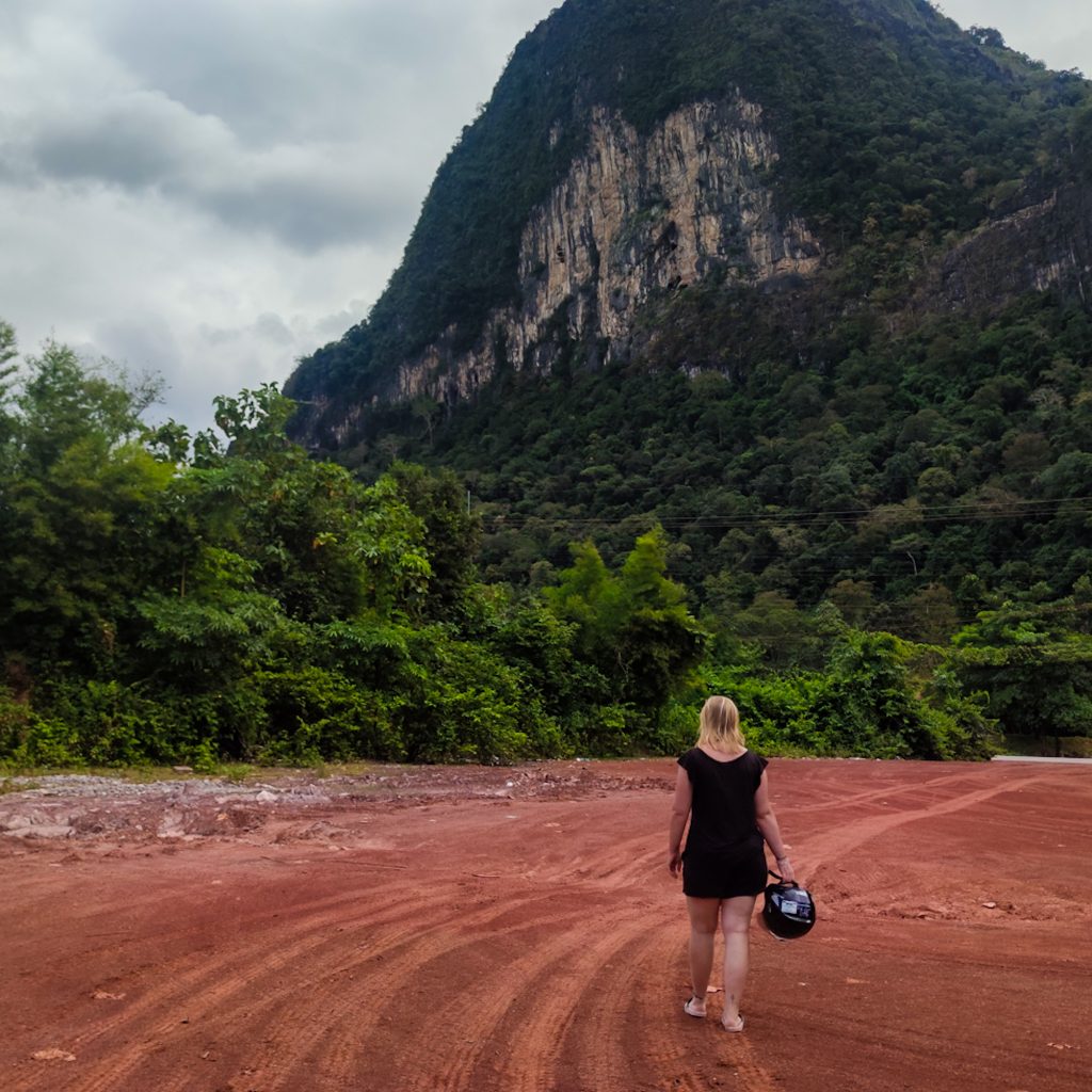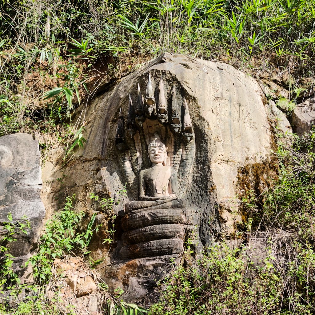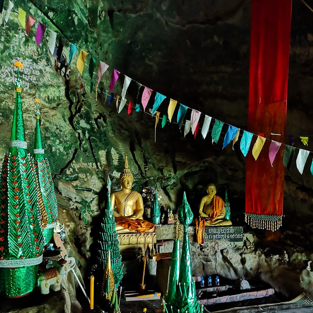 Da wir schon um 6.30 Uhr im Hostel frühstücken können, nehmen wir das noch mit, bevor wir uns gegen 7 Uhr auf den Weg machen. Hoffentlich noch vor den anderen Tourist:innen. Besonders zu Beginn sehen wir ausschließlich Einheimische. Schon nach ca. 15 Minuten biegen wir zum ersten Stopp ab. Der Xieng Liap Höhle. Zugehörig zur Höhle ist ein kleiner Hochseilgarten. Und weil wir uns schon lange nicht mehr verlaufen haben, überwinden wir erstmal eine wackelige Hängebrücke, um dann auf der anderen Seite festzustellen, dass diese nur in den Hochseilgarten führt. Also wieder zurück. Wir folgen einem kleinen Weg und als wir beim Eingang der Höhle ankommen, merkt Caro, dass die Adiletten heute nicht die beste Wahl sind. Während Konsti furchtlos mit der Kopflampe auf Erkundungstour in der komplett dunklen Höhle geht, kämpft Caro einen anderen Kampf. Es gibt wenig, was sie in so kurzer Zeit aus der Haut fahren lässt: Eine Armada an Mücken hat es auf sie abgesehen und greift aggressiv an.