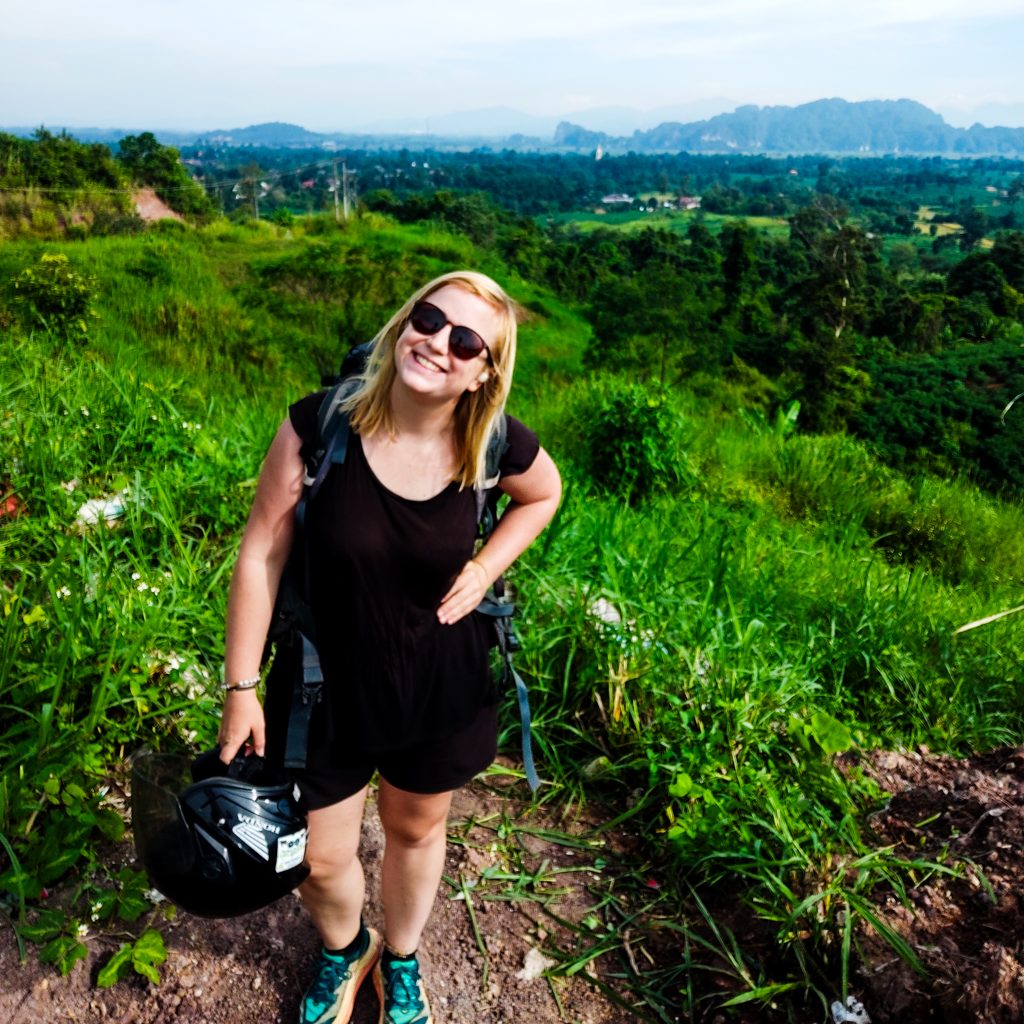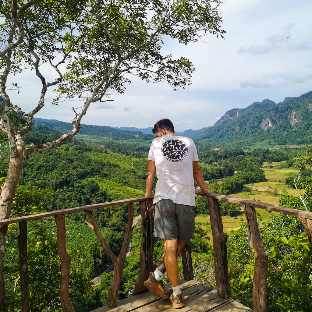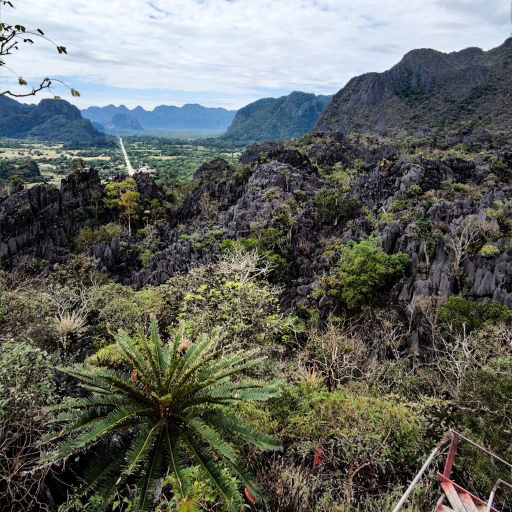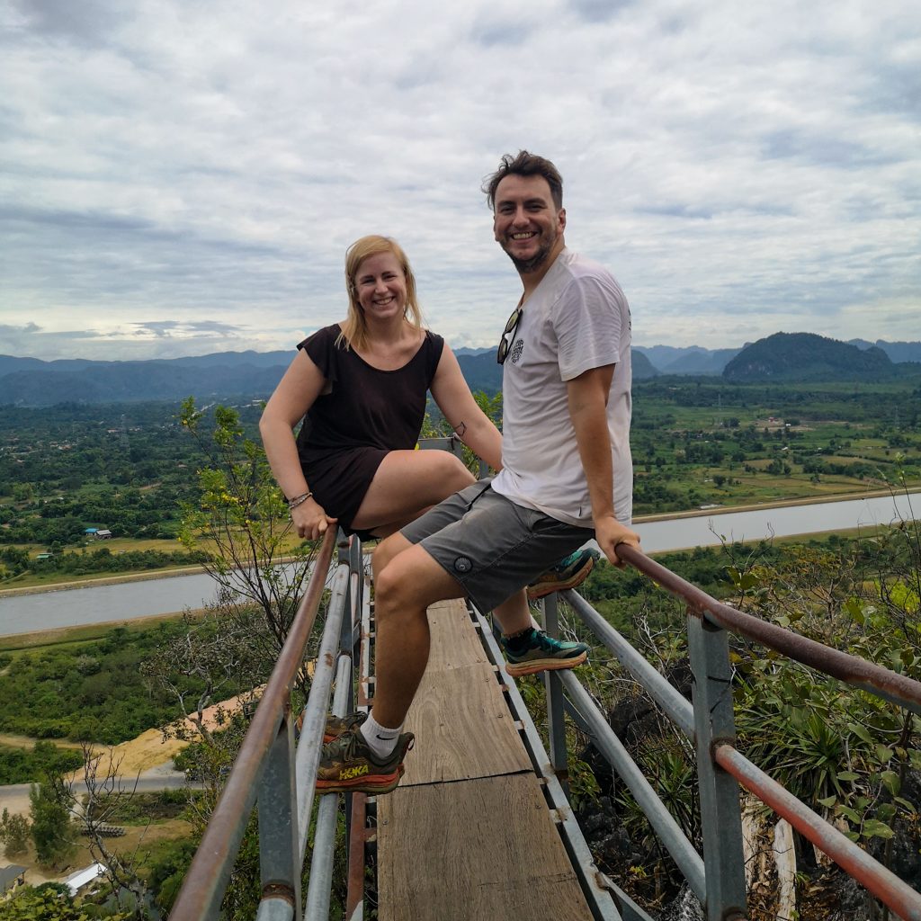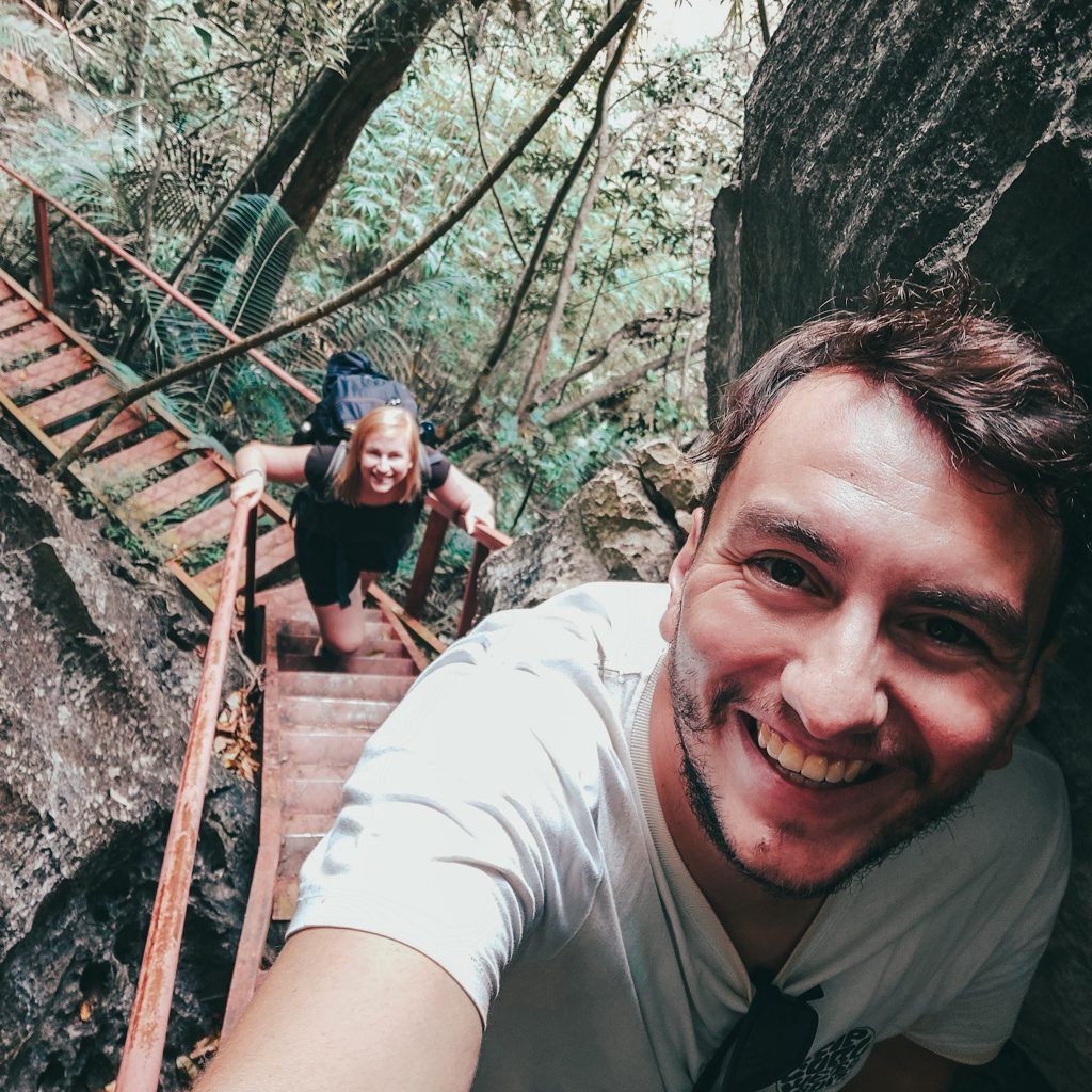 Da wir schon um 6.30 Uhr im Hostel frühstücken können, nehmen wir das noch mit, bevor wir uns gegen 7 Uhr auf den Weg machen. Hoffentlich noch vor den anderen Tourist:innen. Besonders zu Beginn sehen wir ausschließlich Einheimische. Schon nach ca. 15 Minuten biegen wir zum ersten Stopp ab. Der Xieng Liap Höhle. Zugehörig zur Höhle ist ein kleiner Hochseilgarten. Und weil wir uns schon lange nicht mehr verlaufen haben, überwinden wir erstmal eine wackelige Hängebrücke, um dann auf der anderen Seite festzustellen, dass diese nur in den Hochseilgarten führt. Also wieder zurück. Wir folgen einem kleinen Weg und als wir beim Eingang der Höhle ankommen, merkt Caro, dass die Adiletten heute nicht die beste Wahl sind. Während Konsti furchtlos mit der Kopflampe auf Erkundungstour in der komplett dunklen Höhle geht, kämpft Caro einen anderen Kampf. Es gibt wenig, was sie in so kurzer Zeit aus der Haut fahren lässt: Eine Armada an Mücken hat es auf sie abgesehen und greift aggressiv an.