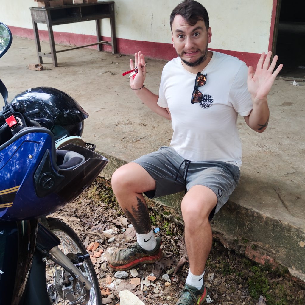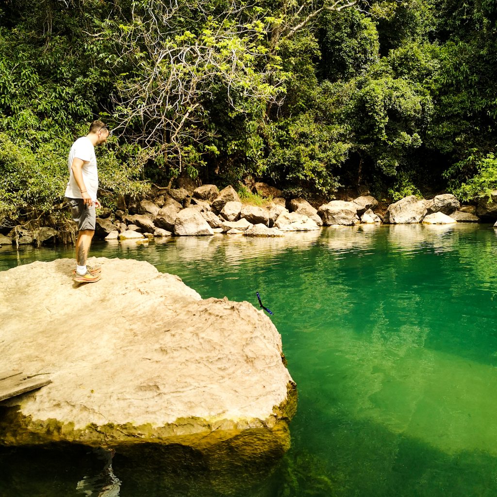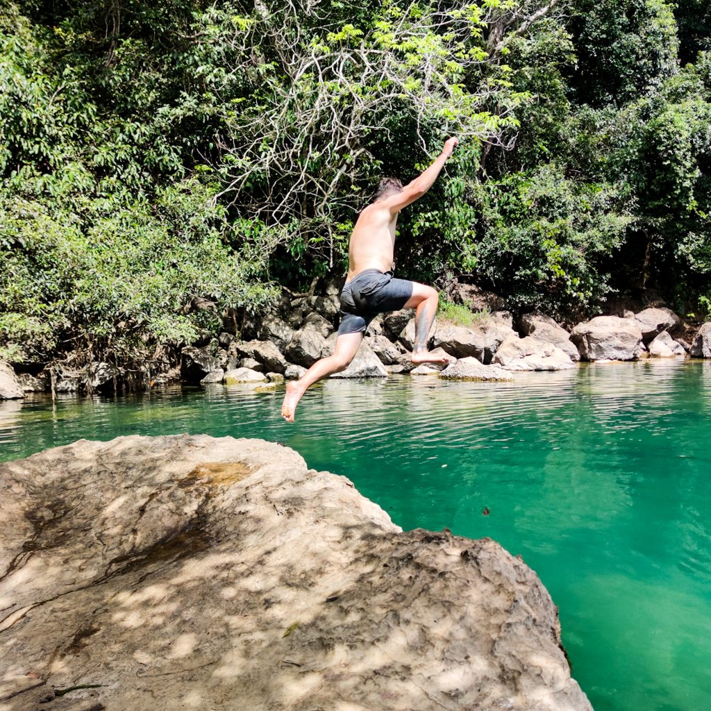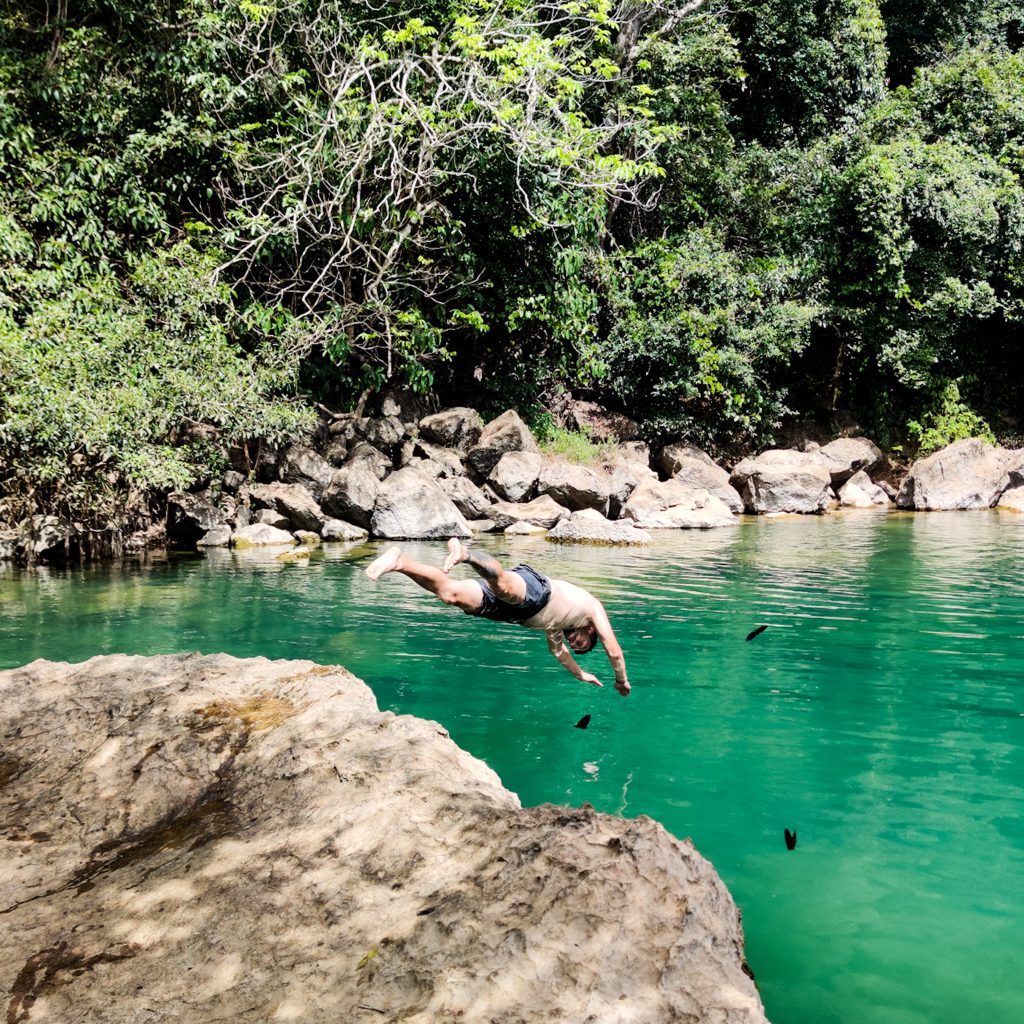 Wir haben heute insgesamt 130 km Strecke vor uns, deshalb fahren wir direkt weiter. Als Abwechslung zum Wasserfall gibt es heute einen „Cool Pool“. Dabei handelt es sich um eine kleine Lagune und die ist nicht etwa 😎 sondern eher ❄️. Außer uns ist noch eine laotische Familie mit Kindern und ein alleinreisender Spanier hier. Wir ziehen uns um und wagen uns ins kalte Nass. Hier ist das Wasser deutlich klarer und überall sind Fischis um uns herum. Es ist super erfrischend. Während Caro sich irgendwann wieder in die Wärme begibt und sehr froh ist, dass sie einigermaßen problemlos auf den Steg zurück klettern konnte, klettert Konsti auf den nächstgelegenen Felsen und springt ein paar Mal ins Wasser. Angefeuert wird er dabei von den Kindern der laotischen Familie. Wenn das mal kein süßes Publikum ist.