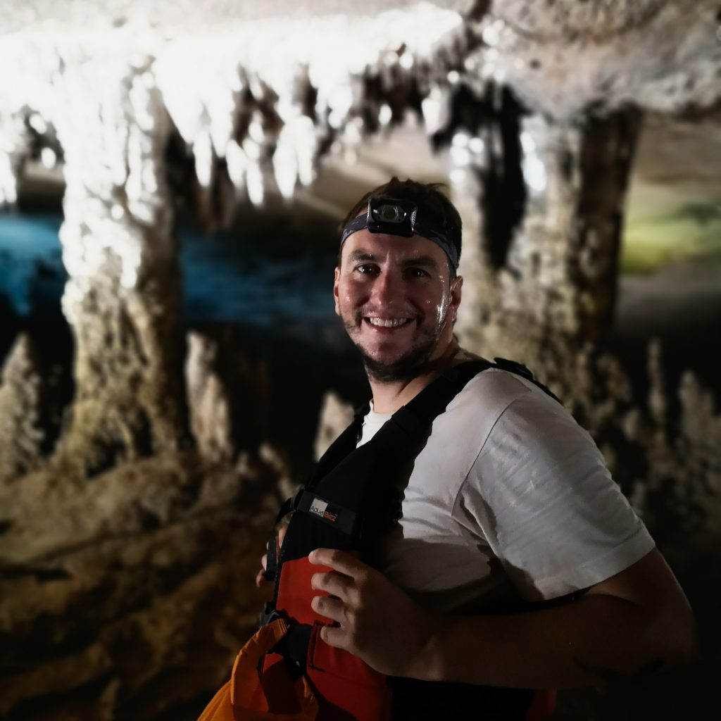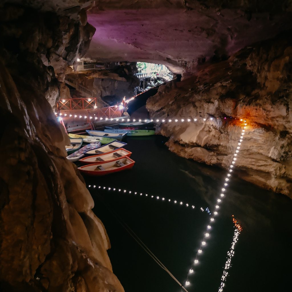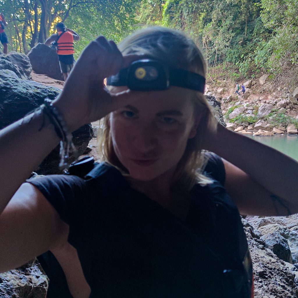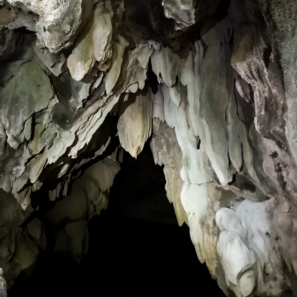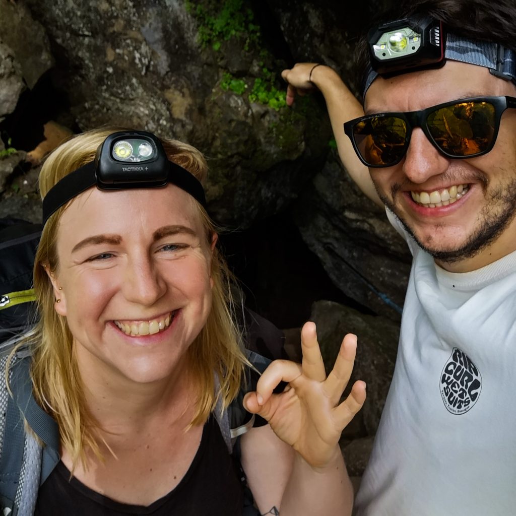 Ausgestattet mit unseren Stirnlampen begeben wir uns in die absolute Dunkelheit. Wir nehmen auf einem Holzboot Platz und los geht die Fahrt. Naja fast, denn unser Motor springt nicht an. Sehr beruhigend. Das Wasser ist hier zwar nicht tief, aber wer weiß, wie es irgendwo in der Höhle aussieht. Außerdem haben wir in den Google Rezensionen gelesen, dass erst vor Kurzem ein Kapitän in der Höhle verstorben ist. Auch eher so geht so beruhigend.