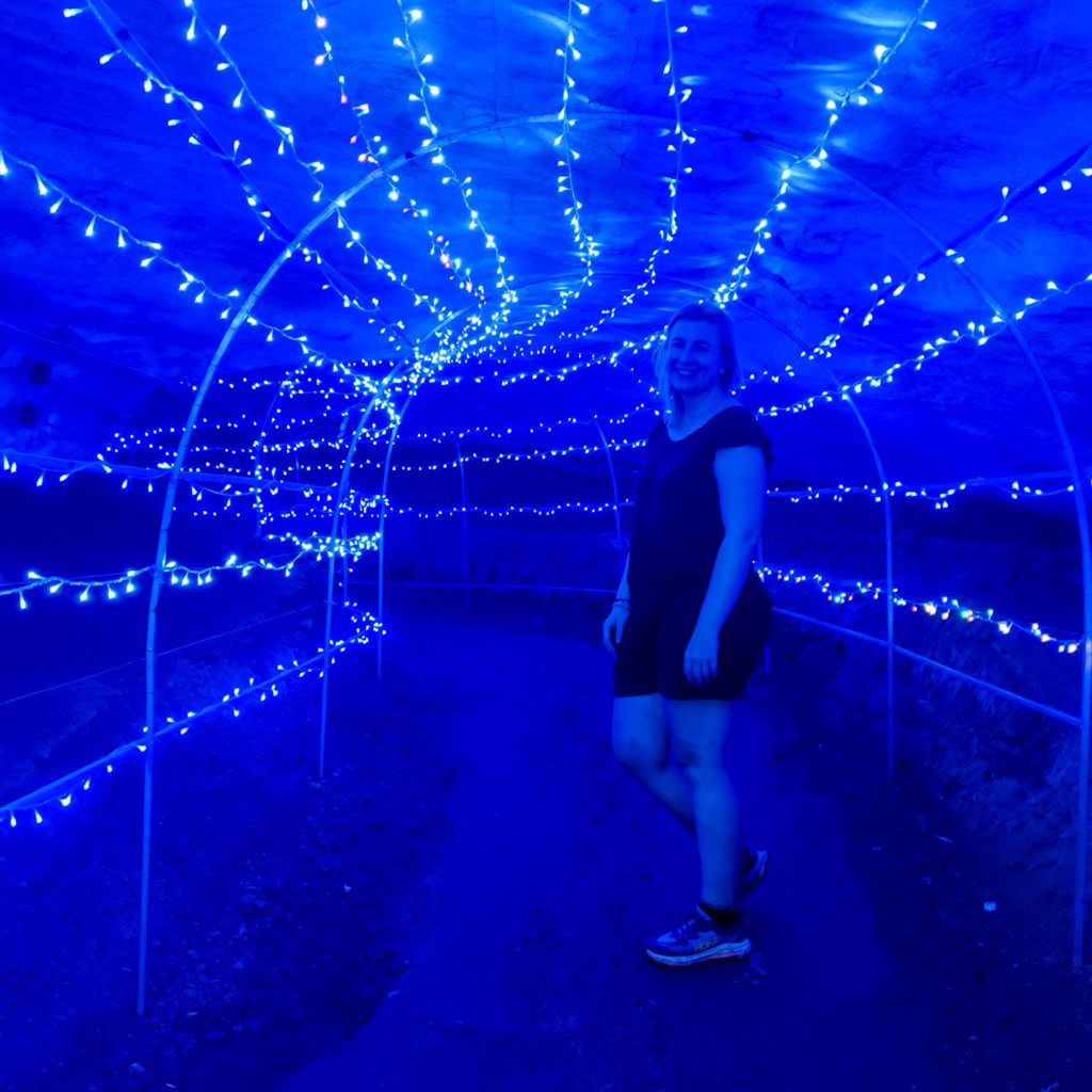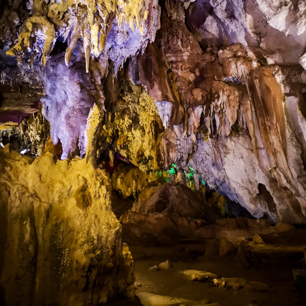 Nach unserem ersten, leicht gescheiterten Versuch, fahren wir weiter und halten wenig später bei der Tham Nang Aen. Hier sieht es wieder wesentlich touristischer aus und auch in den Bewertungen haben wir gelesen, dass die Höhle etwas kitschig und bunt ausgeleuchtet sein soll. Wir sind aber noch so früh dran, dass selbst der Ticketverkäufer noch verschlafen den Block mit den Tickets suchen muss und auch die Schranke zur Höhle noch geschlossen ist. Hier ist schnell klar – Adiletten sind hier kein Problem und eine Stirnlampe benötigen wir bei der festiven Beleuchtung ebenfalls nicht. Direkt am Anfang der Höhle gehen wir durch einen blau beleuchteten kleinen Lichtertunnel. Das ist weit entfernt von natürlicher und stimmungsvoller Beleuchtung. Weiter in der Höhle wird es etwas besser. Zwar wechselt die Beleuchtung ihre Farben, aber zumindest sieht es nicht mehr nach amerikanischer Weihnachts-Gartenbeleuchtung aus.