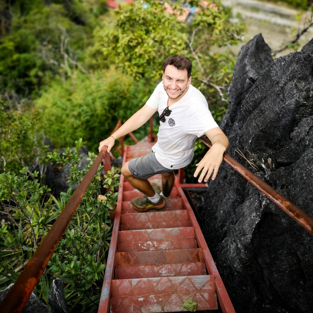 Wir steuern einen Aussichtspunkt an, aber stehen erstmal vor einem verschlossenen Tor. Ob hier noch alles geschlossen ist? Kein Mensch weit und breit zu sehen. Caro steigt vom Roller, das Tor ist nicht verschlossen, sie öffnet es und Konsti fährt durch. Wir folgen noch etwas dem Weg. Was wahrscheinlich mal eine Unterkunft mit Restaurant war, sieht jetzt geschlossen aus. Das ehemalige Schwimmbad gleicht eher einem lost place. Alles sieht heruntergekommen aus und mal wieder können wir uns nicht vorstellen, wie es zu Hochzeiten hier ausgesehen haben muss. Wenn es die überhaupt gab. Wir spotten eine Art Treppe am Berg und parken unseren Roller. Hier stört es ausnahmsweise niemanden, wenn wir unser lautstarkes Rollerschloss nicht schnell genug bedienen. Es stört zwar niemanden, aber genauso wenig würde es jemand mitbekommen, wenn jemand unseren Roller einfach mitnimmt. Wirkliche Sorgen machen wir uns aber nicht. Dann mal los. Es geht auf einer Mischung aus Treppe und Metallbrücke steil bergauf. Die einzelnen Stufen bzw. Streben sind etwas weiter auseinander, richtig vertrauensvoll sieht es nicht aus. Zwischendurch müssen wir uns an Felsen vorbei drücken. Obwohl es immer noch recht früh ist, schwitzen wir arg. Der Schweiß tropft uns aus dem Gesicht. Aber irgendwie macht es auch Spaß und wir sind gespannt auf die Aussicht. Und die ist wirklich super schön. Von einer kleinen Plattform haben wir auf der einen Seite einen Blick ins Tal, wir sehen die Straße unseres Loops, die kleinen Dörfer und natürlich das gruselige Geister-Schwimmbad. Zur anderen Seite sehen wir die schönen Karstfelsen. Sie sind dunkelgrau, sehr spitz und scharfkantig. Konsti vergleicht es sehr passend mit der Maske der Nasgul (Herr der Ringe lässt grüßen). Wir stellen mal wieder fest, eine schöne Aussicht – lieben wir!