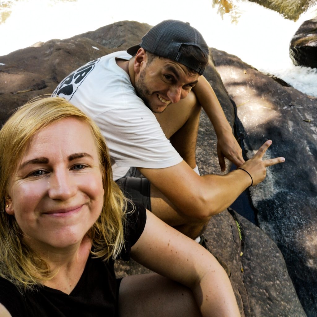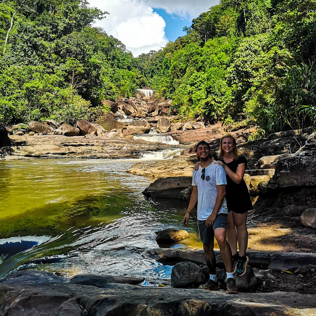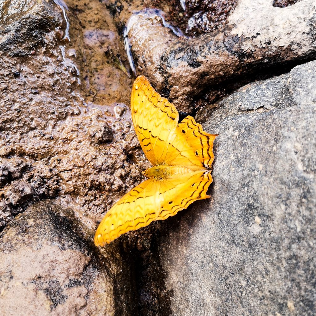 Irgendwann kommen wir am Ende der Straße an. Wir parken den Roller und folgen einem Trampelpfad. Der endet allerdings vor einem zugewachsenen Abgrund. Also wieder zurück und einen anderen Weg suchen. Entlang des Wassers (das kann ja beim Ziel, einen Wasserfall zu finden, nicht verkehrt sein) stoßen wir auf ganz viele bunte Schmetterlinge. Viele kleine gelbe, große orangefarbene und riesige dunkle Schmetterlinge flattern um uns herum. Wir kreuzen den Fluss über eine wackelige Brücke und klettern dann über ein paar Steine, bis wir dann beim Wasserfall sind. Es sind wieder eher größere Kaskaden, aber es ist trotzdem sehr schön hier. Außer uns ist keine Menschenseele da und wir suchen uns ein schönes Plätzchen auf den Steinen. In den Google Rezensionen haben wir gesehen, dass man auch von einem großen Stein springen kann. Aber das Wasser ist alles andere als klar und wer weiß schon, zu welcher Jahreszeit die anderen wo genau ins Wasser gehüpft sind.. Konsti verzichtet also sicherheitshalber auf den Spaßfaktor.