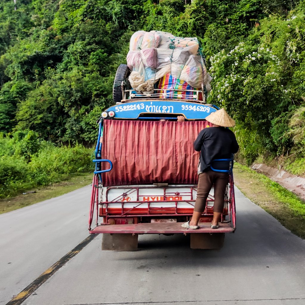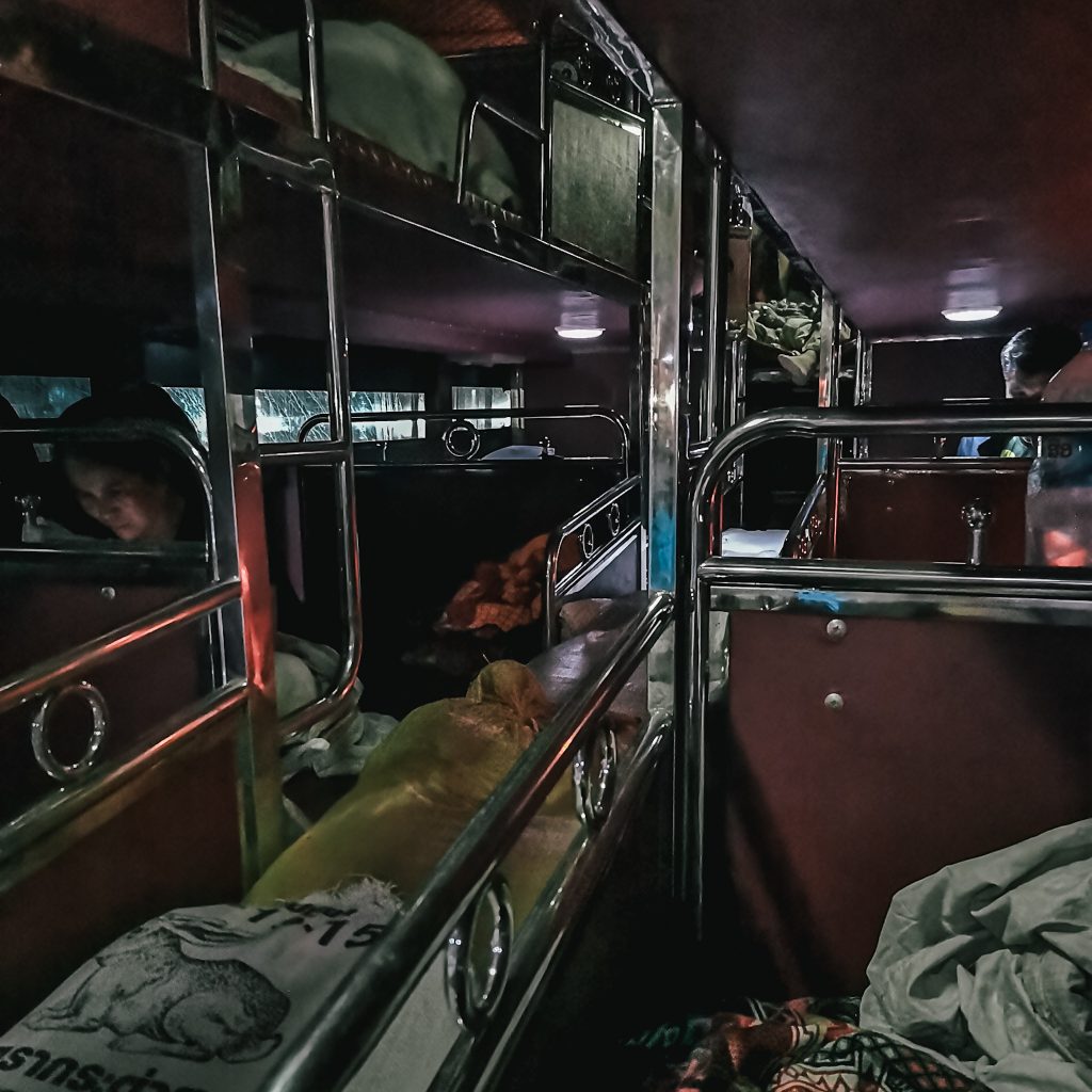 Irgendwann ist er scheinbar erfolgreich, drückt uns zwei Tickets in die Hand, sagt, dass der Bus in einer halben Stunde kommt und verabschiedet sich. Auf den Tickets steht sonst nichts weiter drauf. Irgendwann kommt ein Bus und die Leute drängeln sich vor der Türe. Es sind fast nur Einheimische. Wir fragen nach und ja, es ist der richtige Bus. Aber warum quetschen sich alle? Naja, wenn wir eins gelernt haben, dann ist es, dass man meistens genau das machen muss, was auch die Einheimischen machen. Caro stellt sich mit den Tickets also in die Traube, während Konsti sich um das Einladen der Rucksäcke kümmert. Caro ahnt Böses, es stehen schließlich keine Plätze auf den Tickets. Beim Einsteigen werden erstmal die Schuhe, in unserem Fall die Adiletten ausgezogen. Es ist schon relativ voll und damit auch eng im Bus. Der Gang ist so schmal, dass man gerade so durchpasst. Auf dem Boden liegen lauter Reissäcke und was auch immer, man muss darüber laufen, der Gang ist sowieso schon niedrig, jetzt muss man sich noch mehr bücken. Caro ist bereits ziemlich weit hinten und hat noch kein freies Bett gesichtet. Ein Mitarbeiter scheint die Plätze zuzuweisen. Als Caro ihm zu Verstehen gibt, dass wir zu zweit sind, pustet er erstmal seine Backen voll mit Luft und schaut sich um. Dann krabbelt er unten aus einem Bett hervor, springt auf die andere Seite und unterhält sich mit dem halben Bus. Erst dann merkt Caro, dass Konsti mittlerweile hinter ihr ist. Er wurde netterweise vorgelassen. Wir sollen wieder mit nach vorne. Er scheint uns tatsächlich ein eigentlich schon belegtes Bett freigemacht zu haben. Seeehr zur Erleichterung von Caro. Sie hat sich nämlich schon Löffelchen an Löffelchen mit einem fremden Laoten das Bett teilen sehen. Und die Betten sind wirklich sehr schmal und unsere Tagesrucksäcke teilen sich ja schließlich auch noch das Bettchen mit uns. Wir schlafen in der Nacht ganz okay. Caro wacht zwischendurch auf und ist kurz verwundert, direkt neben ihr liegt ein Mann auf dem Gang und schläft auf den Säcken. Das dürfte noch etwas unbequemer sein, als die harten Matratzen, auf denen wir liegen.