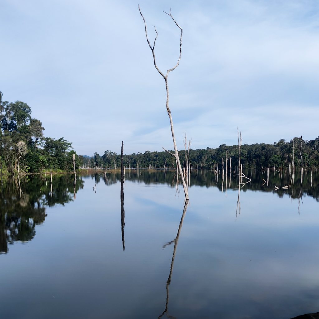 Kurz nach dem Losfahren kommen wir zum ersten Aussichtspunkt. Er liegt direkt an der Straße und wir blicken auf die schönen Seen. Aus diesen ragen eine Vielzahl an Bäumen bzw. abgestorbene Stämme aus dem Wasser. Besonders im morgendlichen Sonnenlicht sieht das echt schön aus.