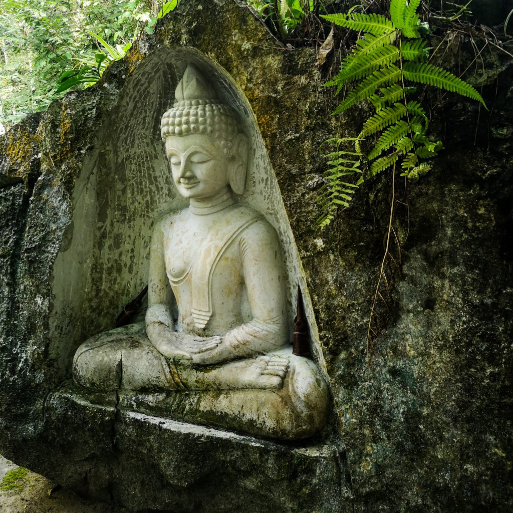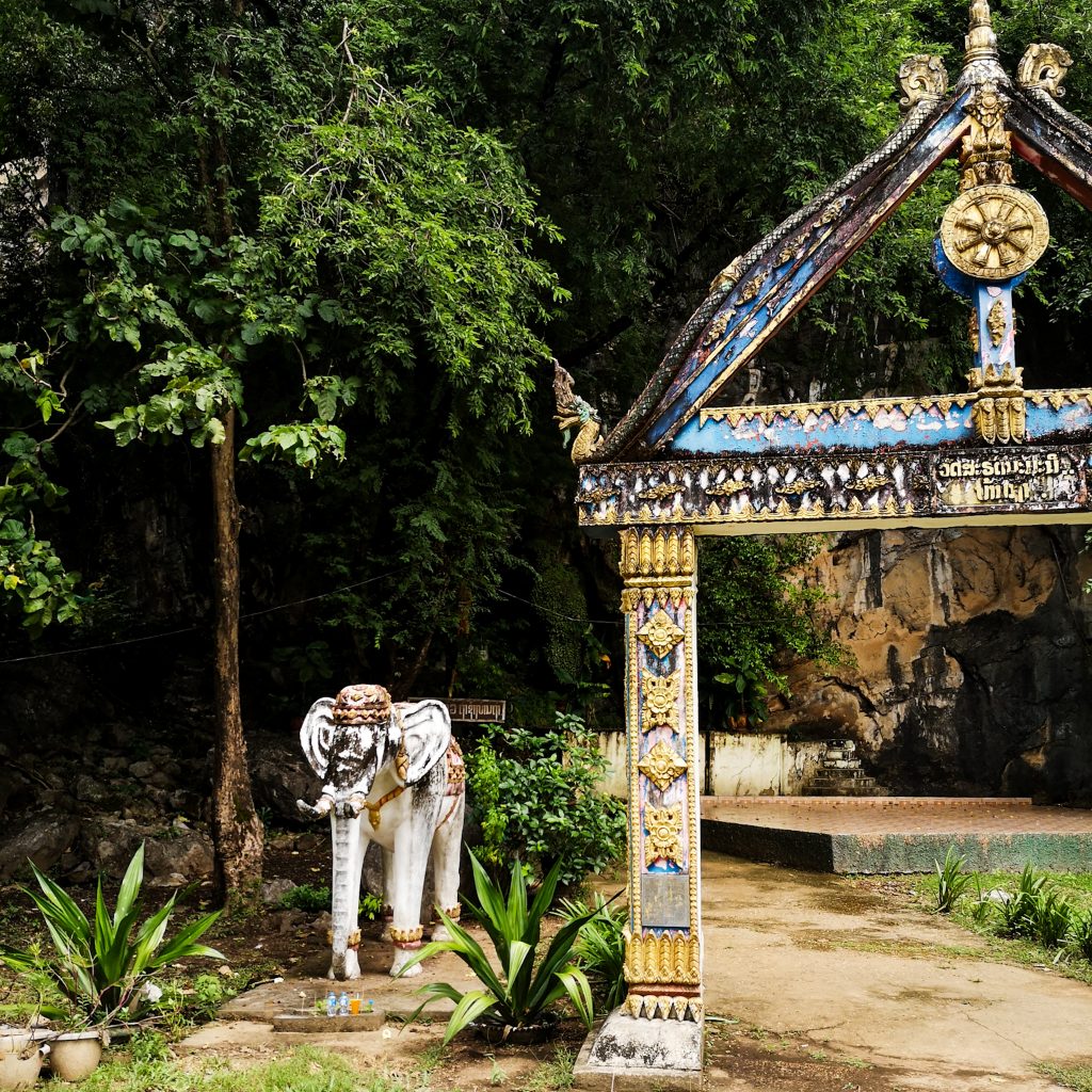 Beim Frühstück erfreuen wir uns wieder an dem selbstgebackenen Brot und der tierischen Gesellschaft, die mal wieder hoffnungsvoll neben uns sitzt. Im Anschluss machen wir uns auf den Weg zurück nach Thakhek. Unterwegs legen wir nochmal einen Kaffee-Stopp in dem Café vom Hinweg ein. Danach genießen wir noch ein letztes Mal die schöne Landschaft und machen noch einen Zwischenstopp bei der Elephant Cave. Zwei Elefanten bewachen hier das Tor zur Höhle, wir erklimmen ein paar Stufen und laufen in die Höhle. Hier ist es allerdings ziemlich hell. Vorne am Eingang der Höhle sind ein paar hinduistisch aussehende Figuren, weiter hinten sind Buddha Figuren platziert. Hier wurde selbstverständlich wieder an den kleinen Hunger/Durst gedacht – selbst in der kleinsten Höhle sind immer Opfergaben zu finden.