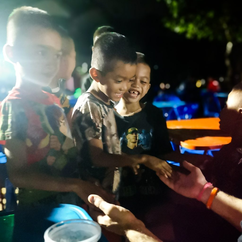 Neben uns sind die Kinder damit beschäftigt ein kleines Blumengesteck zu basteln. Wie fragen nach und erfahren, dass heute auch hier das Festival im Dorf stattfindet. Eine Art Boatrace, bei denen die kleinen Blumengestecke in den Fluss gesetzt werden. Es gibt auch Musik, Essen und Getränke. Er lädt uns ein, später mitzukommen. Sicherheitshalber essen wir noch in der Unterkunft und gehen dann gemeinsam mit mit einem weiteren Gast aus Argentinien mit ins Dorf. Beim Fluss ist kaum etwas zu sehen, es ist schon sehr dunkel. Das erste Mal seitdem wir in Laos sind, werden wir hier von Kindern um Geld angebettelt.