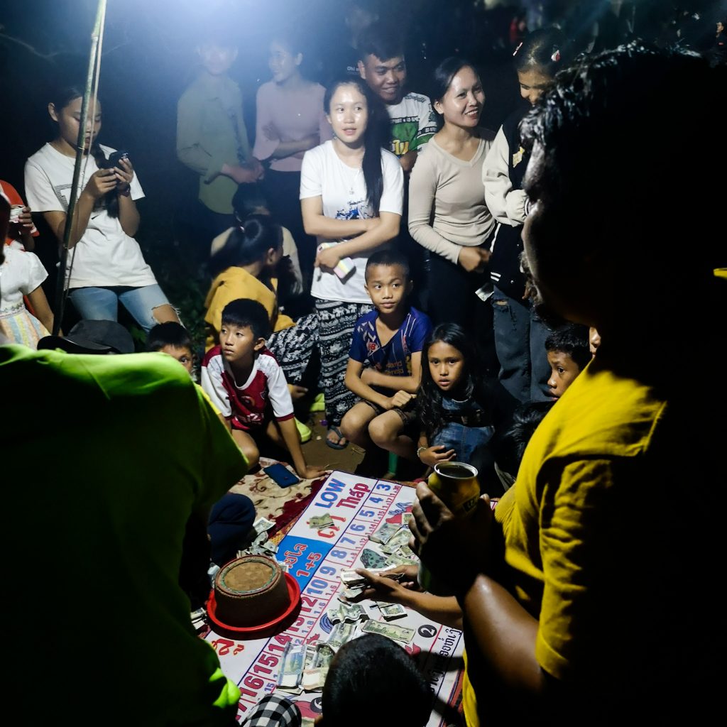 Im Dorf selbst ist das Treiben etwas wilder. Es gibt eine Art Glücksspiel für Kinder, ein paar Straßenstände und an einer anderen Ecke spielen die Erwachsenen. Es gibt gerade eine Ansprache, der Besitzer unserer Unterkunft übersetzt: Es soll gefeiert werden, aber bitte nicht zu wild und ohne Schlägereien. Ach Laos, gewisse Dinge sind schon überall gleich. Besonders aufm Dorf. Wir besorgen ein Bier. Das ist allerdings warm. Eis und Plastikbecher könnten wir auch noch bekommen, aber mal ehrlich? Bier mit Eis? Darüber hinaus ist der Genuss hier auch risikobehaftet. Wir entscheiden uns schweren Herzens für das warme Bier. Ein paar Kinder turnen um uns herum und zwei thailändische Touristen gesellen sich zu uns. Wir versuchen uns zu unterhalten, aber die Musik ist wahnsinnig laut und man versteht kein Wort. Wir bleiben noch ein bisschen und gehen dann zurück in die Unterkunft.