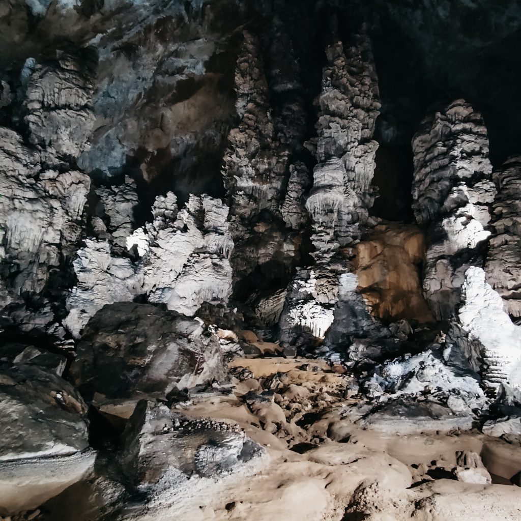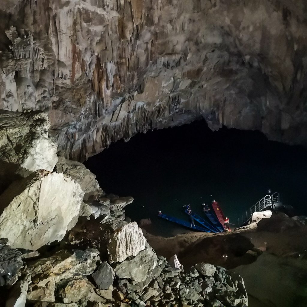 Nach mehreren Versuchen müssen wir umsteigen, unsere Kapitäne können kein Englisch, geben uns aber zu verstehen, dass wir erstmal mit den anderen zwei Gästen weiterfahren und dann in ein anderes Boot umsteigen. Na gut, dann steigen wir mal in das Boot mit den anderen beiden Gästen. Kleine Randnotiz: Das Boot steht schon neben uns und die Frau schöpft schon fleißig Wasser aus dem Boot. Das scheint normal zu sein. Es geht auf jeden Fall endlich los, allerdings nur kurz, denn nach ca. 3 Minuten Fahrt in der Dunkelheit legen wir an. Wir befinden uns an einer Stelle mit hohen Decken und tollen Tropfsteinen. Dieser Teil ist ausgeleuchtet und wir können über eine Treppe auf eine kleine Erkundungstour gehen. Wahnsinn, welche Dimensionen diese Höhle hat. Damit haben wir absolut nicht gerechnet.