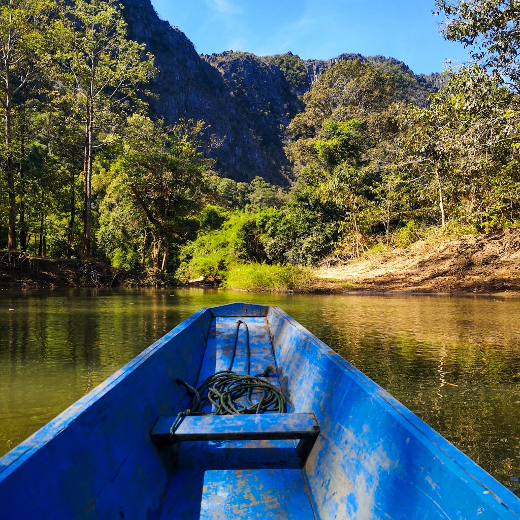 Wir sind früh auf den Beinen. Der heutige Vormittag ist voll und ganz der Kong Lor Höhle gewidmet. Sie ist 7,5 km lang und kann per Boot durchfahren werden. Die größte Ausdehnung erreicht die Höhle mit 90 Metern Breite und 100 Metern Höhe. Besichtigt werden kann sie nur in der Trockenzeit, da sonst die Höhle geflutet ist und es zu gefährlich ist. Es ist obligatorisch, sie mit einem Bootsführer zu durchqueren. Als die Bevölkerung 1920 Hausenten aus der Höhle kommen sah, wurde ihnen klar, dass der unterirdische Fluss mit einem anderen Dorf verbunden sein musste, und sie begannen eine Expedition mit einem Ruderboot. Sie suchten stundenlang in einer pechschwarzen Höhle, von der sie glaubten, dass sie von Geistern bewohnt sei. Schließlich erreichten sie das Ende der Höhle und das Dorf Natane.