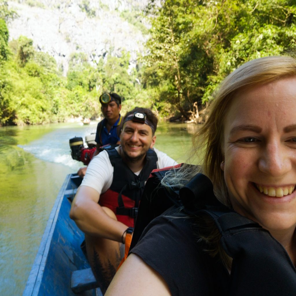 Wieder zurück am Anleger wartet unser Bootsführer mit neuem Motor wieder auf uns. Gut, dass Konsti sich sein Gesicht gemerkt hat. Es geht zu dritt weiter in der Dunkelheit. Wieder dauert die Fahrt nicht so lange. Wir werden erneut rausgelassen und dürfen eine größere Halle in der Höhle anschauen. Auch dieser Teil ist ausgeleuchtet und sehr beeindruckend. Komischerweise schwitzen wir ganz schön, obwohl es uns gar nicht so heiß vor kommt. Wir kehren nicht etwas zum gleichen Anleger zurück, sondern werden an anderer Stelle wieder eingesammelt. Die folgenden 20 Minuten fahren wir durch die vollkommene Dunkelheit. Man hört nur das Geräusch der Bootsmotoren. Mit unseren Stirnlampen schauen wir uns um. Manchmal wird die Strömung stärker, wir fahren vom links nach rechts und weichen immer wieder Felsen aus, die aus dem Wasser ragen. Es ist wirklich ein komisches Gefühl, durch diese vollkommene Dunkelheit zu fahren. Irgendwie ist es aber auch ganz cool. Gegen Ende müssen wir noch einmal aussteigen und etwas durchs Wasser waten, damit die Bootsführer eine kleine Stromschnelle mit Anlauf hochschießen können. Dann geht es raus aus der Höhle, wir legen an und machen kurz Pause im Dorf. Die Rückfahrt erfolgt dann auf gleichem Weg, nur mit der Strömung und ohne Ausstieg.