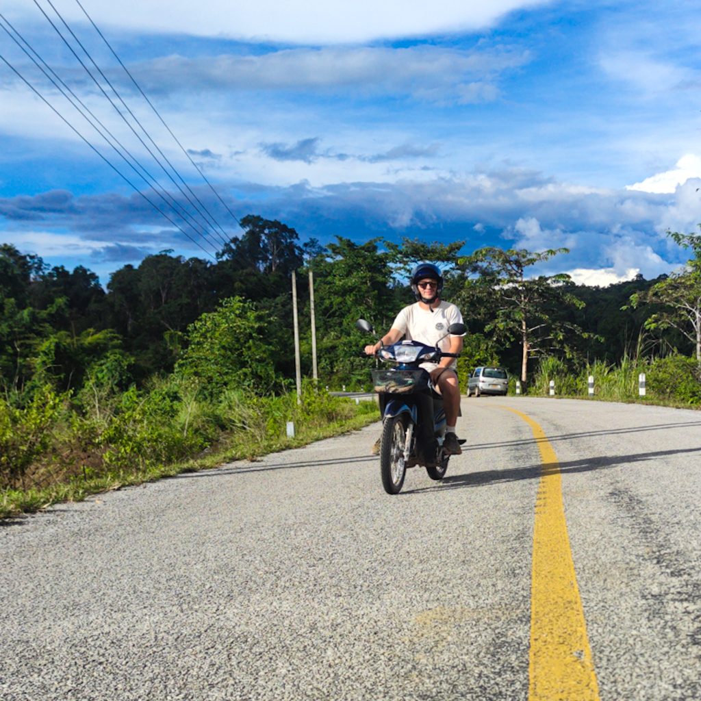 Übrigens: Es ist möglich, seinen Roller mit aufs Boot zu nehmen und sich auf der anderen Seite absetzen zu lassen. Von dort kann man ebenfalls den Loop zu Ende fahren, quasi die Abkürzung. Allerdings soll die Strecke aufgrund der Straßenverhältnisse schwierig zu fahren sein. Darüber hinaus haben wir in den Rezensionen gelesen, dass der Roller auf der Fahrt oft leidet und Kratzer abbekommt. Das wollen wir uns auf jeden Fall ersparen. Stattdessen planen wir, die gleiche Strecke zurück zu fahren. Wir könnten den Loop auch richtig Westen weiterfahren, allerdings würden wir dann eine weite Strecke entlang des Highways fahren und es gäbe nicht mehr viel dort zu sehen und der Verkehr mit den vielen LKWs soll eher so semilustig sein. Wir entscheiden uns also für die längere aber schönere Strecke. Ebenso freuen wir uns wieder auf das Bungalow Homestay, im dem wir bereits die erste Nacht verbracht haben. Den Hunden dort haben wir quasi auch versprochen, dass wir wiederkommen.