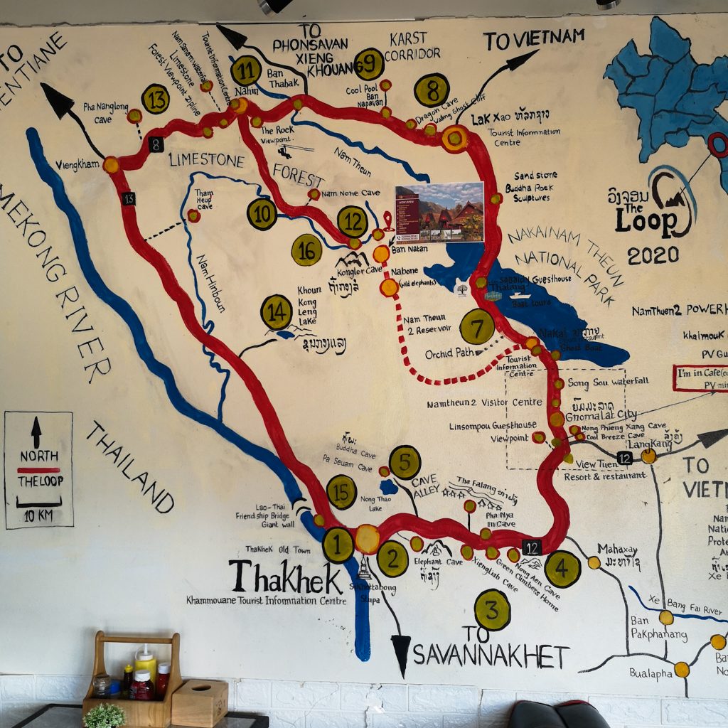 Wir kommen in unserem Hostel an und werden nett vom Besitzer in Empfang genommen. Wir erkundigen uns direkt nach dem Thakhek-Loop und er erklärt uns anhand einer großen Karte auf der Wand, worauf wir achten müssen. Der Thakhek-Loop ist eine der berühmtesten Motorrad- bzw. Rollertouren in Laos. Der gesamte Loop umfasst 450 km und wird in der Regel in 4 Tagen befahren. Die Umgebung ist geprägt von einem Karstgelände mit vielen Höhlen. Die wohl spektakulärste hiervon ist die Kong Lor Höhle, durch die man mit einem Boot komplett durchfahren kann. Die Tourist:innen, die nach Thakhek kommen, machen dies meist nur, um den Loop zu befahren, die Stadt selbst hat ansonsten nicht besonders viel zu bieten. Der freundliche Besitzer des Hostels stellt uns eine Karte bei Google Maps zur Verfügung, in der alle wichtigen Highlights markiert sind. Inklusive der Police Scams, die sich noch in Thakhek befinden, wie praktisch!