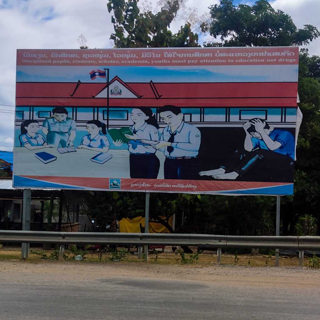 Berg runter sind wir deutlich schneller. Wir fahren weiter zu einem kleinen Café, welches nur ein paar Minuten entfernt an einer Kreuzung liegt, von der aus man nach Vietnam abbiegen kann. Die vielen LKWs, mit denen wir uns die Strecke bis hierhin geteilt haben, biegen zum Glück zum Großteil Richtung Vietnam ab. Gegenüber vom Café fällt uns noch ein Schild ins Auge:“Disciplined pupils, students, scholar, academia, youths must pay attention to education not drugs.“ Solche Schilder haben wir schon echt oft in Laos gesehen, vor allem an Gebäuden von öffentlichen Einrichtungen wie Schulen, Behörden oder Polizeistationen. Bei ein bisschen Recherche zu dem Thema stößt man schnell darauf, dass Laos lange Probleme mit Drogen hatte. Grund ist vor allem die Durchsetzung der Gesellschaft mit Opium aufgrund des Opiumanbaus im 19. Jahrhundert.