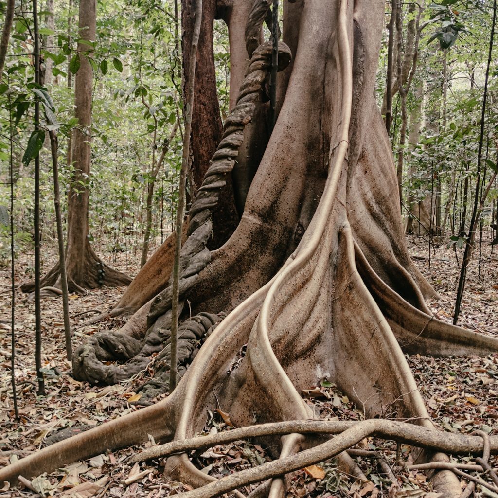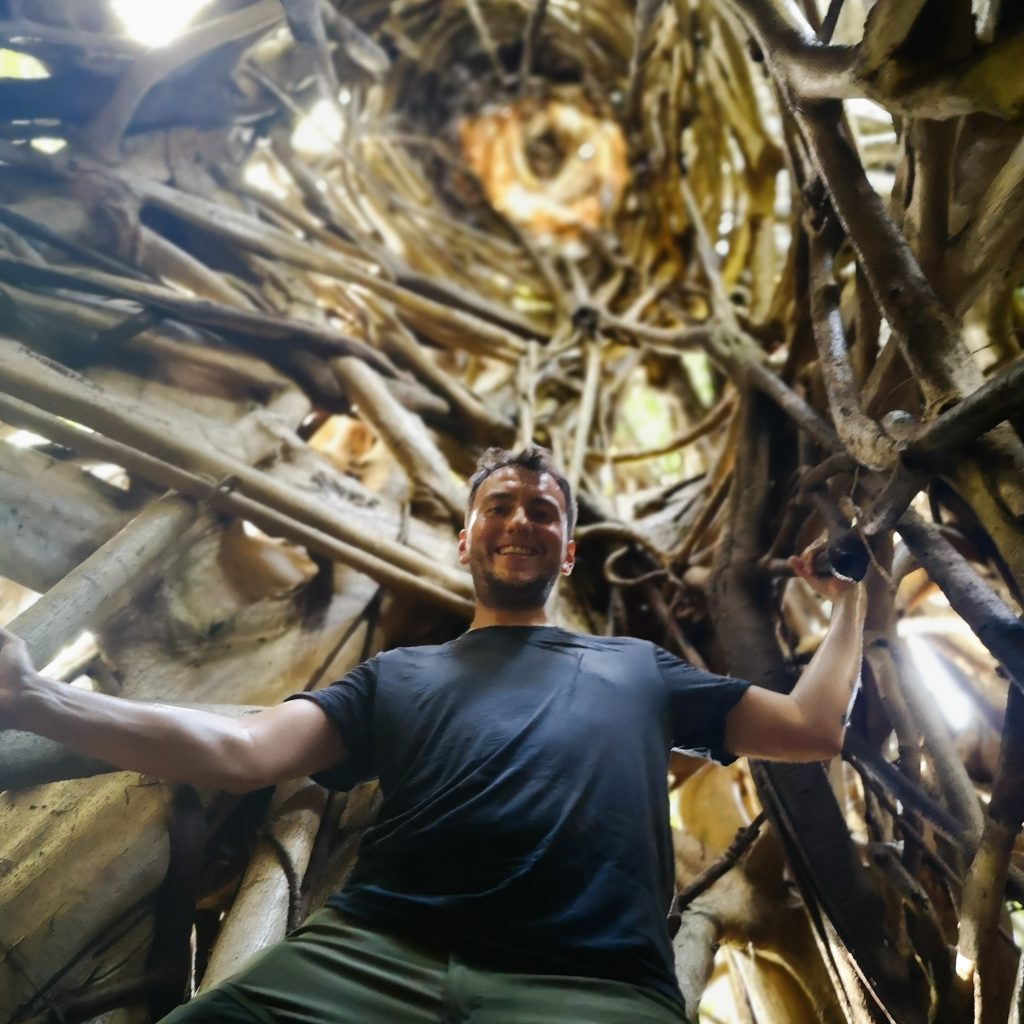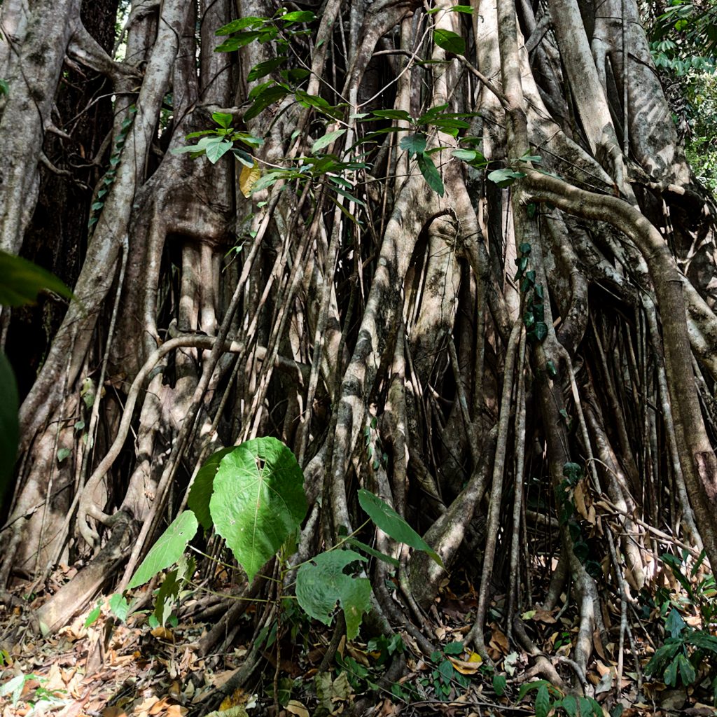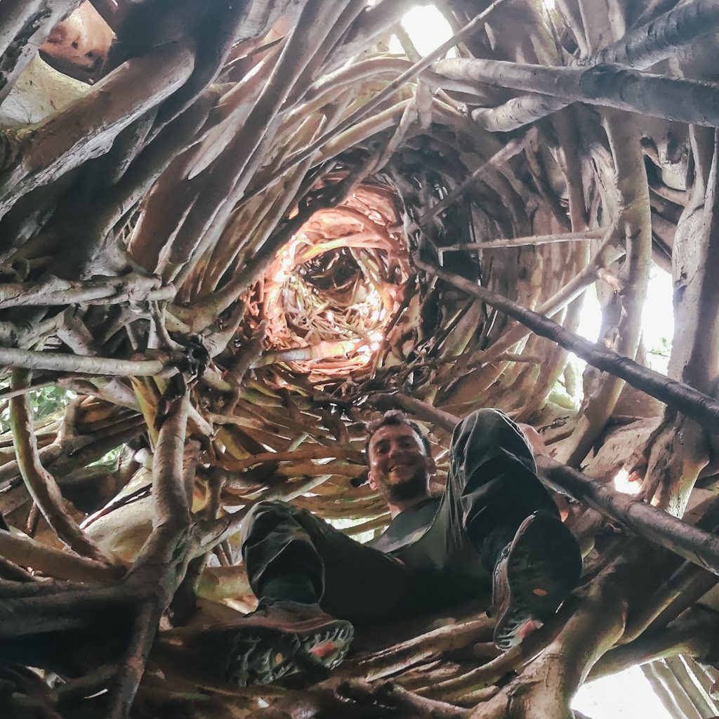 Es geht weiter, Hügel herauf, Hügel herunter. Ein ganz schönes Stück müssen wir zurücklegen, bis wir beim Ziel angekommen sind. Es ist ein riesiger Fikus-Baum, dessen Wurzeln sich geschmeidig um den Stamm wickeln. Das beste kommt aber noch, denn der Baum ist von innen hohl und gleicht von Innen einem senkrechten Kletter-Tunnel. Wir können problemlos „eintreten“ und staunen nicht schlecht. Konsti drückt Caro die Kamera in die Hand und schwuppdiwupp klettert er den Baum von innen hoch. Es ist ganz und gar nicht dunkel, das Licht ist warm und stimmungsvoll. Ein kleiner, natürlicher Kletterpark, der uns ganz schön ins Schwitzen bringt. Langsam sind wir echt kaputt und müde.