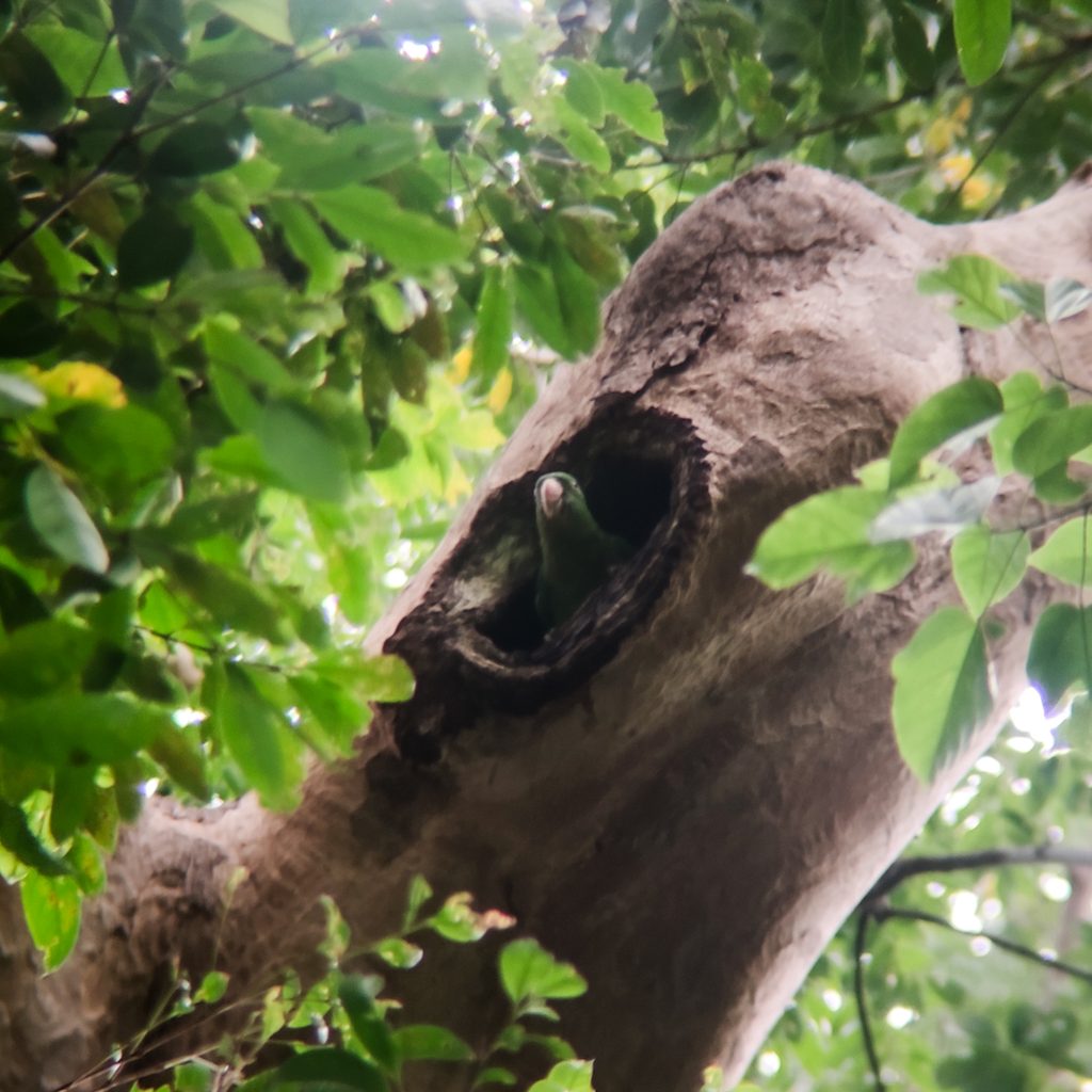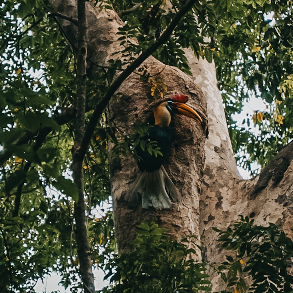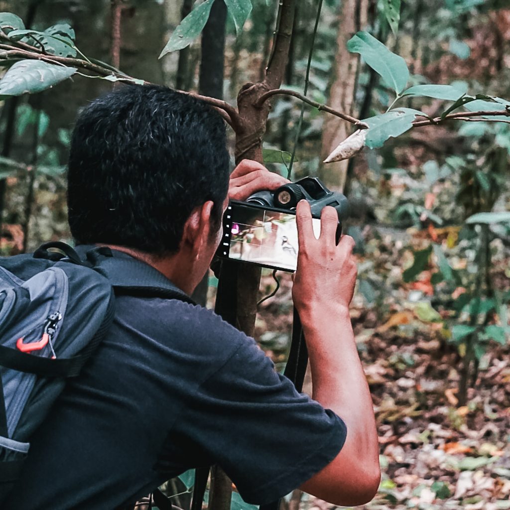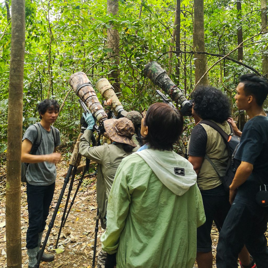 Wir ziehen weiter zum nächsten Spot, wo wir wieder auf die anderen Gruppen treffen. Alle sollen es sich auf dem Boden bequem machen, jetzt heißt es warten. Keiner der Guides behält das Nest des Nashornvogel, weit oben in den Bäumen im Auge. Warum? Das klärt sich spätestens als das imposante Tier zum Ladeanflug ansetzt. Schon von weitem hört man ein Drohnen-artiges Geräusch. Der Nashornvogel kommt von seiner Futtersuche zurück und versorgt seine Kinder. Die Vogelart zählt zu den Höhlenbrütern. Sie nutzen entweder natürliche Baumhöhlen oder (seltener) Felsenhöhlen. Der Eingang zur Nisthöhle wird vom brütenden Weibchen bis auf einen schmalen Spalt versiegelt. Wir schauen alle gespannt zu und machen ein paar Fotos. Kommen wir zu diesem Zeitpunkt nochmal auf sie singapurische Reisegruppe zu sprechen. Diese taucht nun gut hörbar aus dem Dickicht auf. Neben den in Tarn-Outfits gekleideten Tourist:innen sind jede Menge Guides mit der Gruppe unterwegs. Sie tragen für jede/n Teilnehmer:in eine riesige Profi-Kamera mit riesigem Tele-Objektiv und zugehörigem Stativ. Diese werden nun ganz hektisch vor unserer Nase aufgestellt und eingestellt. Der Trick der lokalen Guides für die Touris, die keine Tele-Objektive mit sich schleppen, ist übrigens unten auf dem Foto zu sehen: Einfach die Handykamera vor das Fernglas halten.
