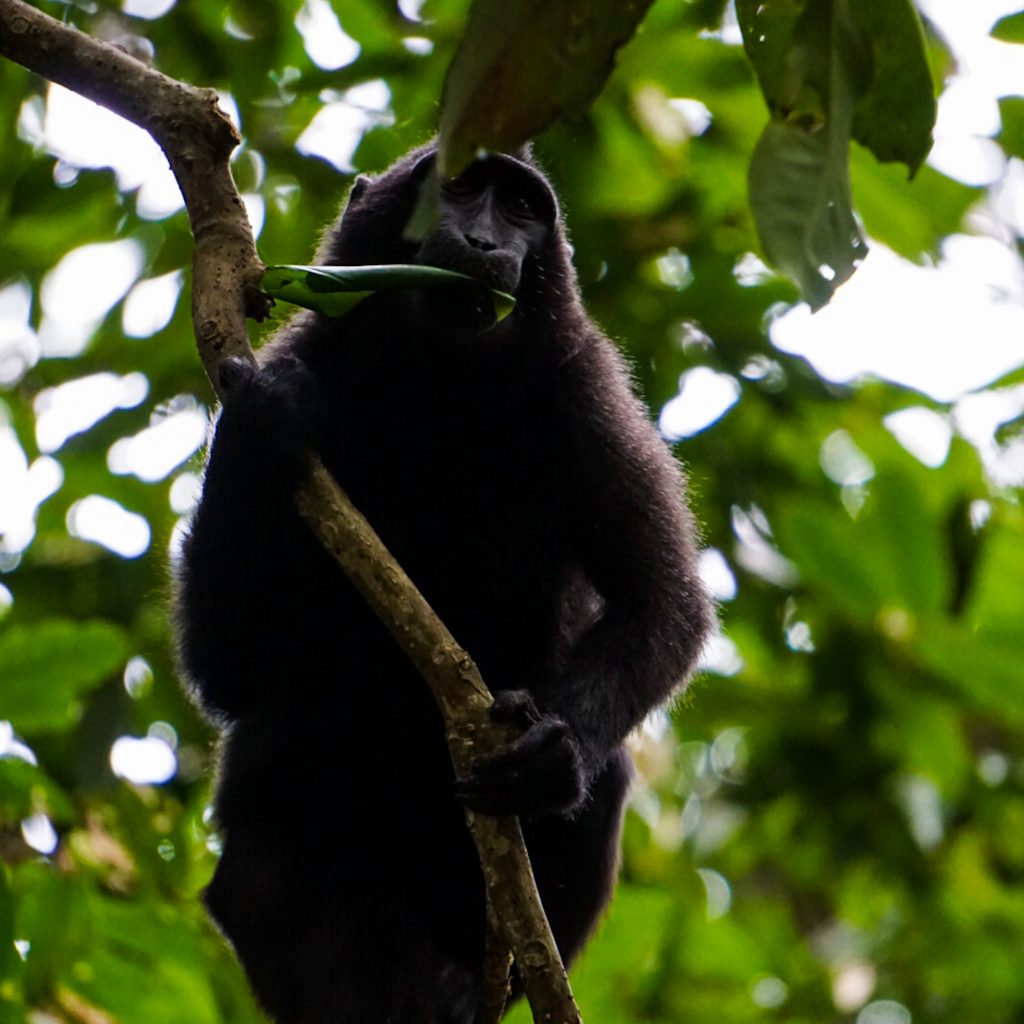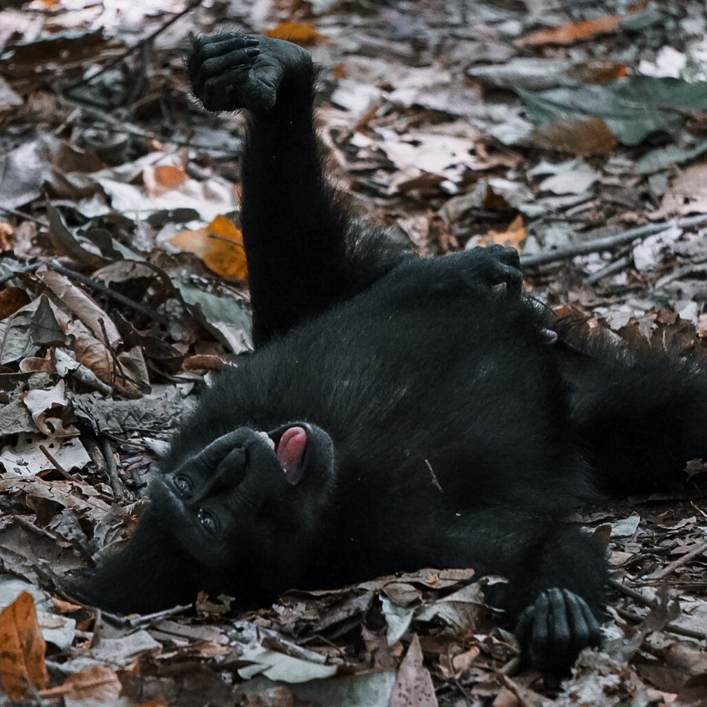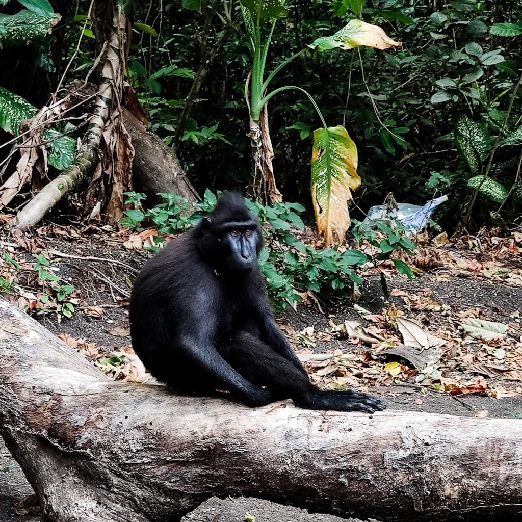 Der Schopfaffe oder Schopfmakak gehört zur Gattung der Makaken und lebt im Norden von Sulawesi sowie auf kleinen benachbarten Inseln. Ihr Fell ist mit Ausnahme einiger Haare im Schulterbereich tiefschwarz und das ein oder andere Exemplar verfügt über eine bessere Frisur als so manch ein Edgar-Friseur-Kunde. Die Population ging seit 1978 um 85 % zurück, der Großteil der Gruppen lebt derzeit im Tangkoko Nationalpark. Umso beruhigender, dass wir nach einem kleinen Vorspiel live bei der Zeugung weiterer Nachkommen dabei sind. Wir treffen jedenfalls ziemlich schnell auf eine große Gruppe von ca. 100 Tieren. Die Makaken sind wenig scheu und laut der Guides auch sehr sozial tolerant und sehr friedlich. Wir sind sozusagen mitten in der Gruppe, können die Tiere genau beobachten und begleiten die Affenbande auf ihrem Weg zum Strand. Während die anderen Tourist:innen weiterziehen, bleiben wir noch etwas und schauen den Tieren beim Spielen, Paaren und Unfug anstellen zu.