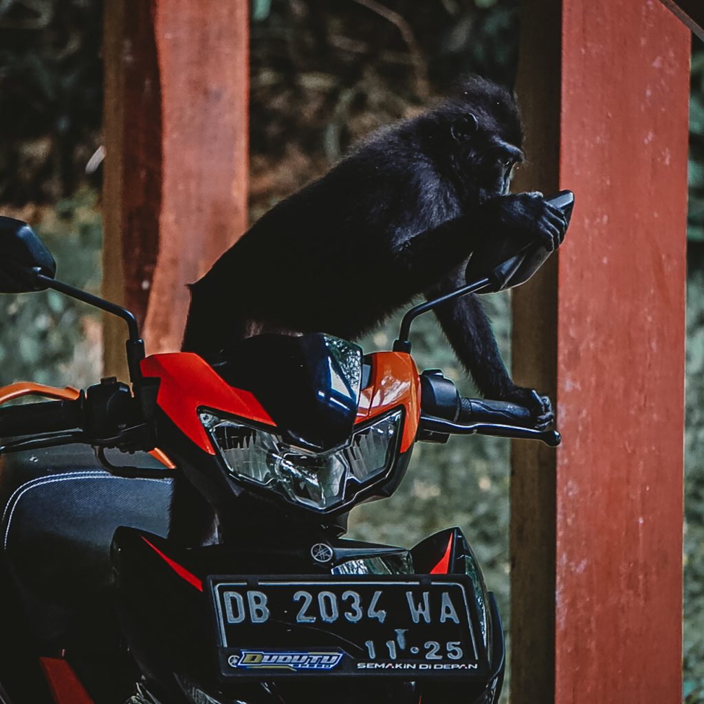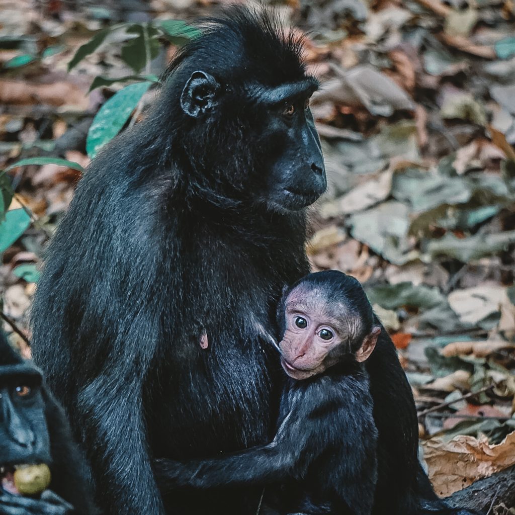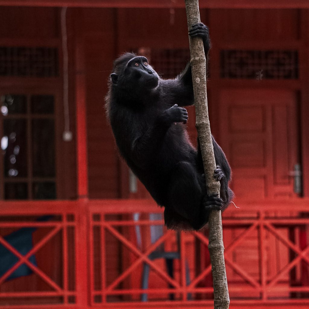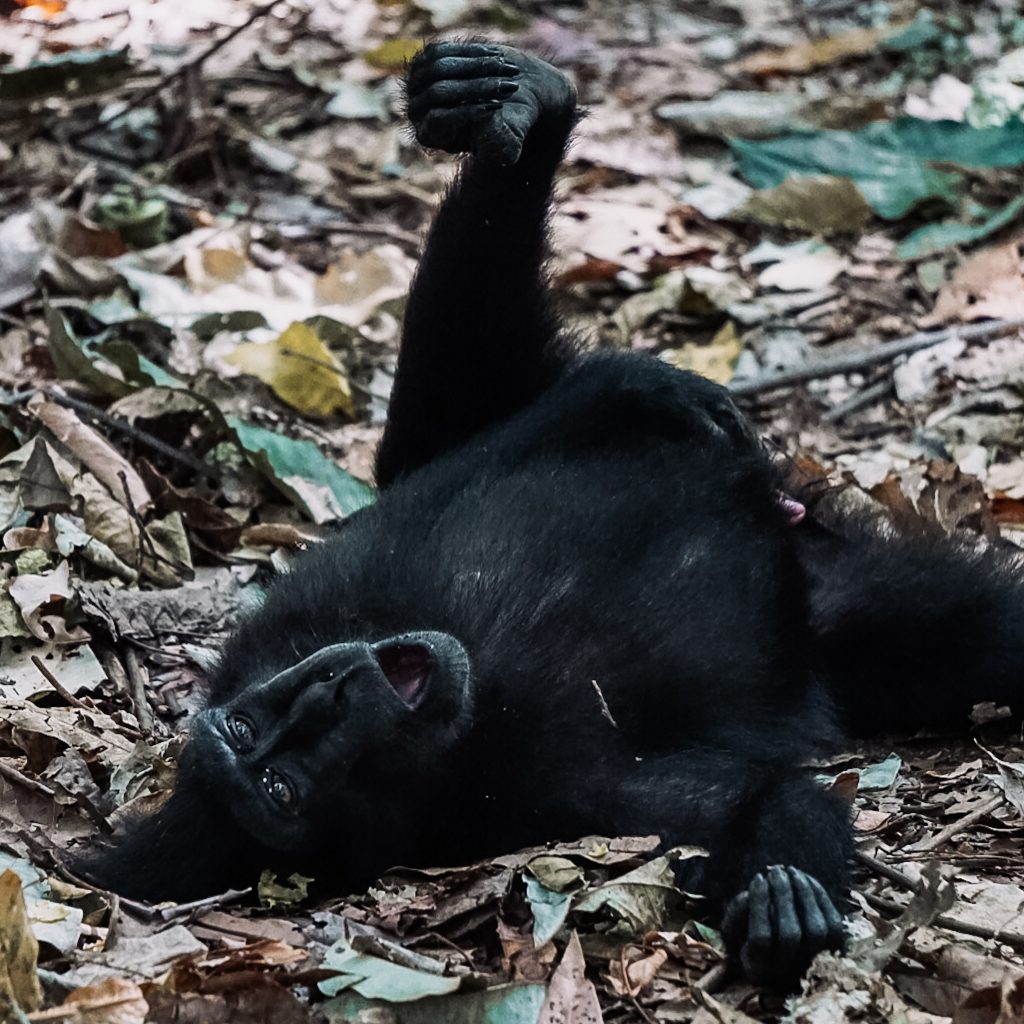 Der Schopfaffe oder Schopfmakak gehört zur Gattung der Makaken und lebt im Norden von Sulawesi sowie auf kleinen benachbarten Inseln. Ihr Fell ist mit Ausnahme einiger Haare im Schulterbereich tiefschwarz und das ein oder andere Exemplar verfügt über eine bessere Frisur als so manch ein Edgar-Friseur-Kunde. Die Population ging seit 1978 um 85 % zurück, der Großteil der Gruppen lebt derzeit im Tangkoko Nationalpark. Umso beruhigender, dass wir nach einem kleinen Vorspiel live bei der Zeugung weiterer Nachkommen dabei sind. Wir treffen jedenfalls ziemlich schnell auf eine große Gruppe von ca. 100 Tieren. Die Makaken sind wenig scheu und laut der Guides auch sehr sozial tolerant und sehr friedlich. Wir sind sozusagen mitten in der Gruppe, können die Tiere genau beobachten und begleiten die Affenbande auf ihrem Weg zum Strand. Während die anderen Tourist:innen weiterziehen, bleiben wir noch etwas und schauen den Tieren beim Spielen, Paaren und Unfug anstellen zu.