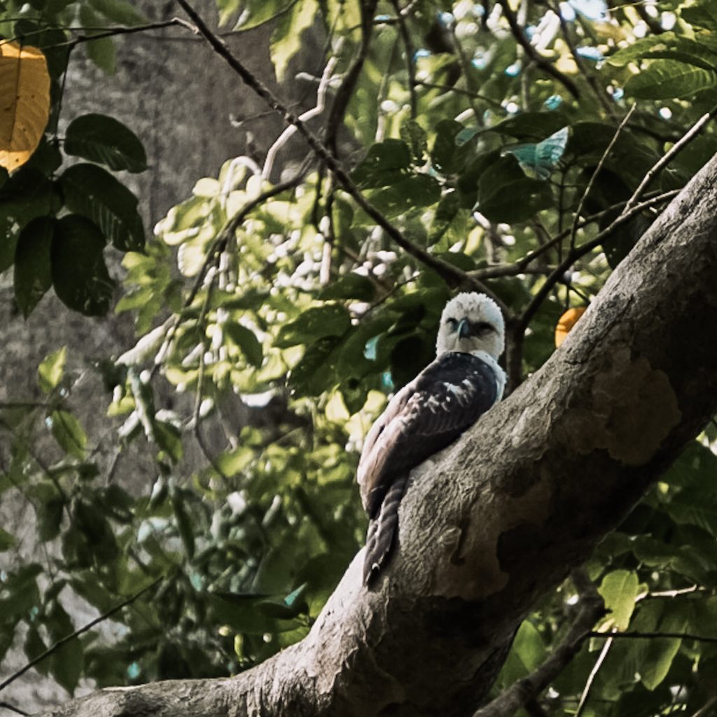 Wir ziehen weiter durch den Nationalpark. Anscheinend sind wir nun auf der Suche nach einer Eule. Sie versteckt sich allerdings hoch oben im Baum. Auf die lauten Geräusche aus der Musikbox unseres Guides antwortet sie zwar interessiert, aber vielleicht lautet ihre Antwort übersetzt auch so etwas wie: „Von euch lasse ich mich nicht hinters Licht führen, fotografiert gefälligst wieder die singapurische Reisegruppe.“ Als Ersatz erbarmt sich dafür der Sulawesi Hawk Eagle (quasi der Bruder vom Weißkopfseeadler), vor unserer Linse zu posieren. Der weiße Kopf wirkt allerdings weniger furchteinflößend als der seines Bruders, sondern eher wie ein puffiges Häubchen.