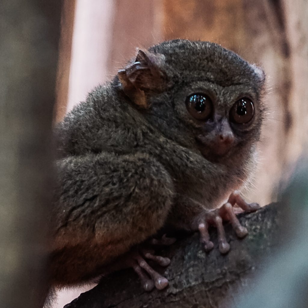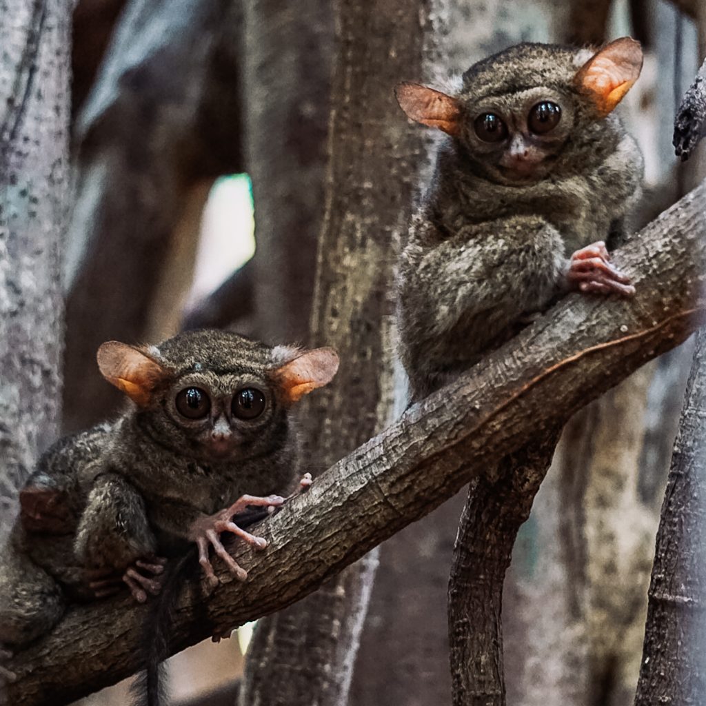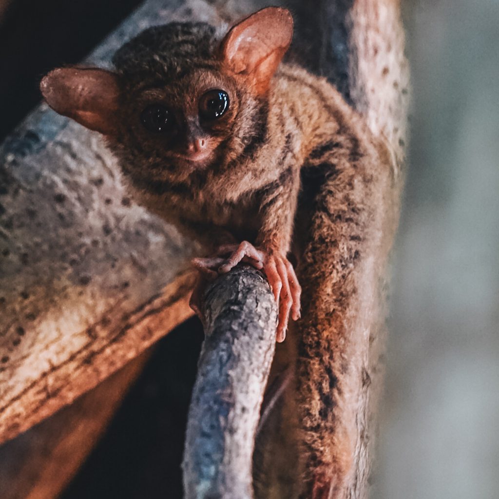 Irgendwann ziehen wir weiter und während wir einen großen und beeindruckenden Fikus-Baum bestaunen, fragt uns der Guide: „Have you seen the tasiers?“ – Ähm, nein. Ehrlicherweise haben wir den ganzen Tag noch nichts von alleine gespottet. Aber die Tasiere oder auch Koboldmakis wollen wir unbedingt sehen! Wir gehen um den Baum herum und kaum werfen wir einen Blick ins Innere des Baumes, schaut uns ein ganz kleiner, etwas verschlafener Koboldmaki entgegen. Zusammengekauert sitzt er keinen Meter von uns entfernt, seine Ohren sind eingeklappt und seine Augen leicht geöffnet. Wir sind sofort verliebt. Diese kleinen Kerlchen sind einfach zu niedlich.
